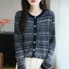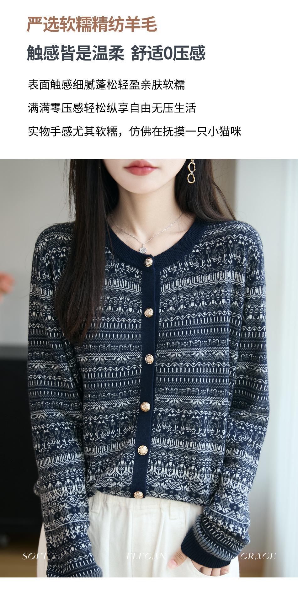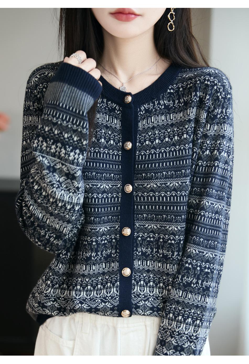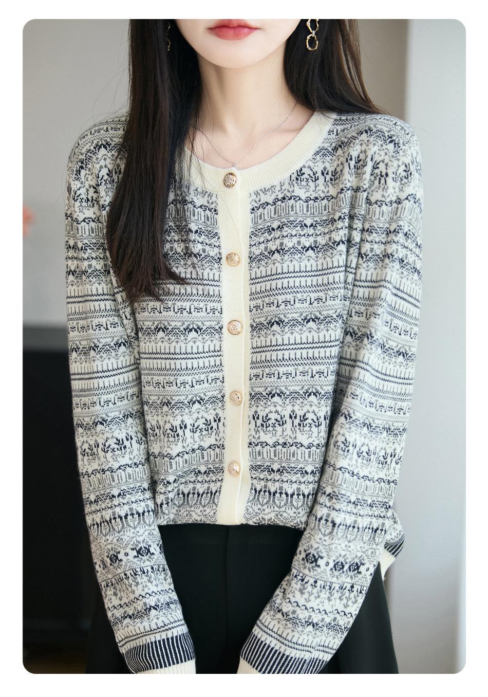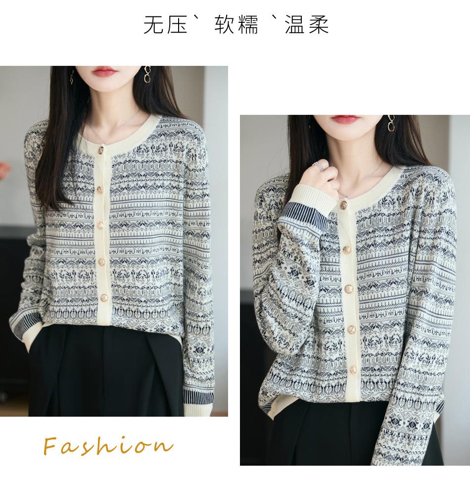 Cárdigan de Punto de Lana Merino Fina de Otoño Temprano 2025 con Cuello Redondo y Manga Larga para Mujer, Temperamento, Jacquard, Holgado, Top Exterior