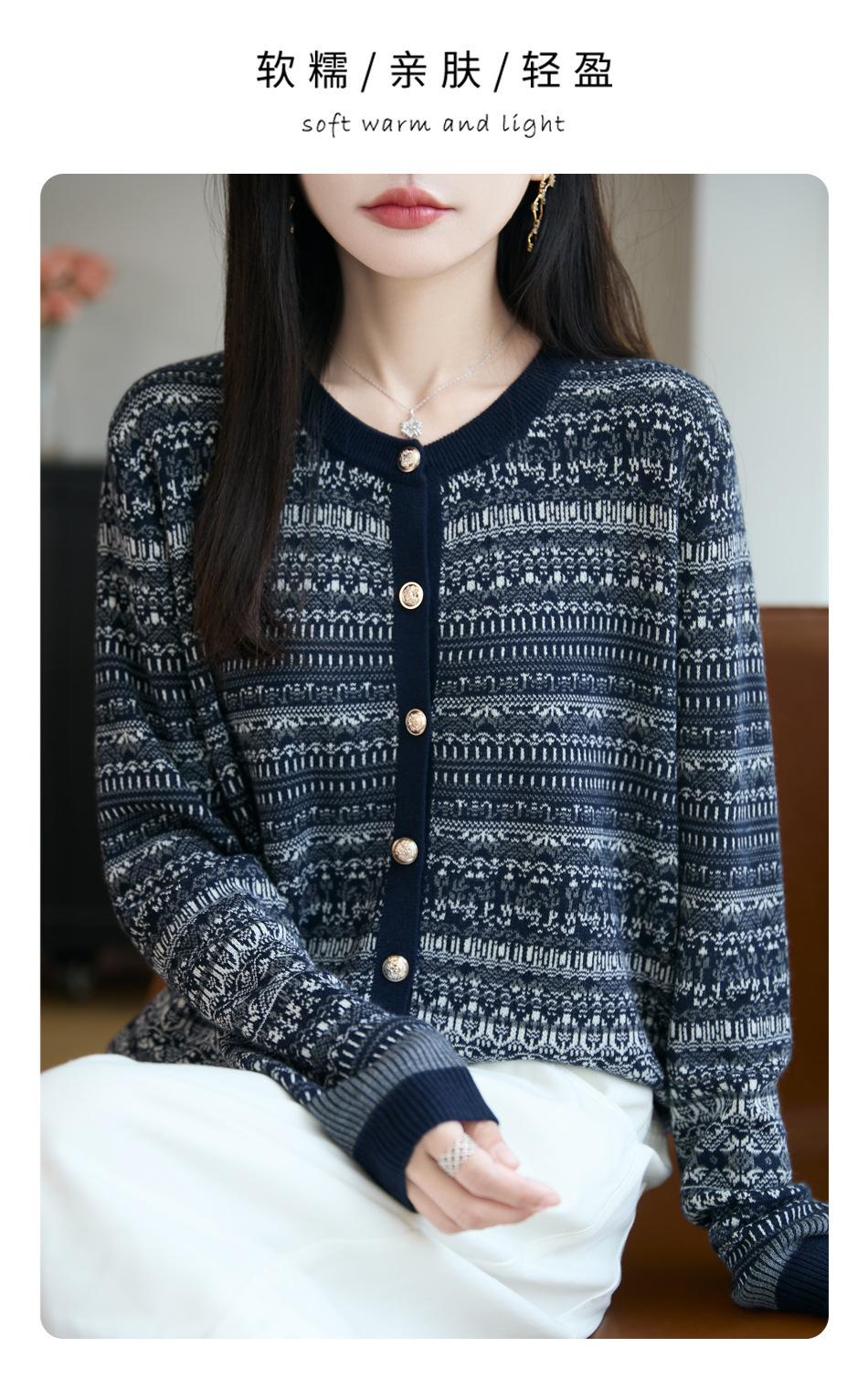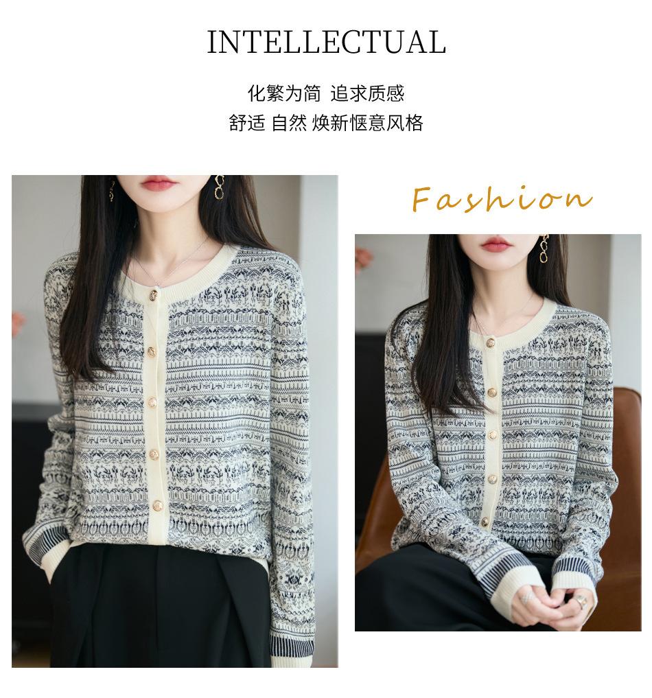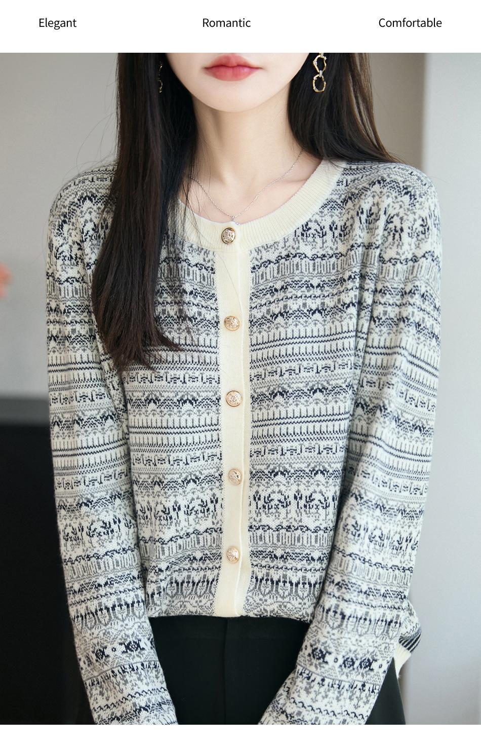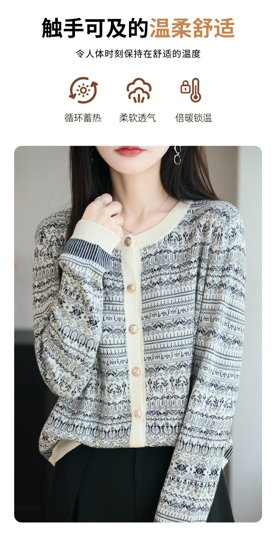 Cárdigan de Punto de Lana Merino Fina de Otoño Temprano 2025 con Cuello Redondo y Manga Larga para Mujer, Temperamento, Jacquard, Holgado, Top Exterior