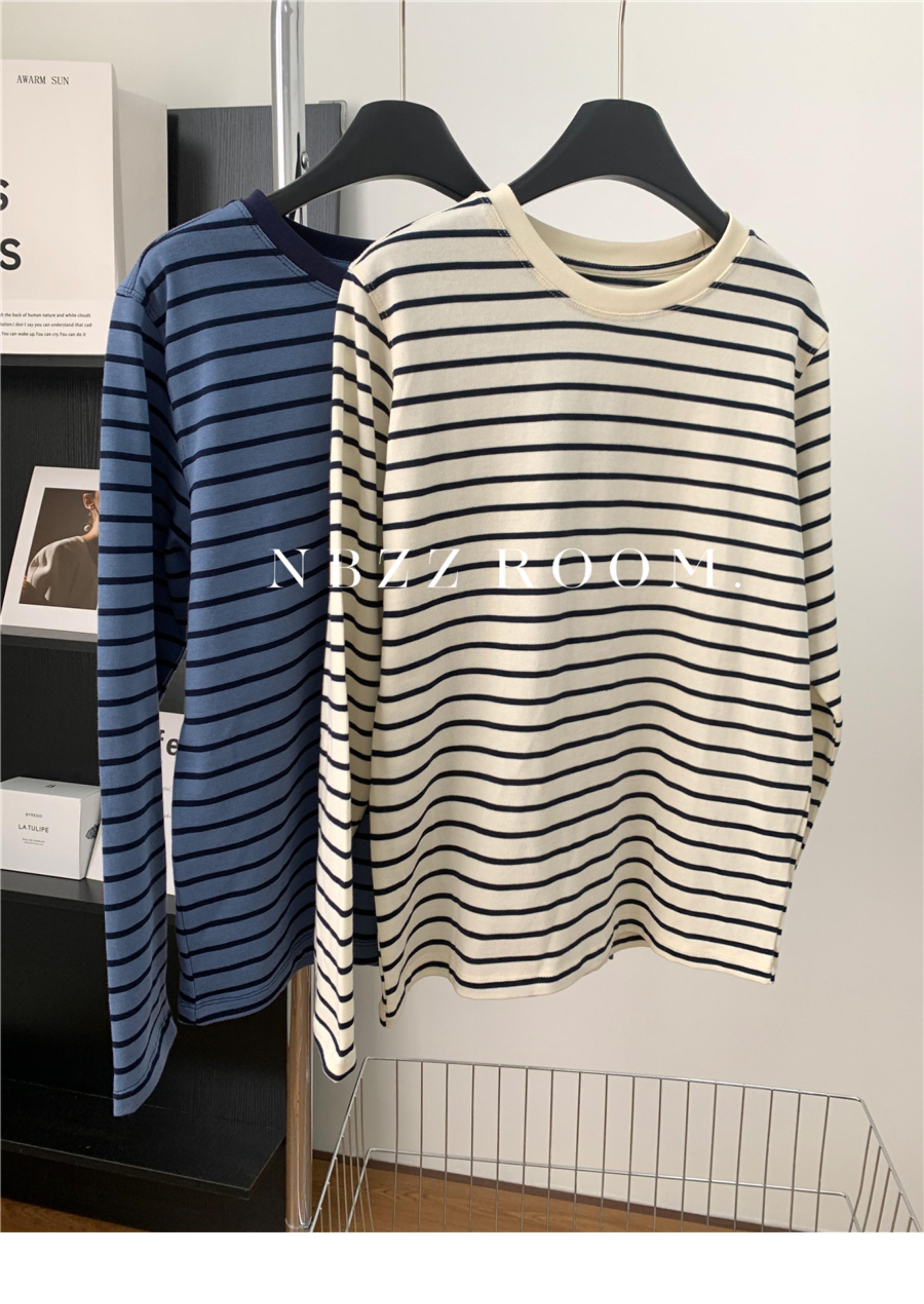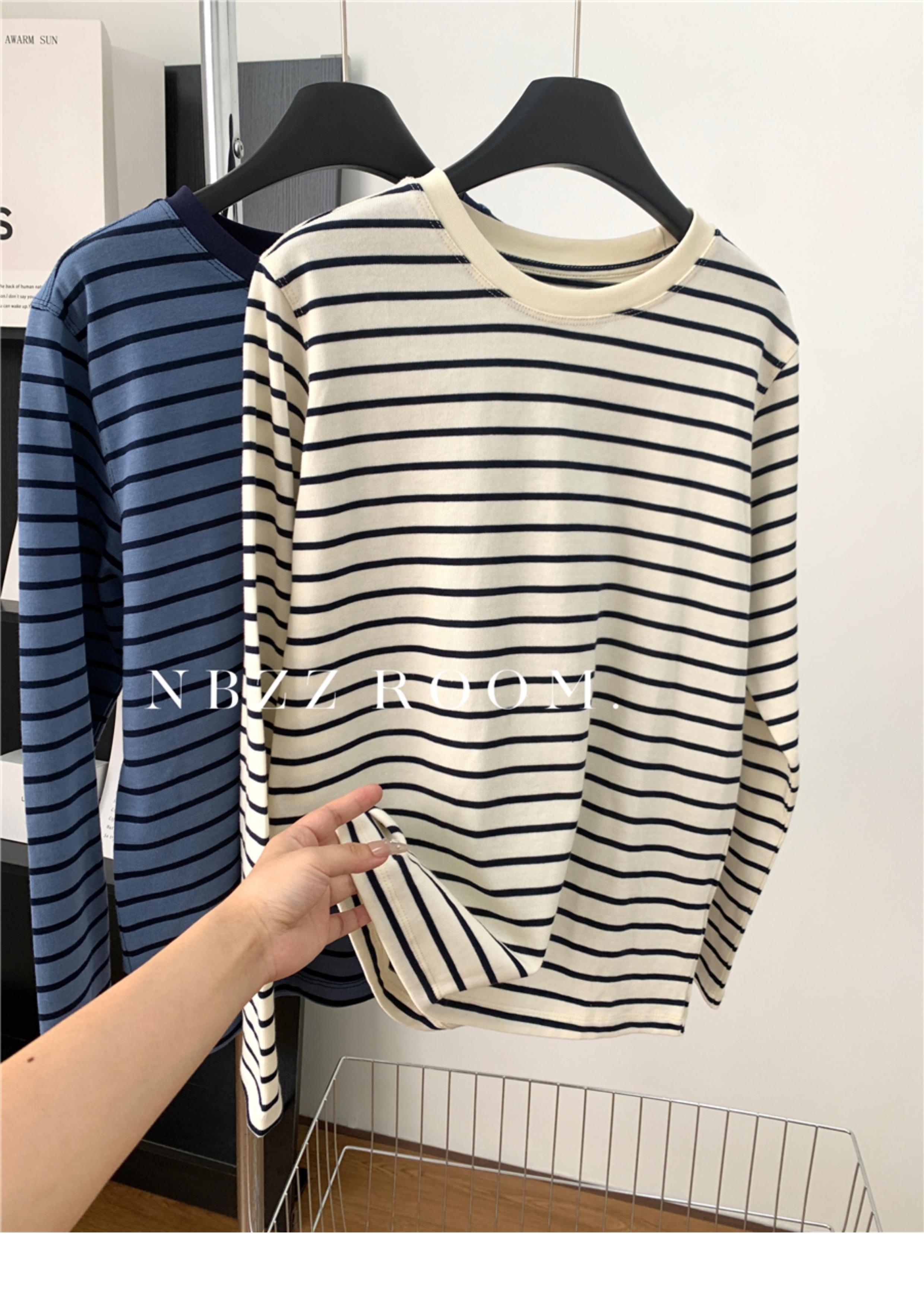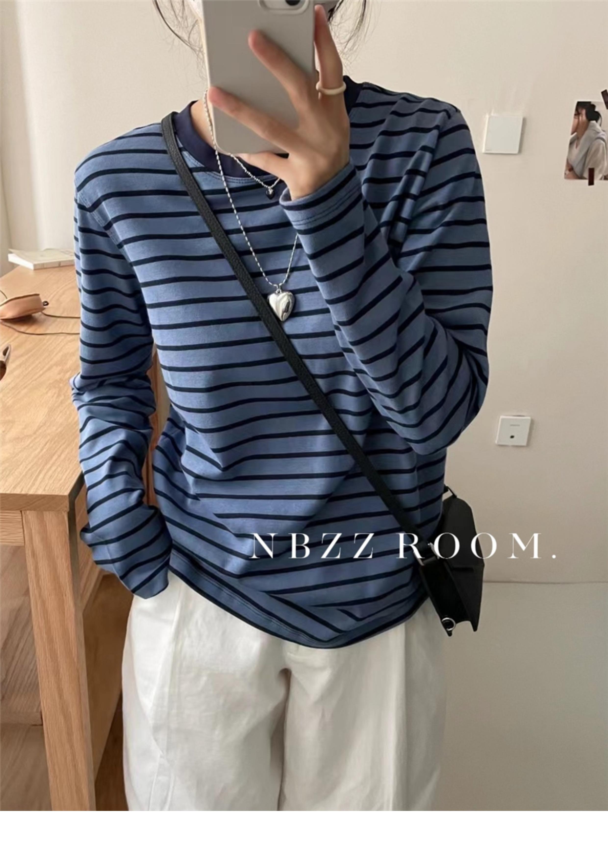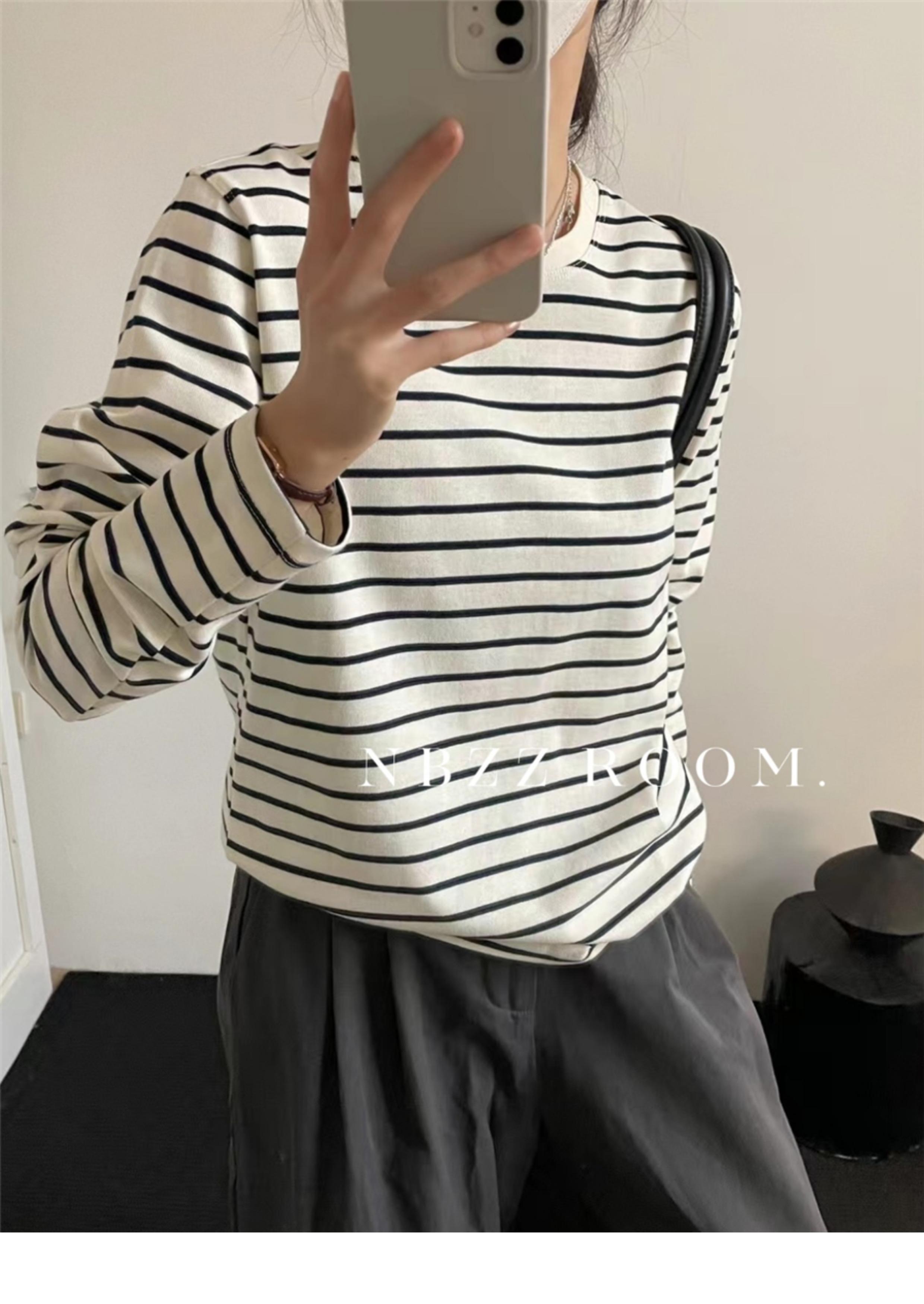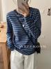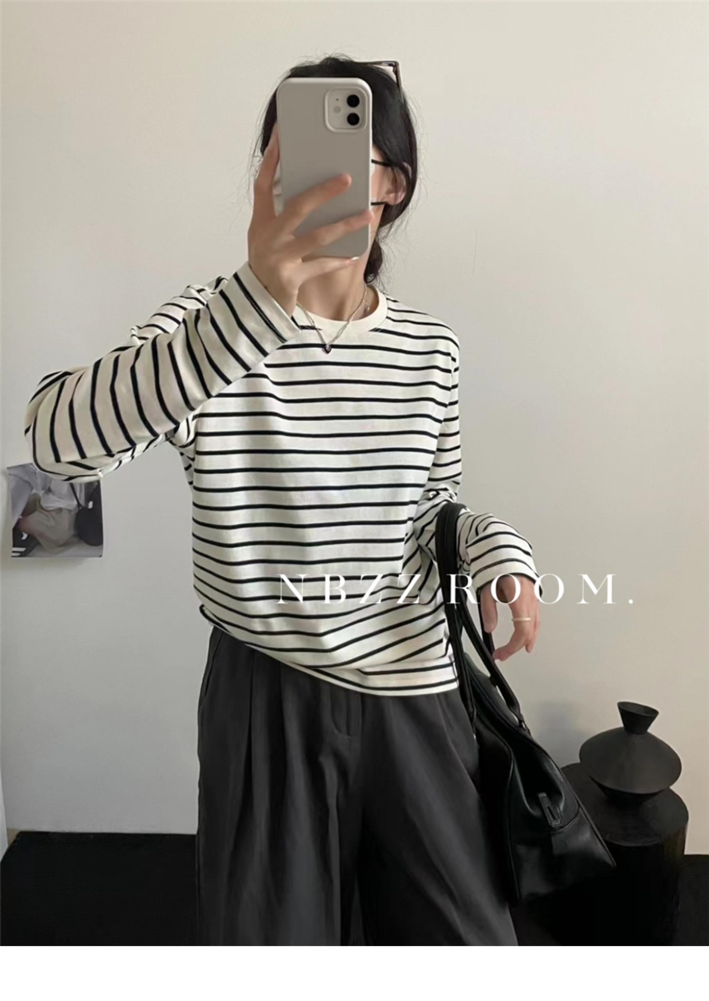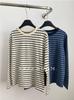 2024 Otoño e Invierno/Estilo Retro Occidental Camiseta de Manga Larga a Rayas de Color en Contraste para Mujer Coreana Casual Suelta Cuello Redondo Camiseta Básica Top