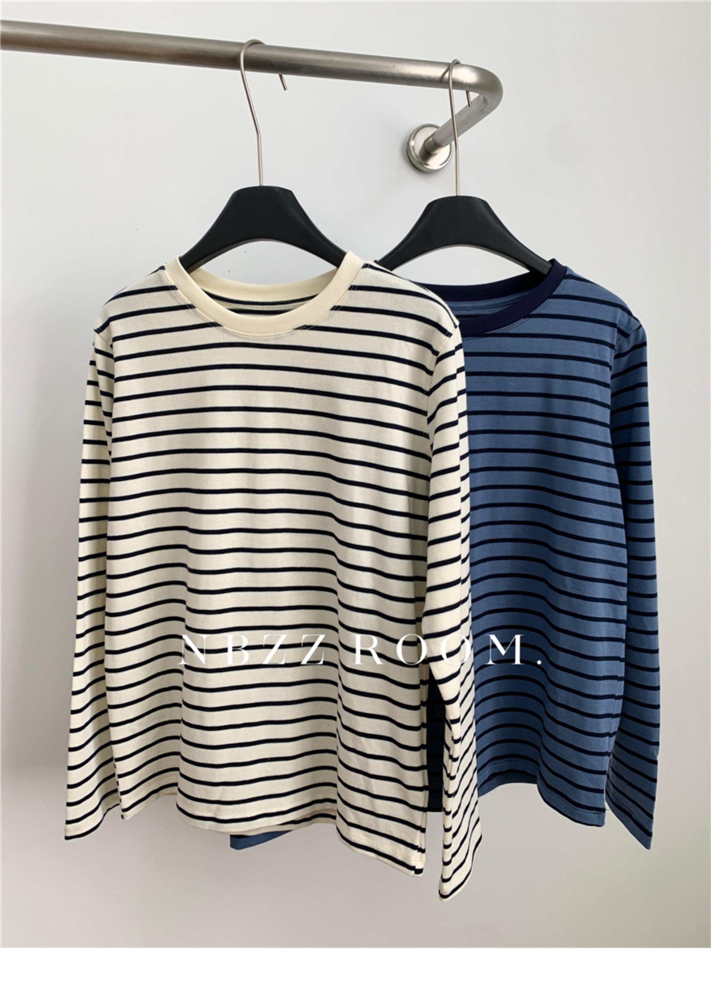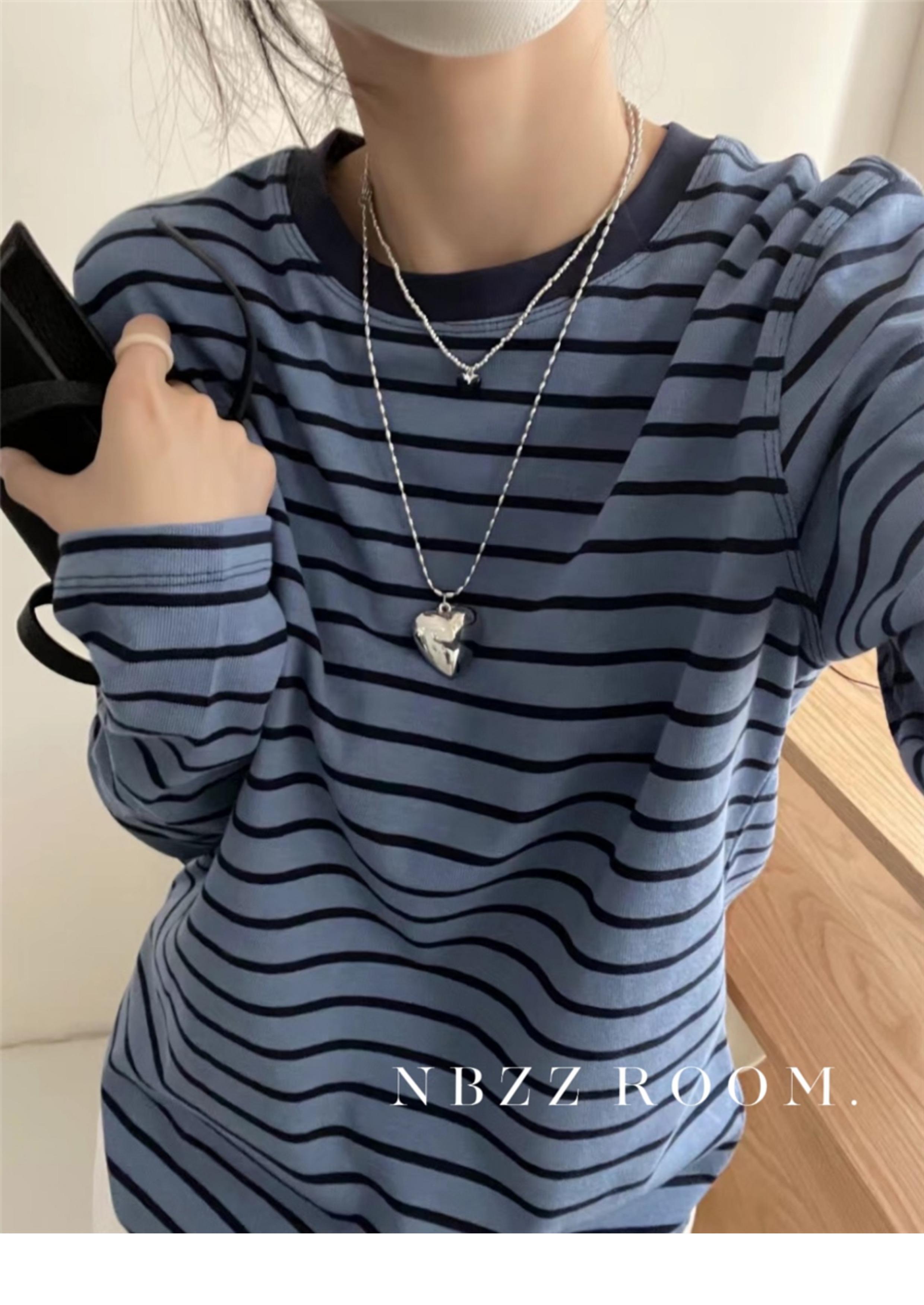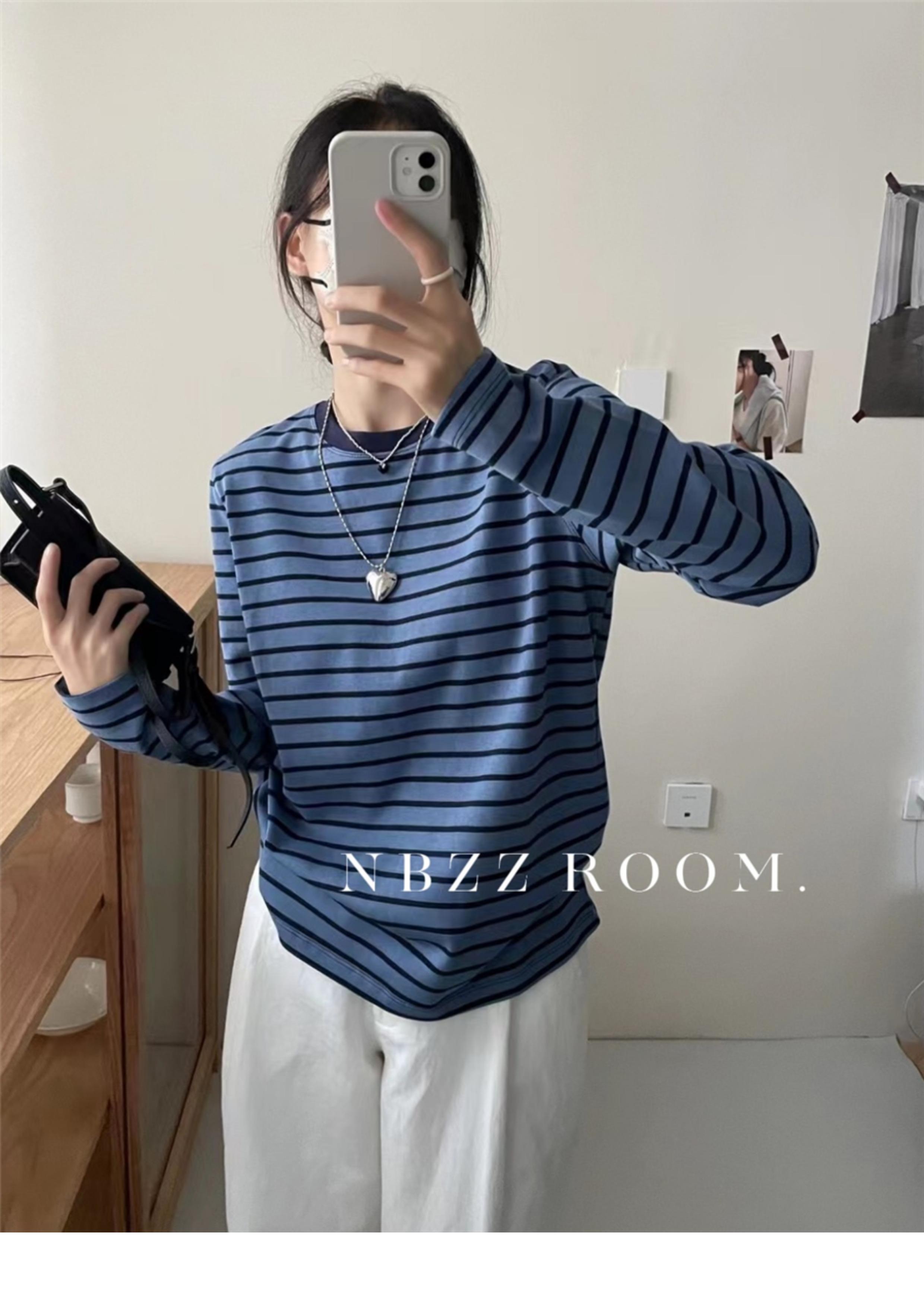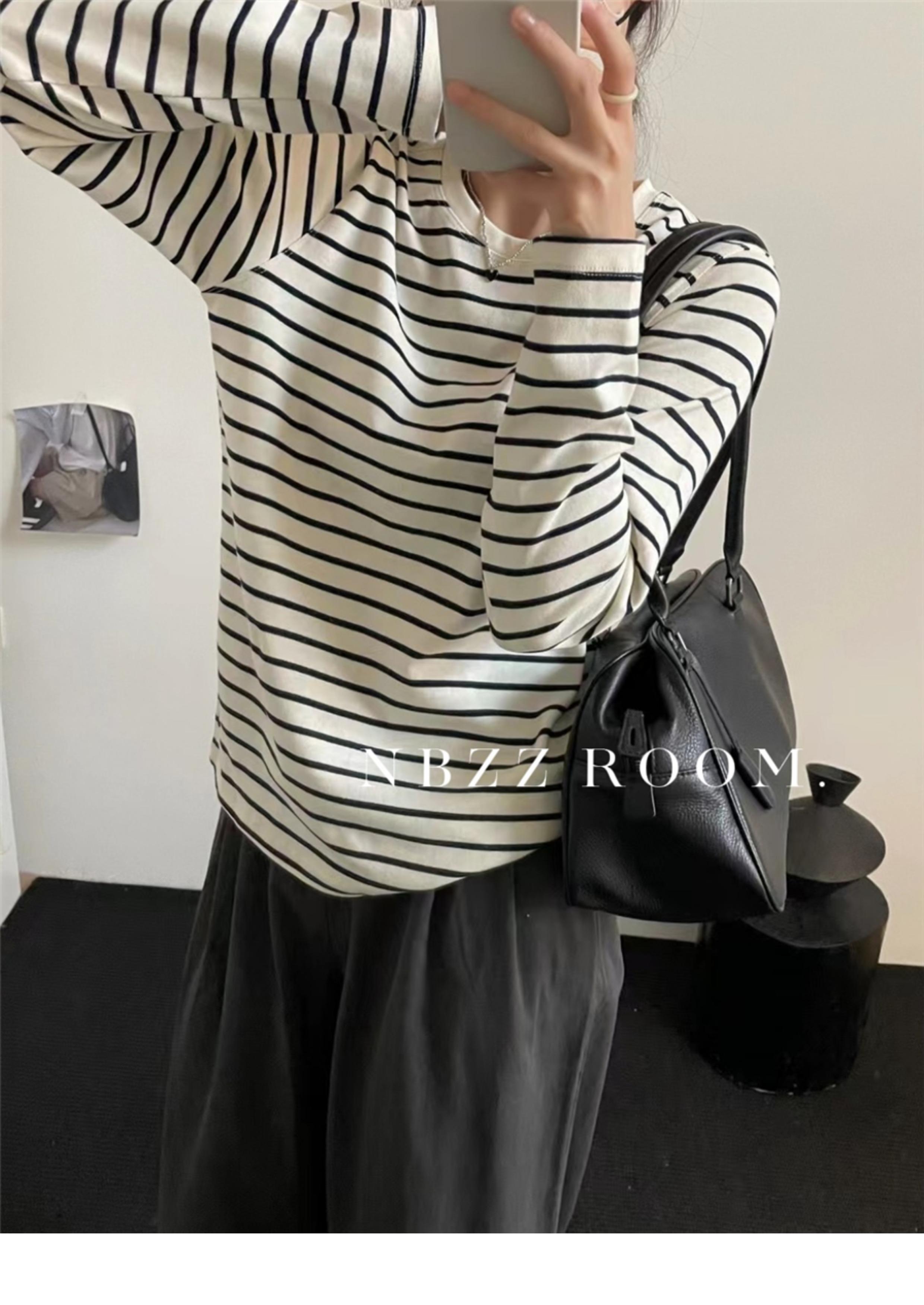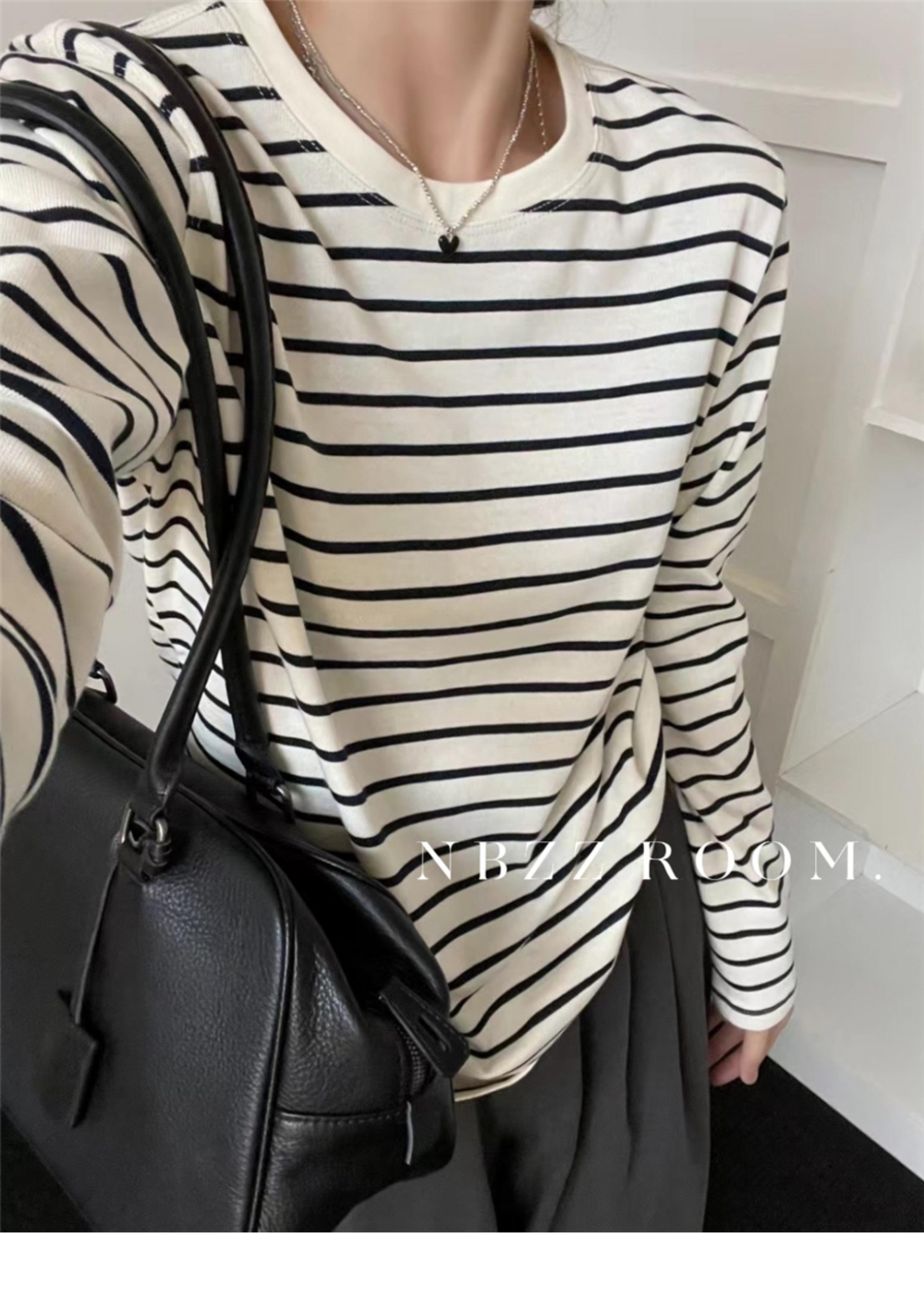 2024 Otoño e Invierno/Estilo Retro Occidental Camiseta de Manga Larga a Rayas de Color en Contraste para Mujer Coreana Casual Suelta Cuello Redondo Camiseta Básica Top