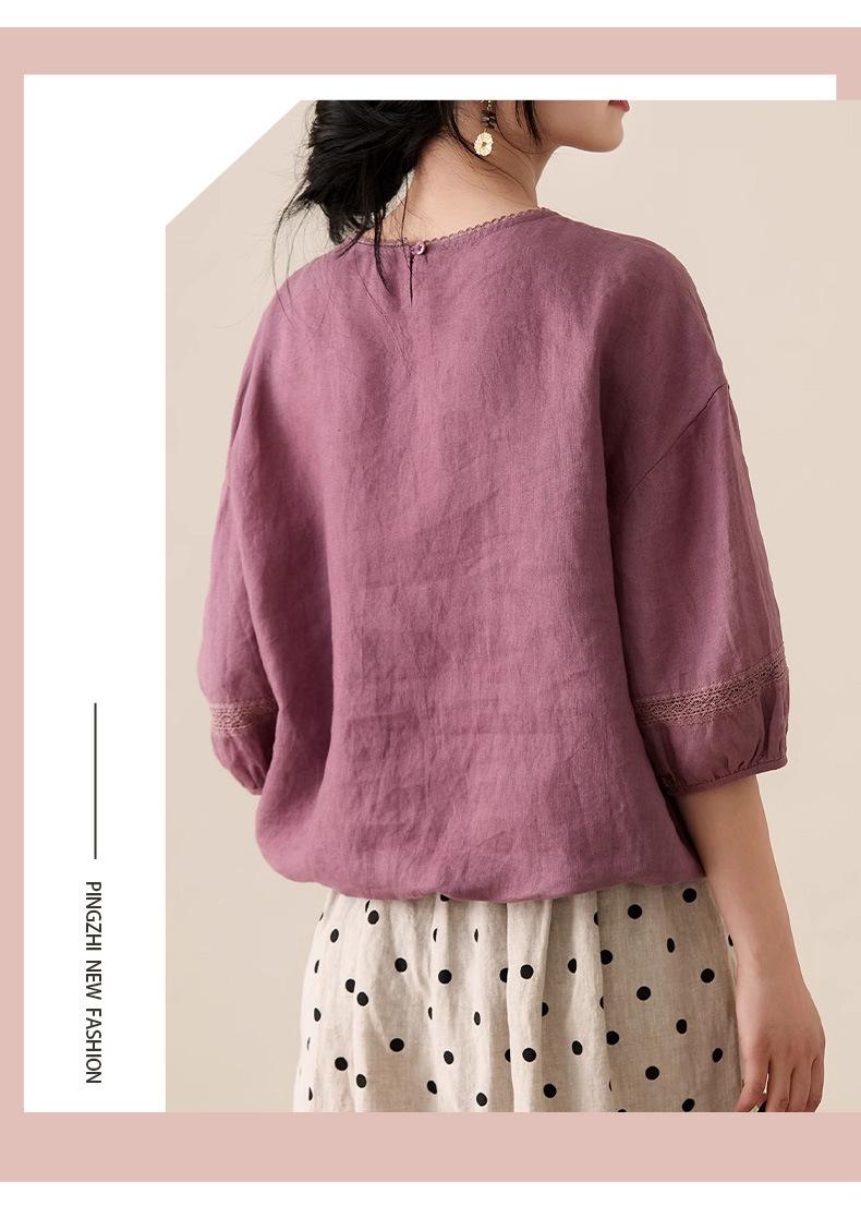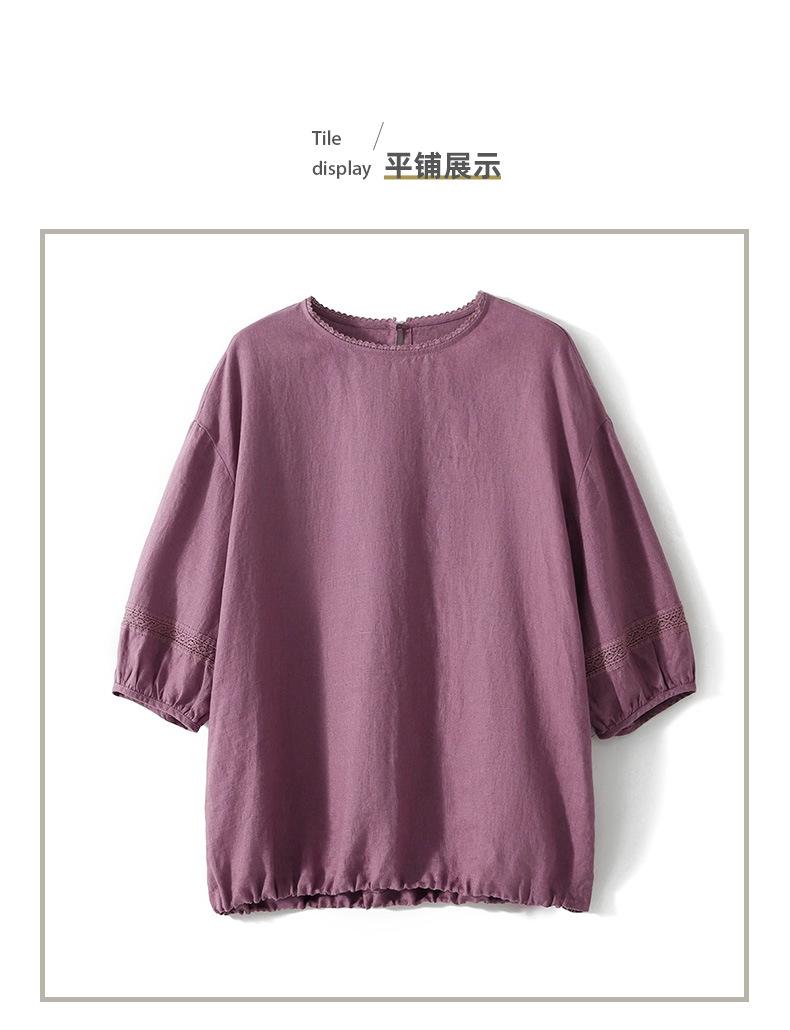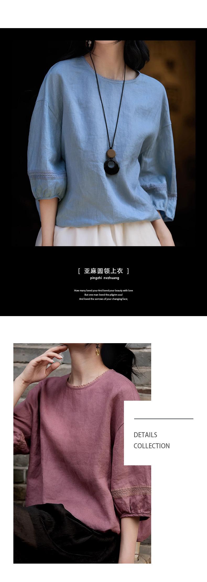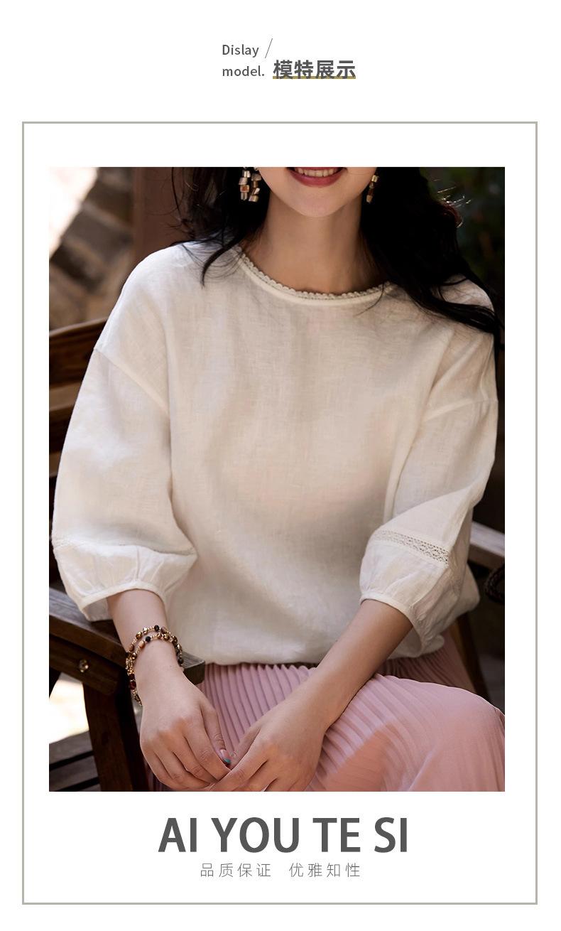 Camiseta pequeña de lino fresco y suave con arte, manga abullonada siete, cuello redondo, top, camiseta, ropa nueva de verano para mujer 2025