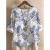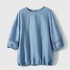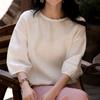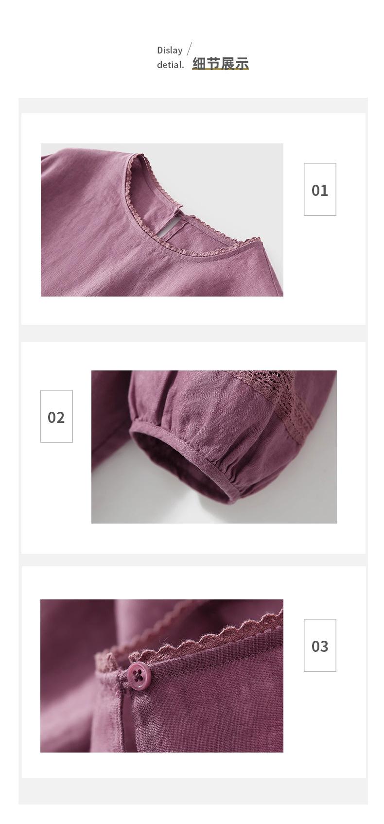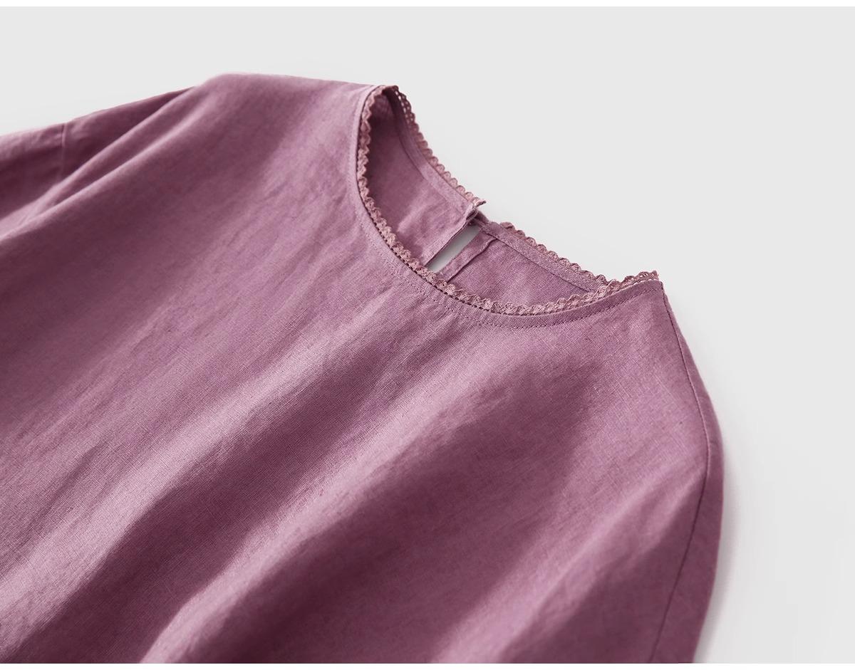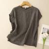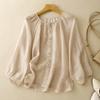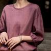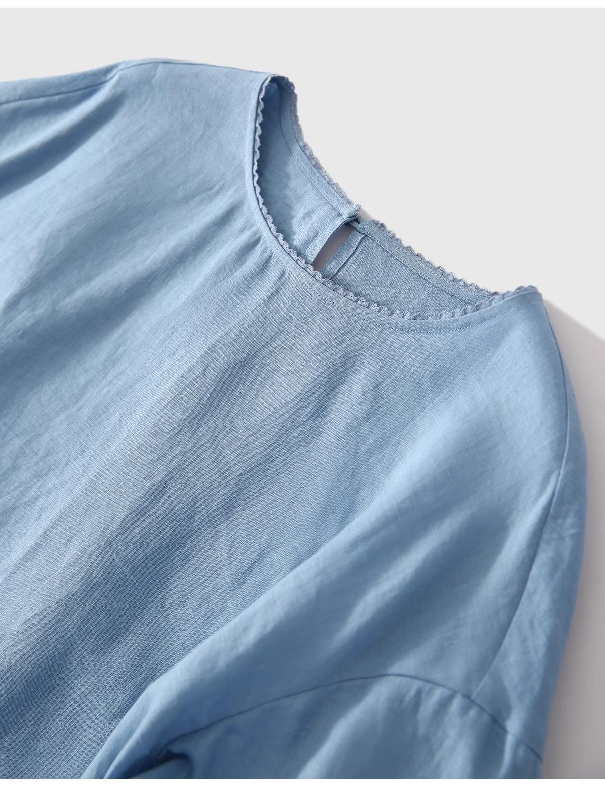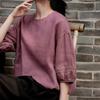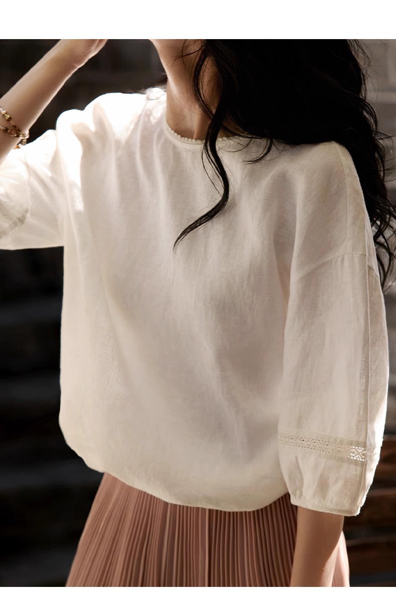 Camiseta pequeña de lino fresco y suave con arte, manga abullonada siete, cuello redondo, top, camiseta, ropa nueva de verano para mujer 2025