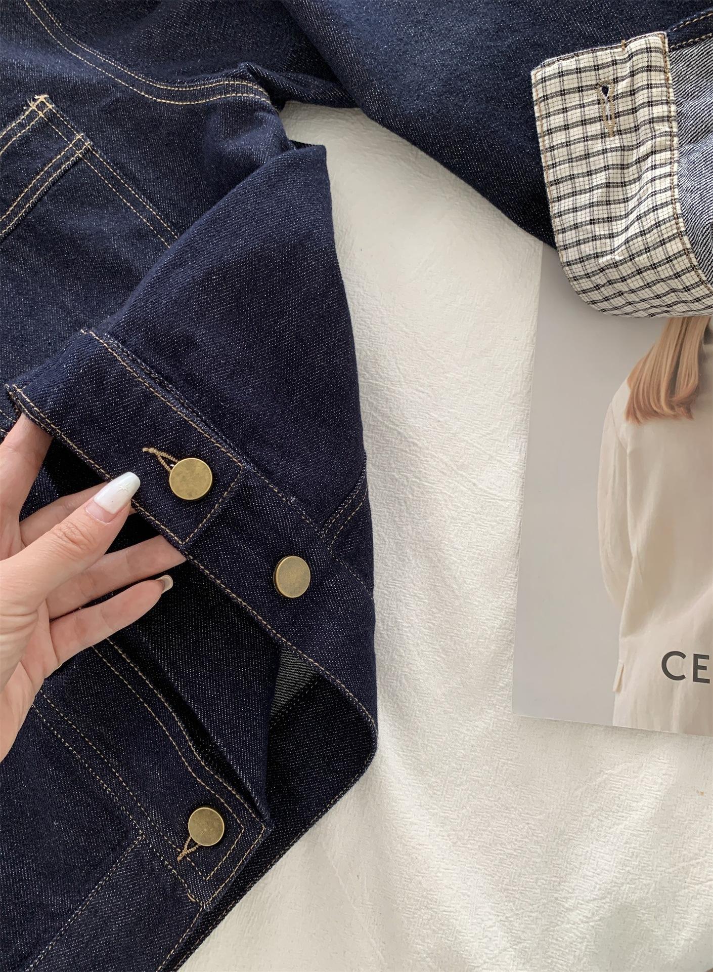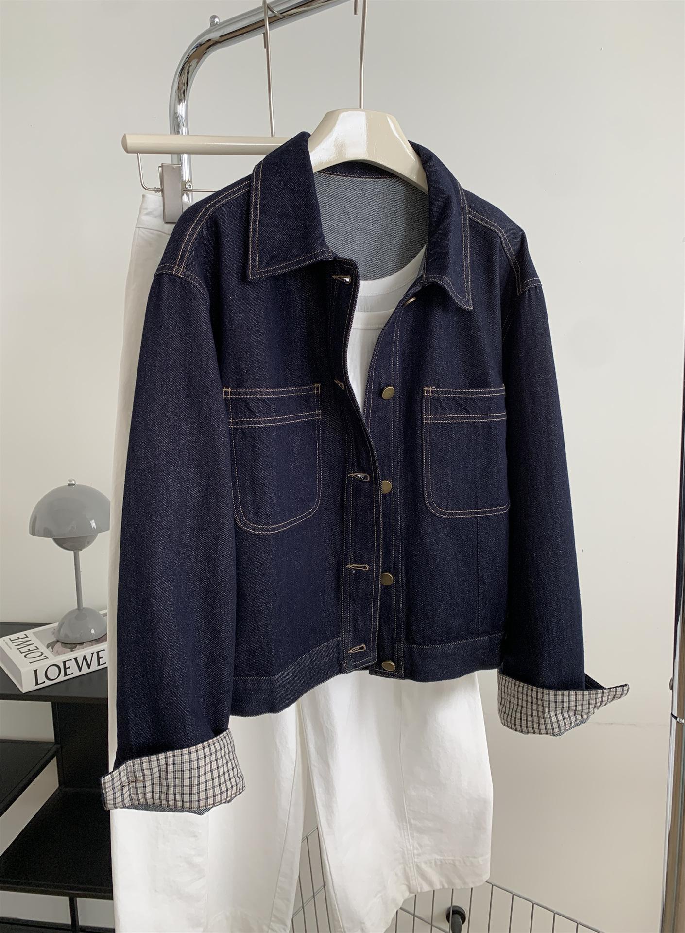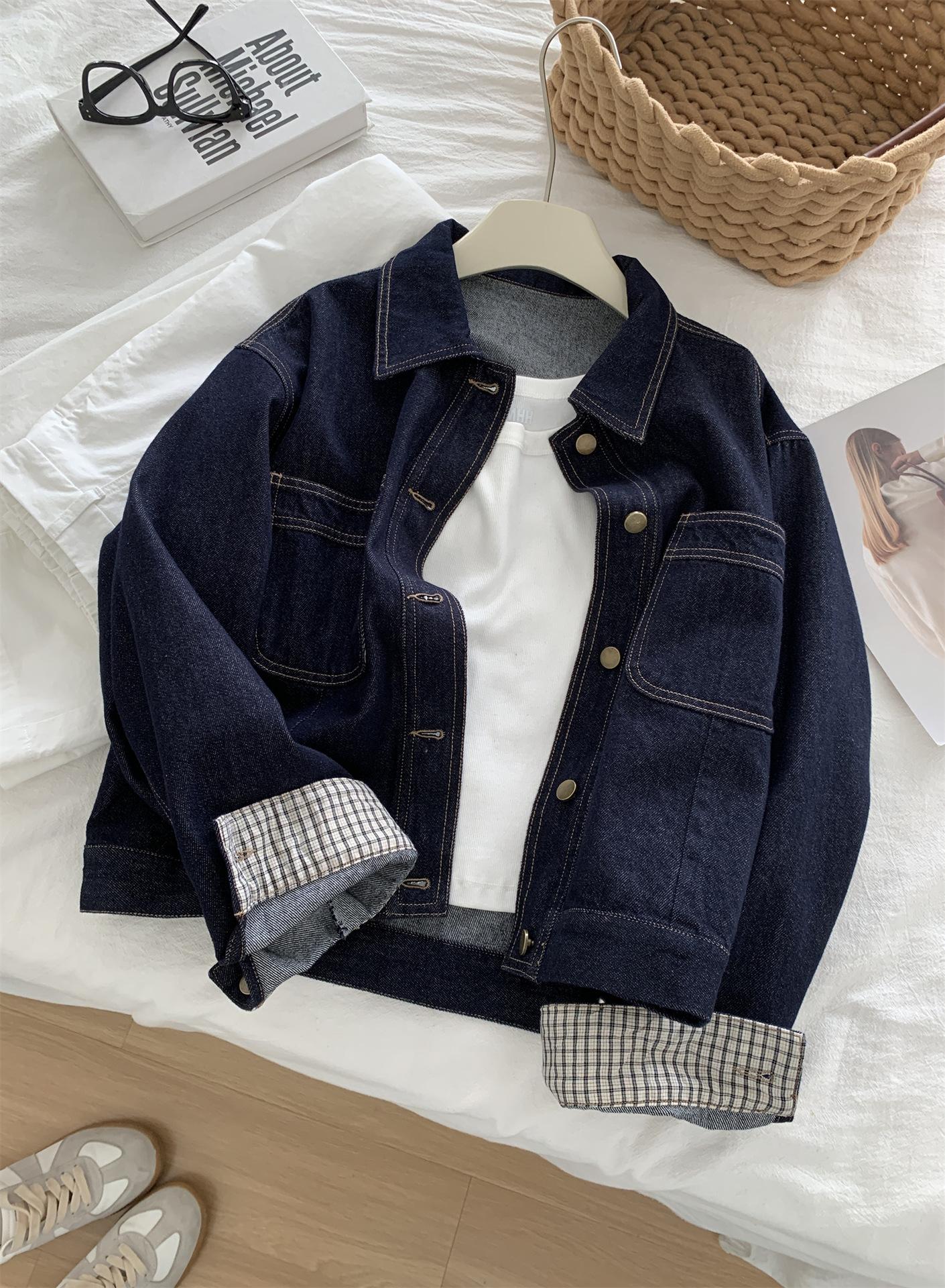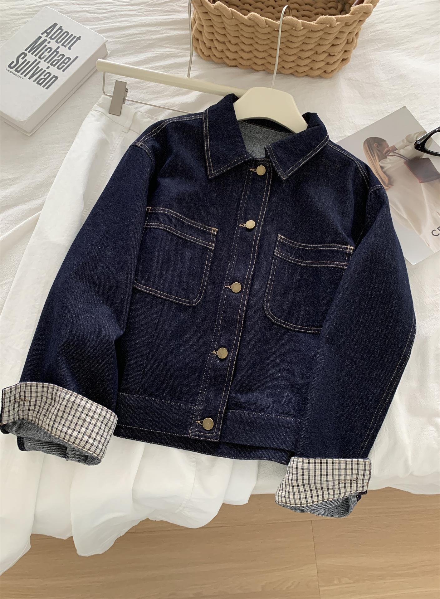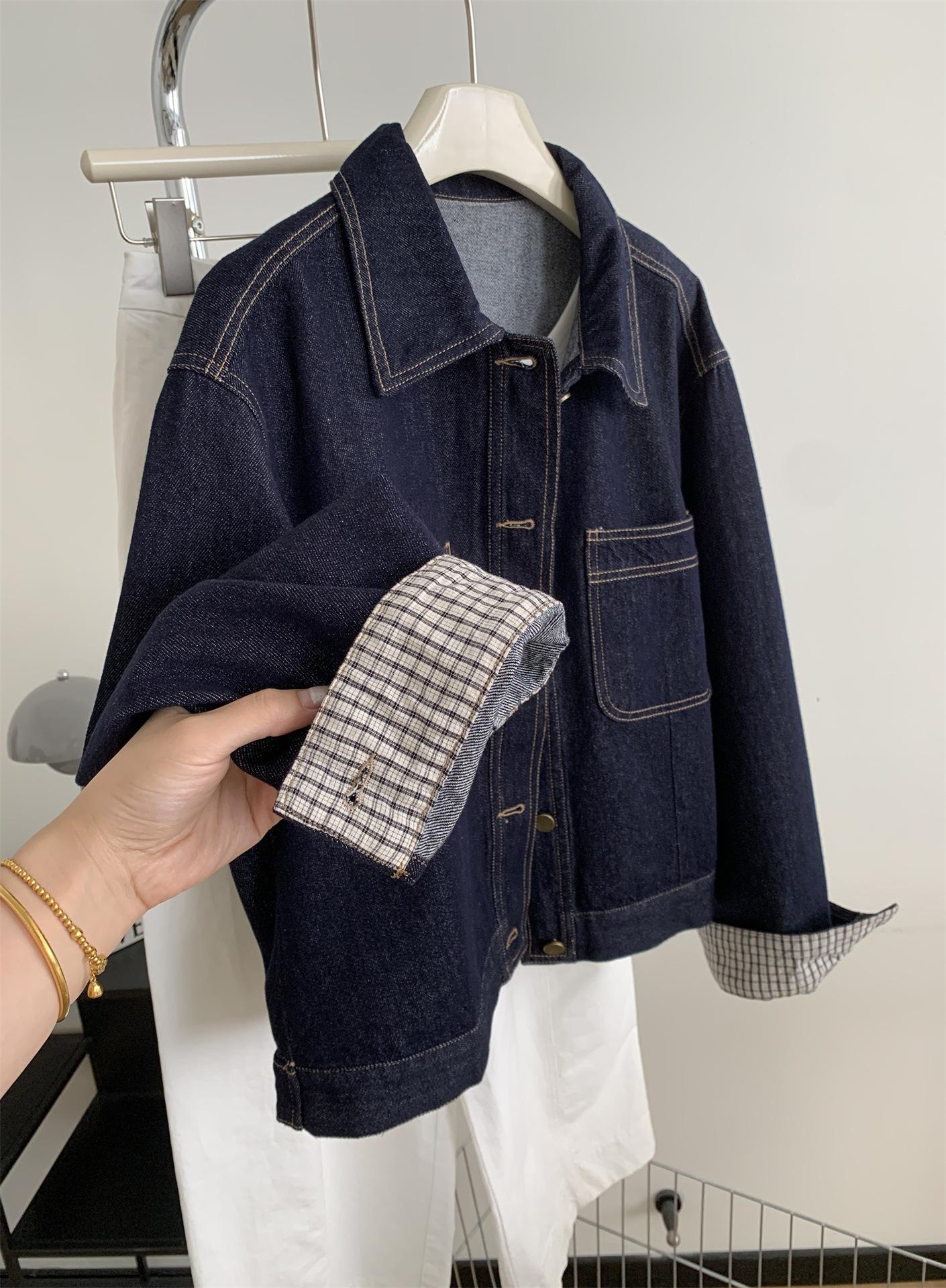 Chaqueta de mezclilla de peso pesado azul lavado retro con manga a cuadros para mujer, holgada, estilo coreano, petite, cuello vuelto, top corto, otoño