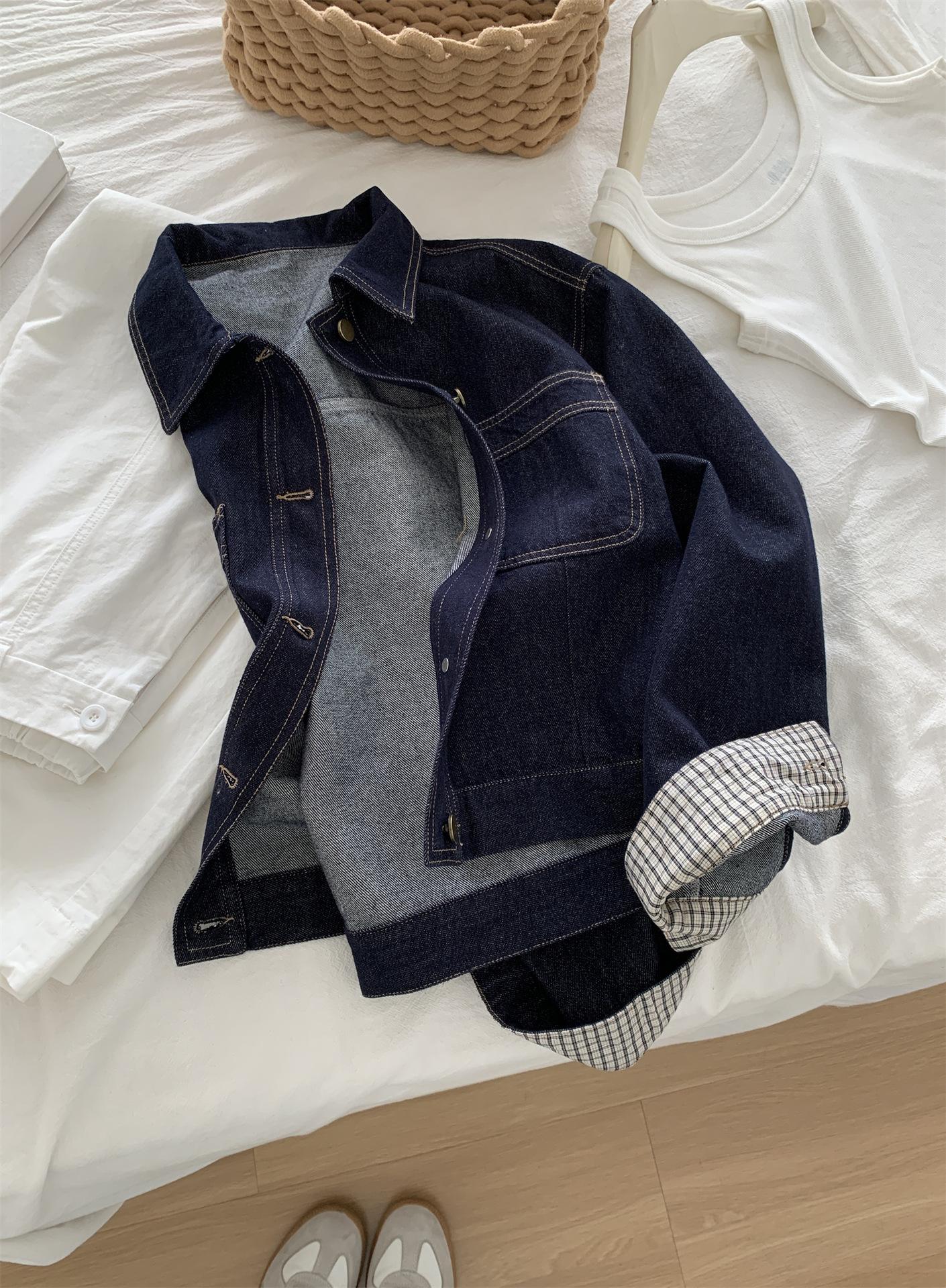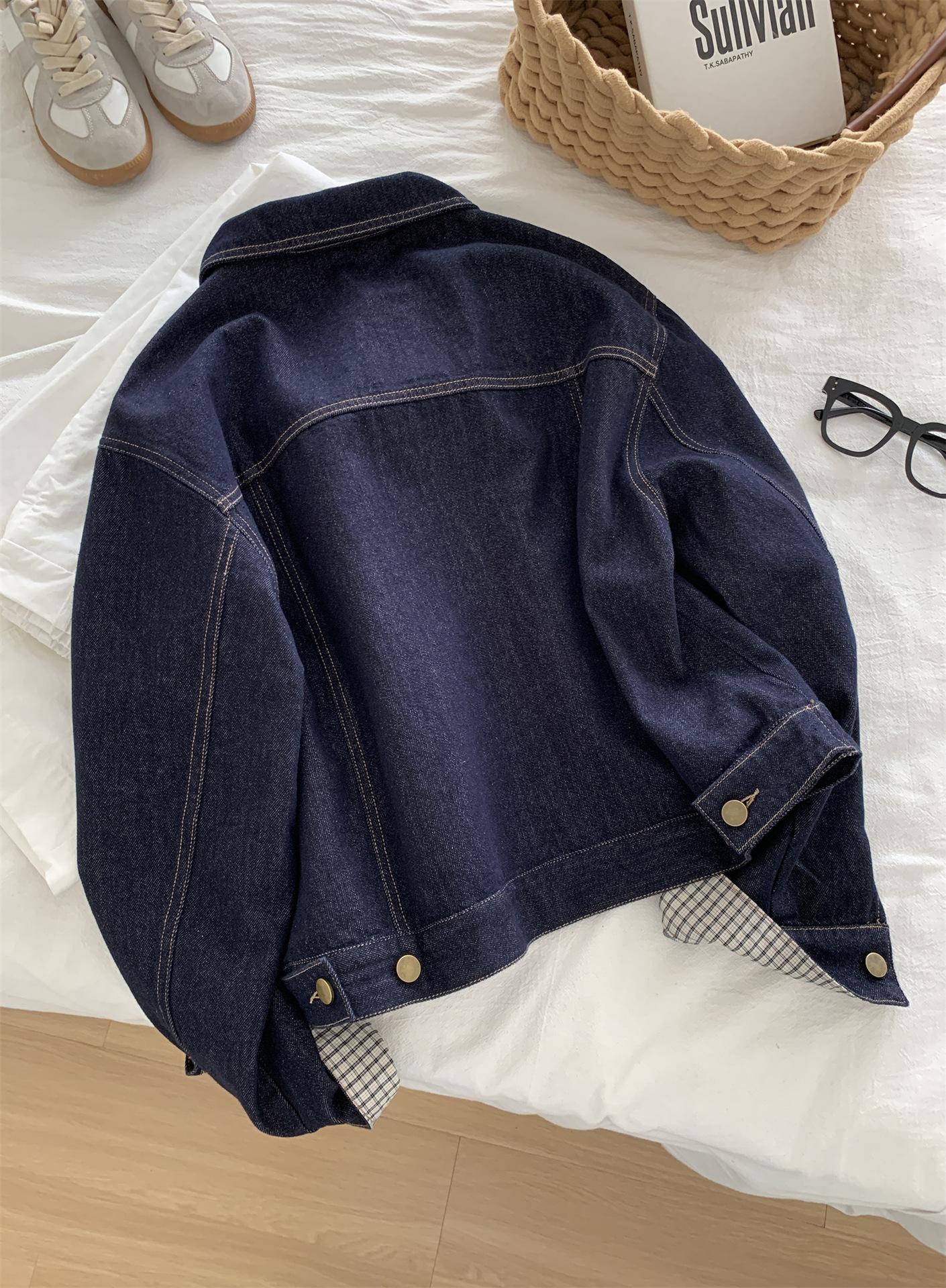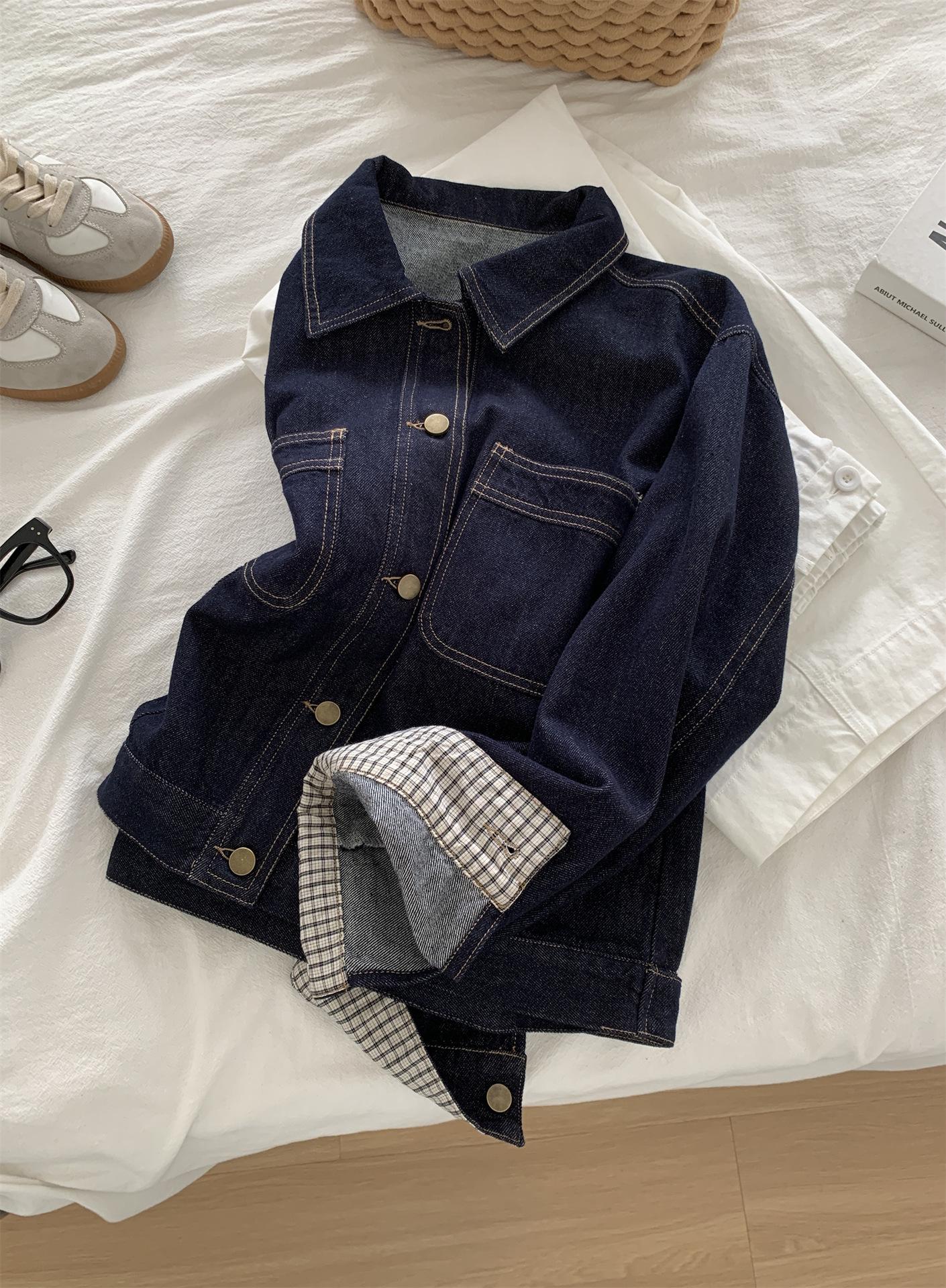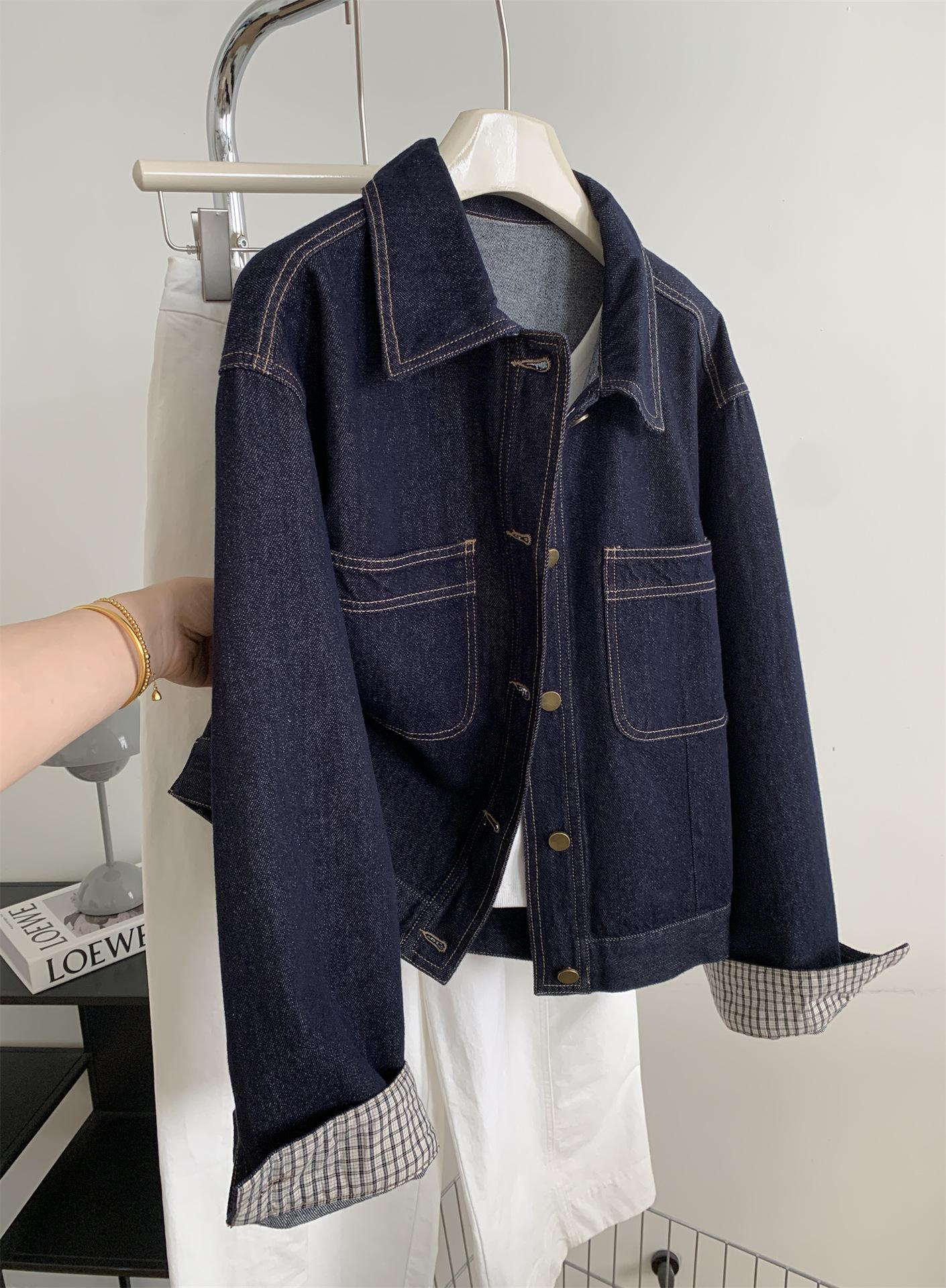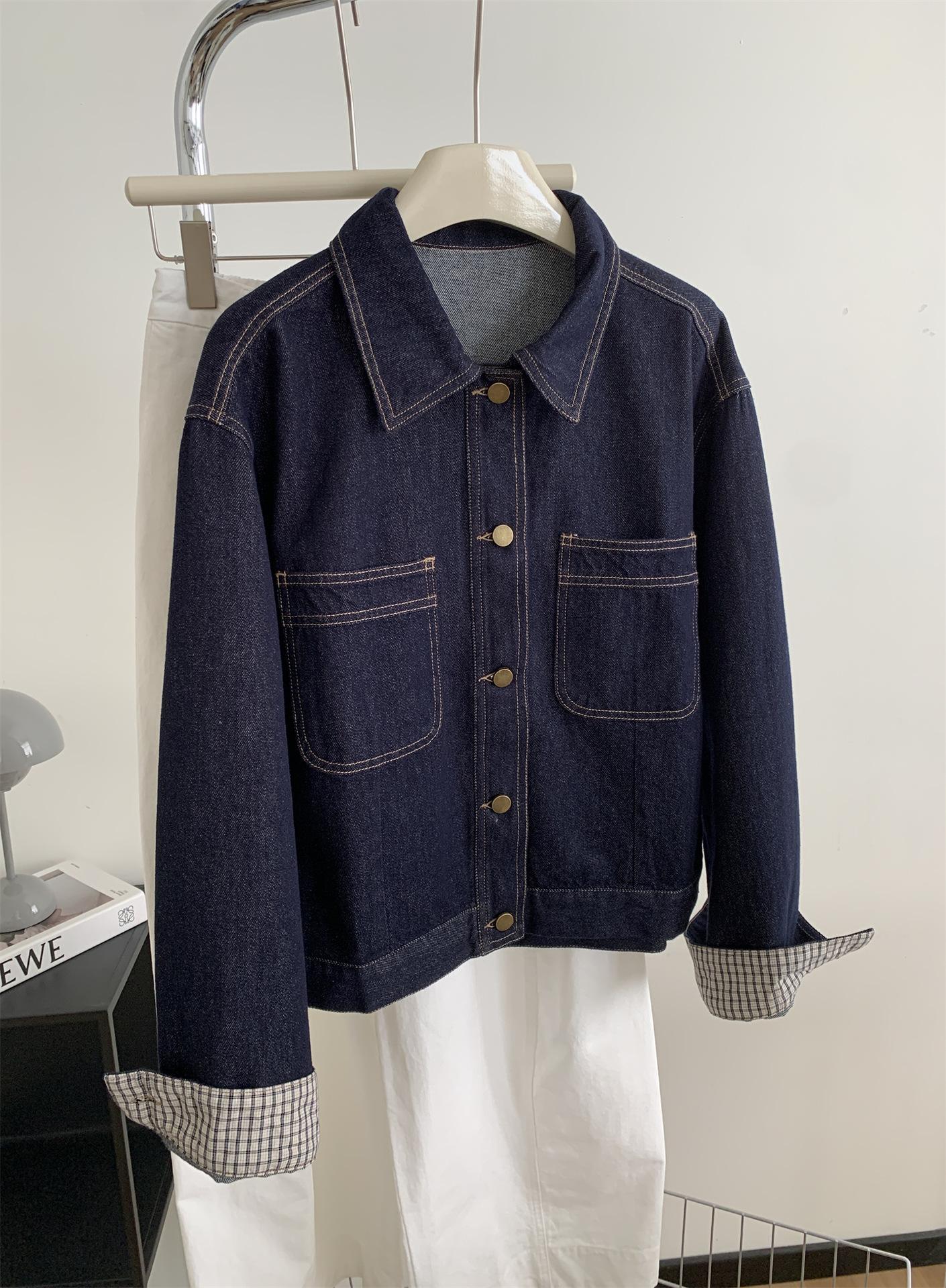 Chaqueta de mezclilla de peso pesado azul lavado retro con manga a cuadros para mujer, holgada, estilo coreano, petite, cuello vuelto, top corto, otoño