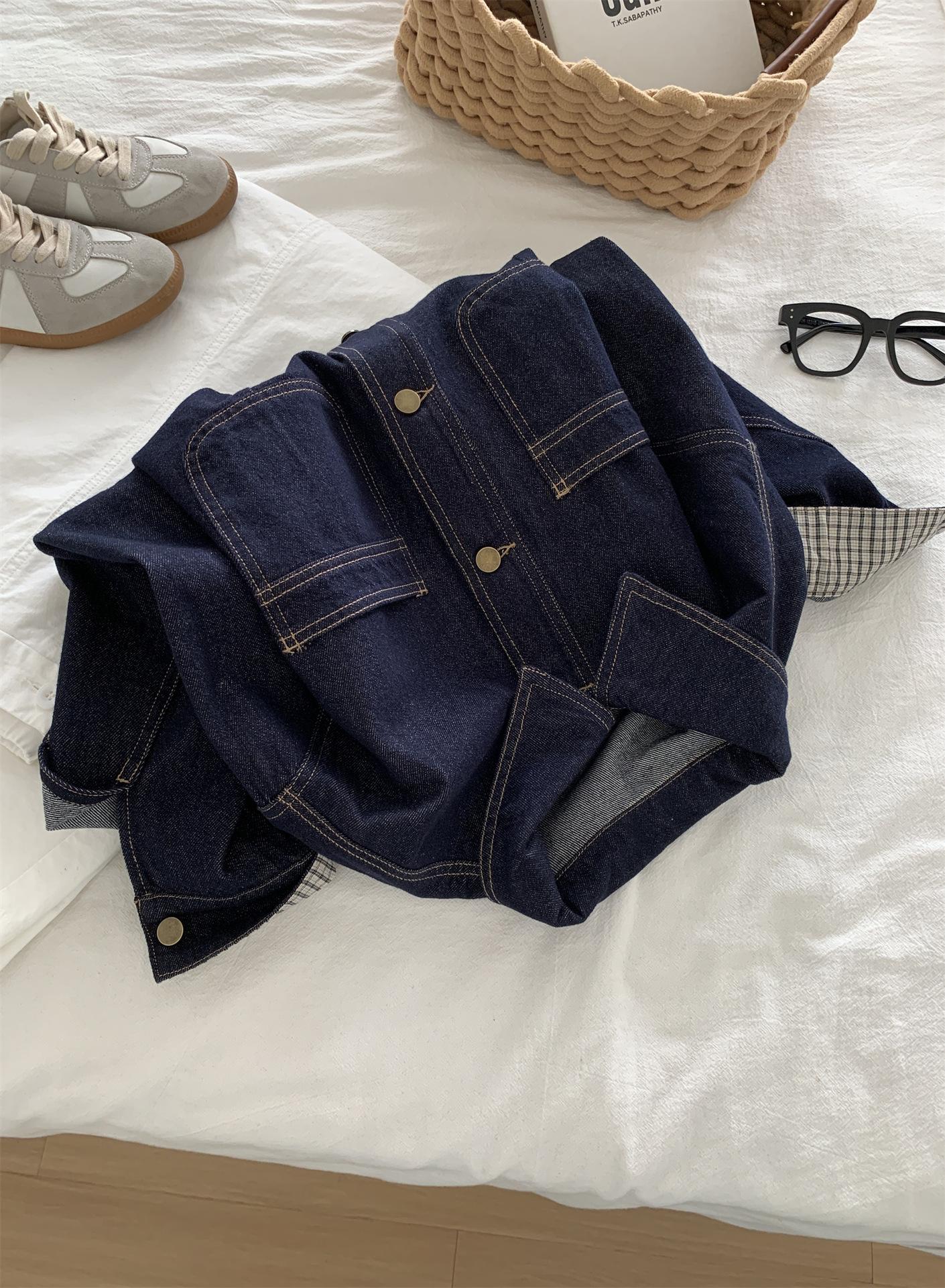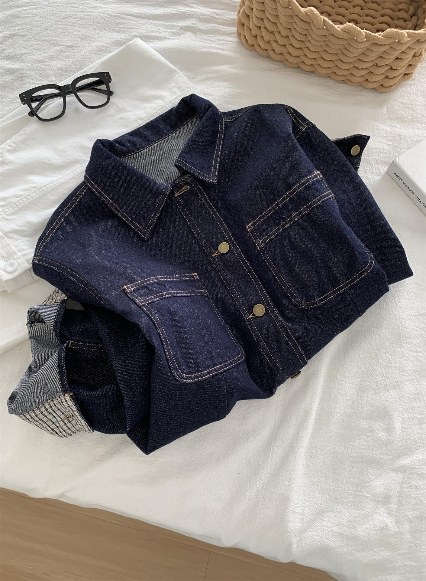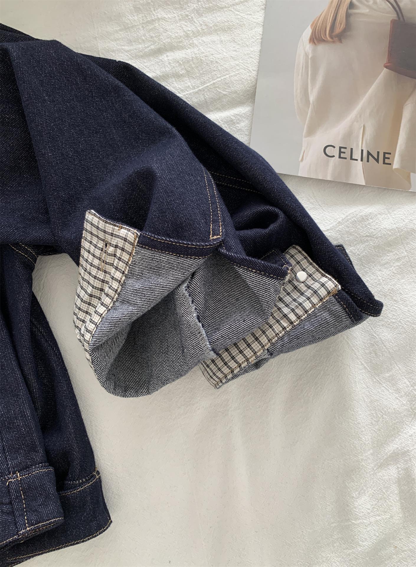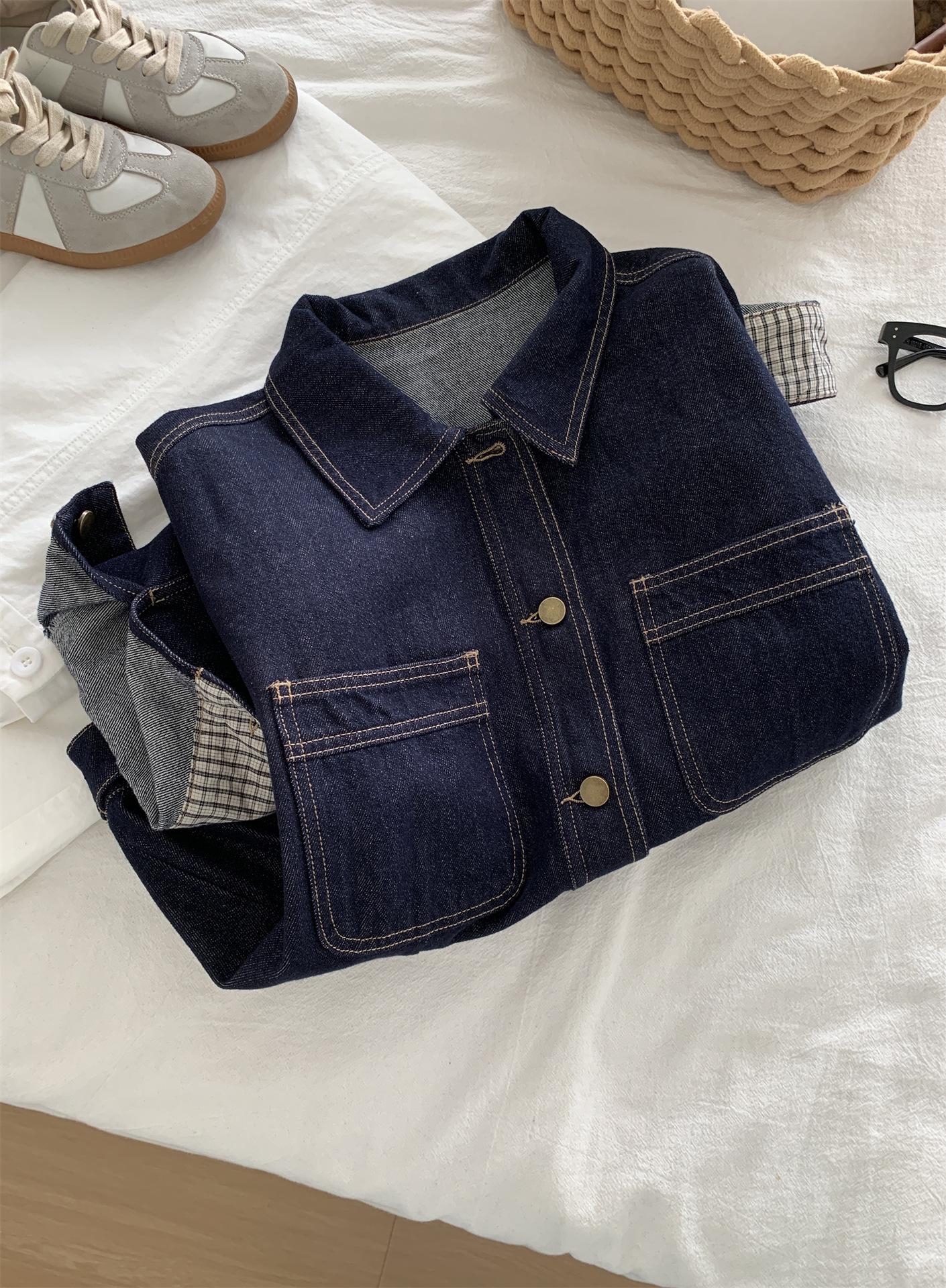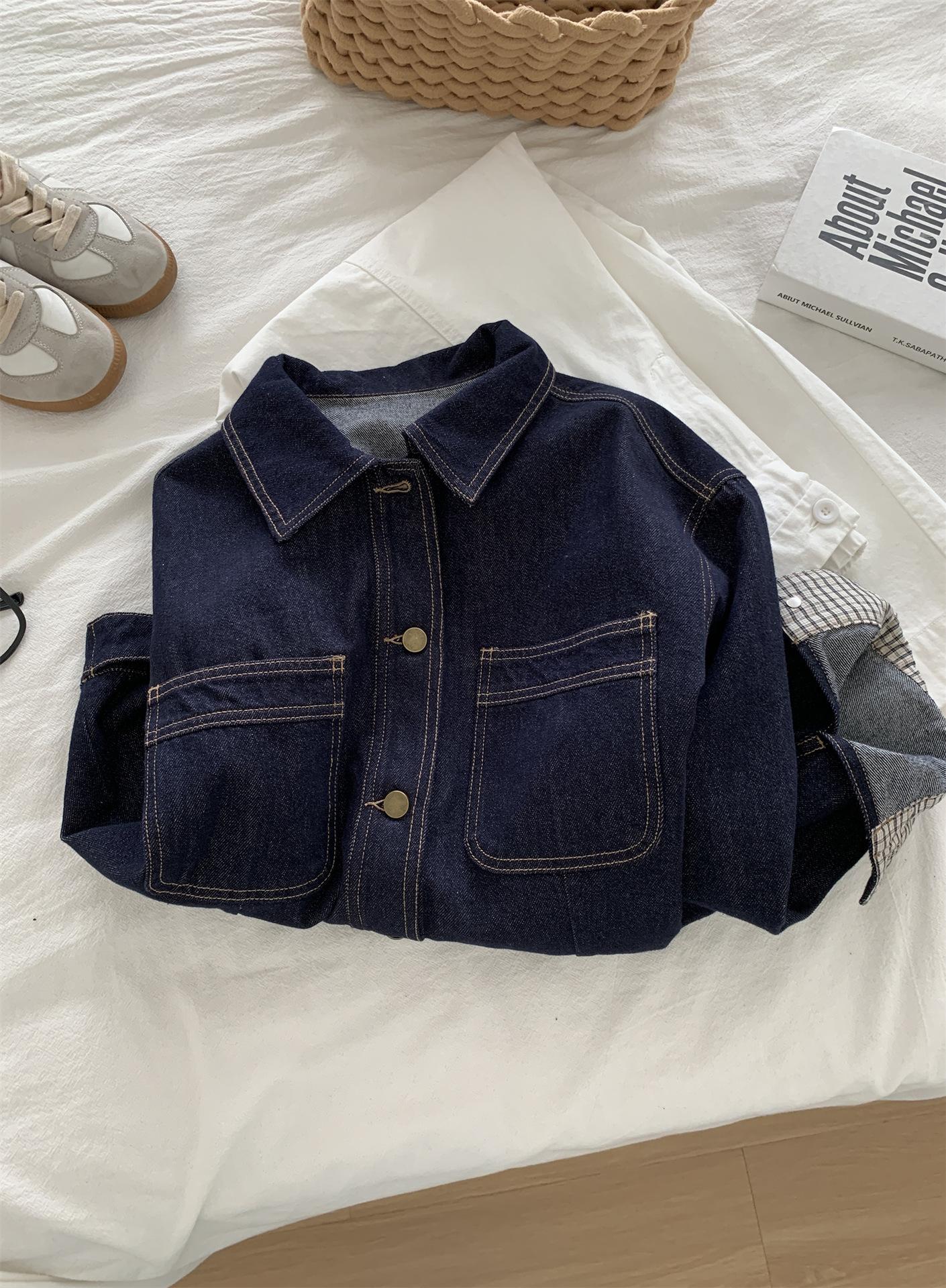 Chaqueta de mezclilla de peso pesado azul lavado retro con manga a cuadros para mujer, holgada, estilo coreano, petite, cuello vuelto, top corto, otoño