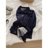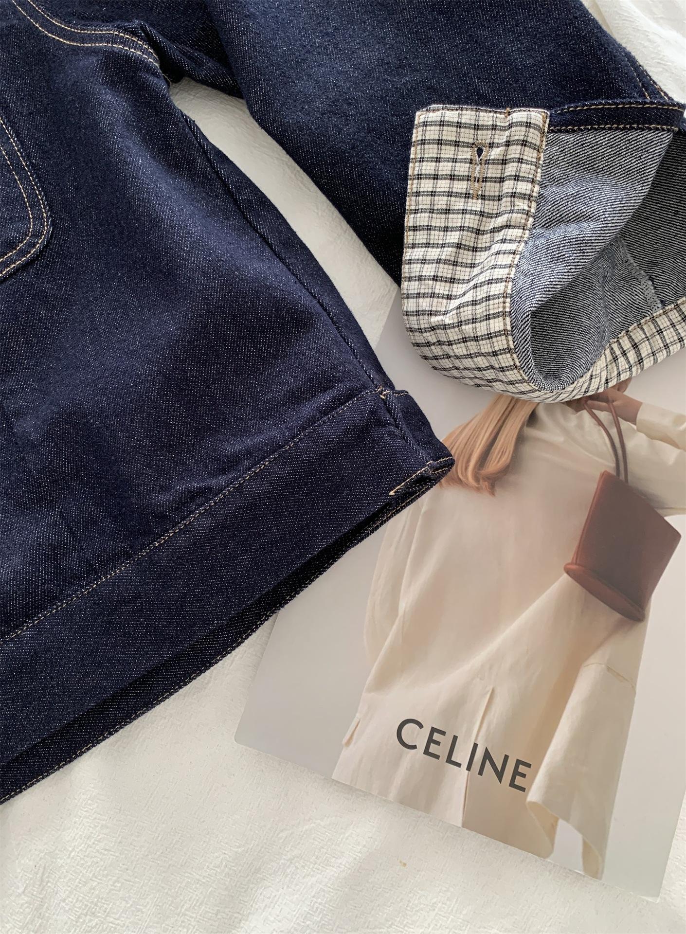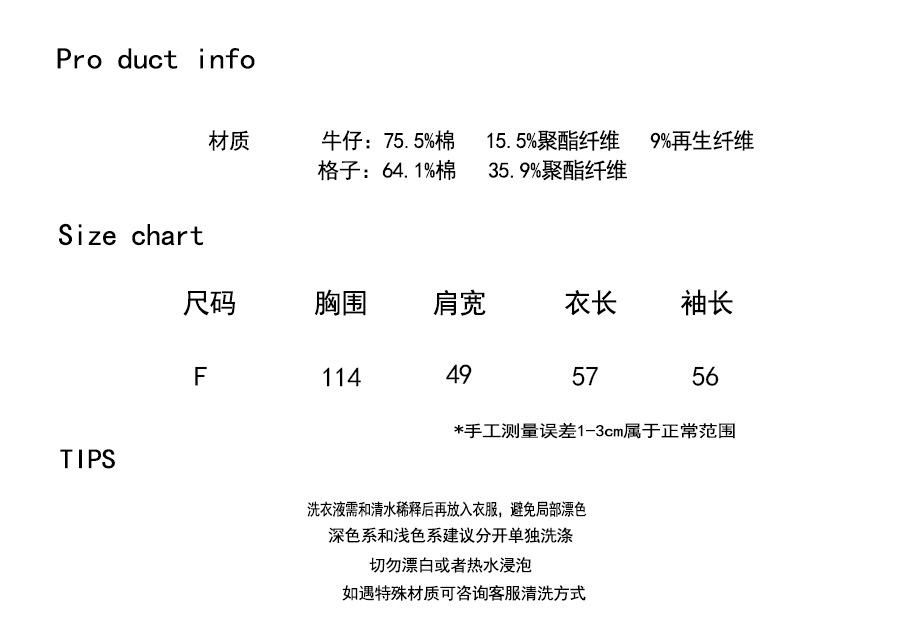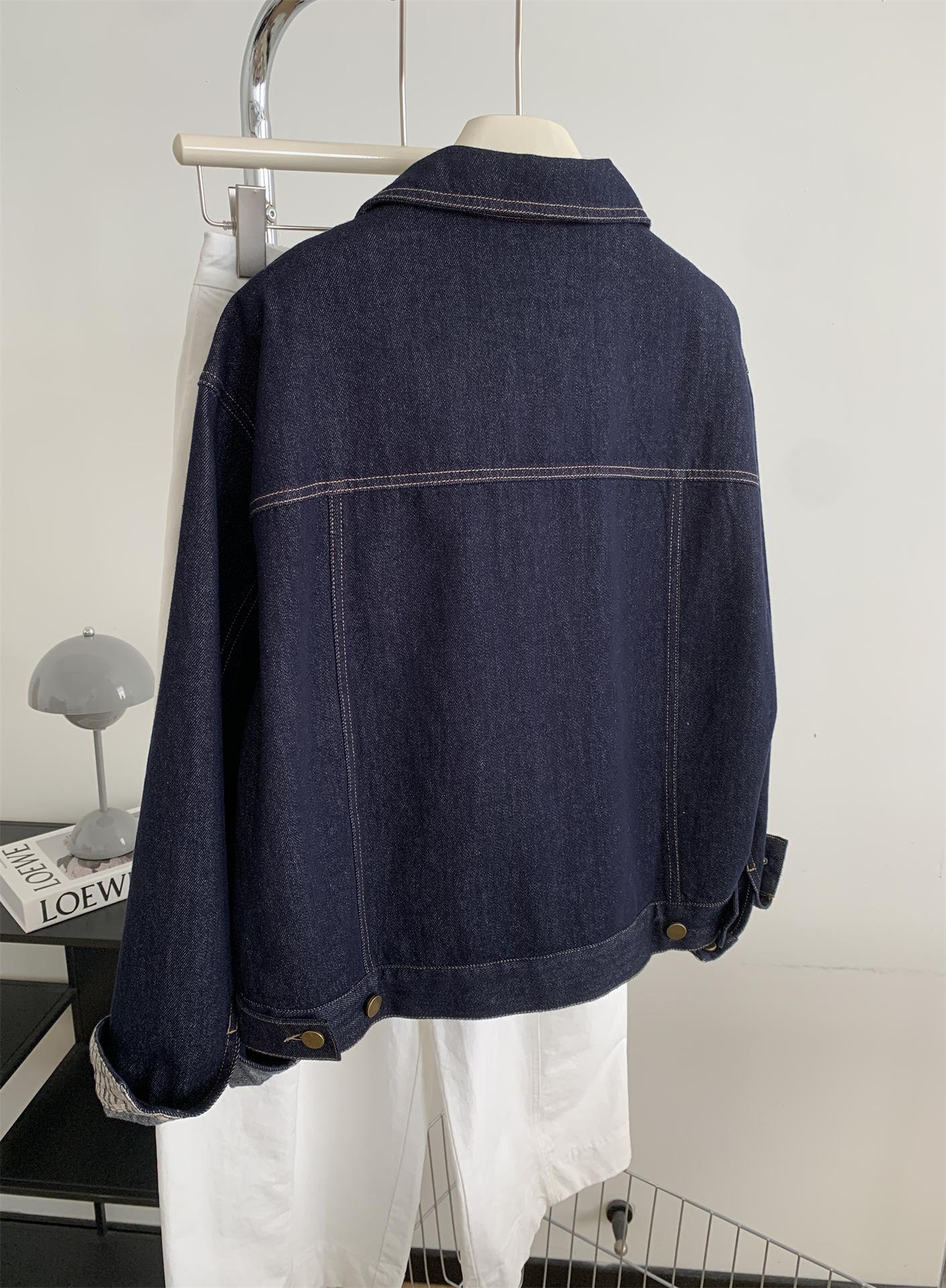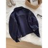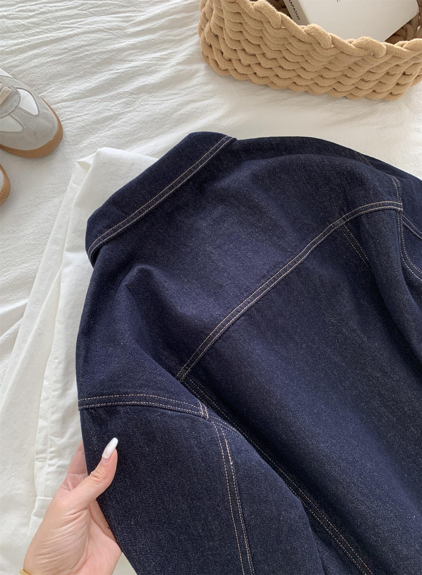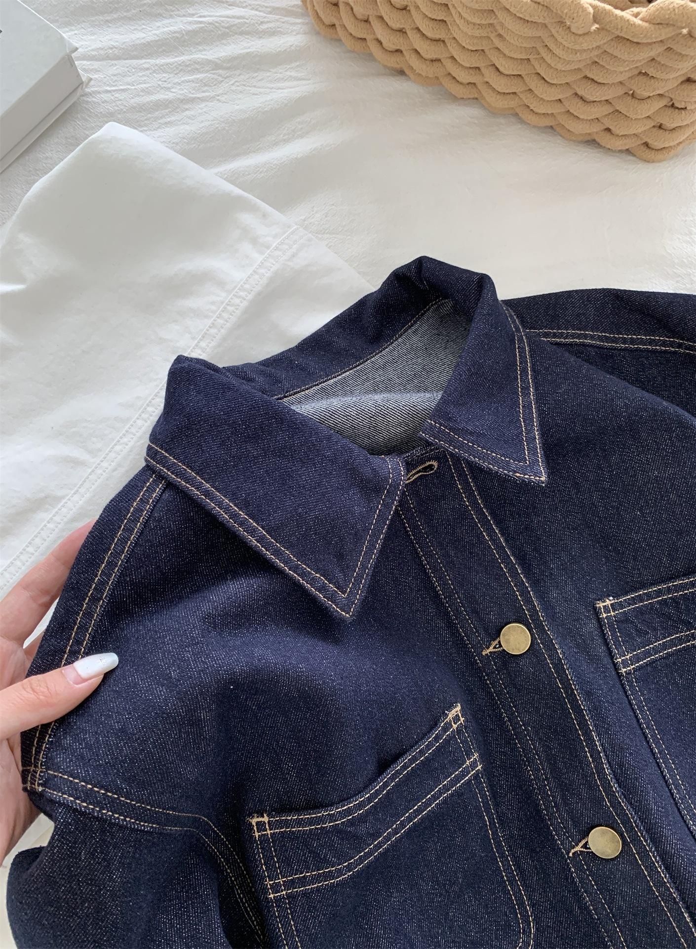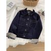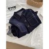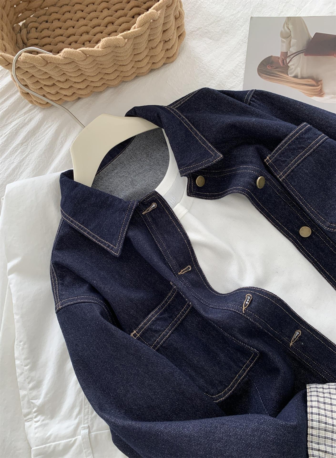 Chaqueta de mezclilla de peso pesado azul lavado retro con manga a cuadros para mujer, holgada, estilo coreano, petite, cuello vuelto, top corto, otoño