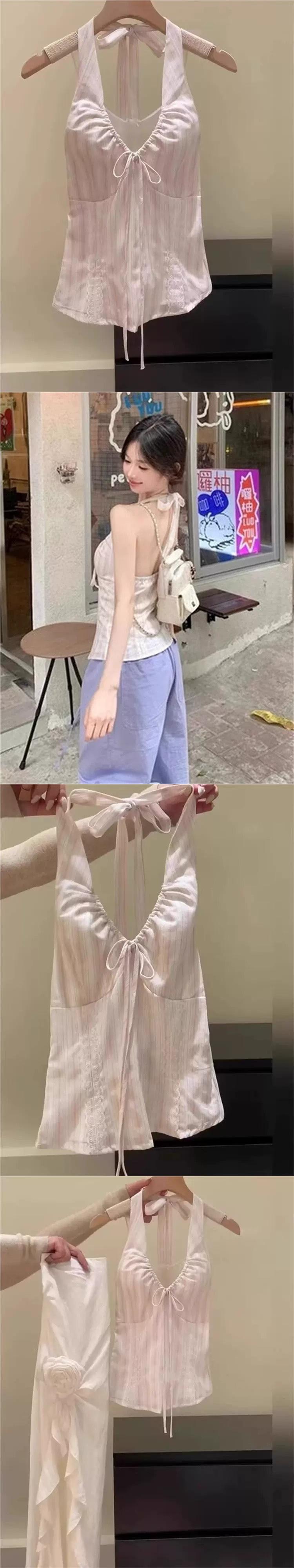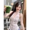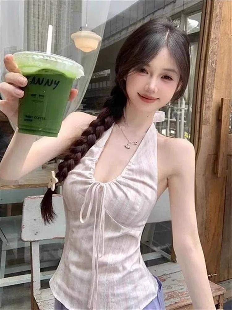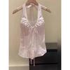 Top halter rosa puro y sexy con cuello en V y lazo para atar para mujer, verano, nuevo, ajustado, plisado, ropa interior, top sin mangas con hombros descubiertos