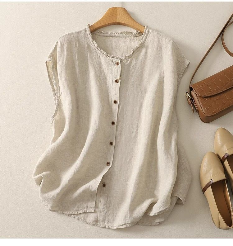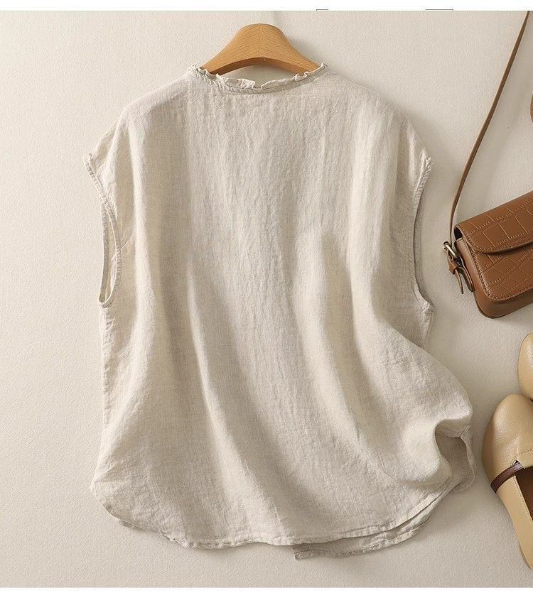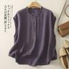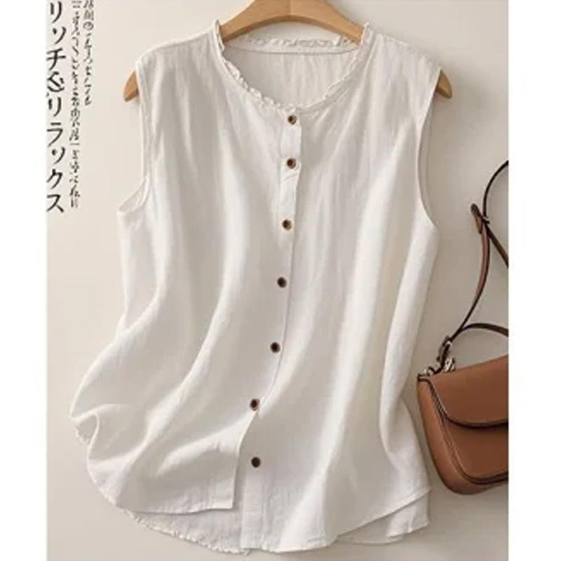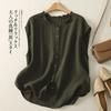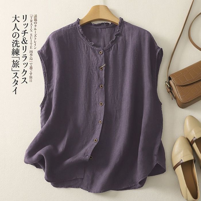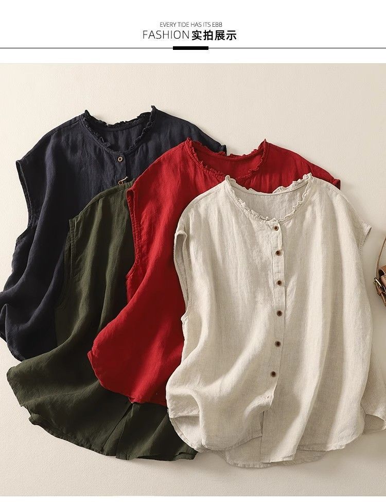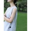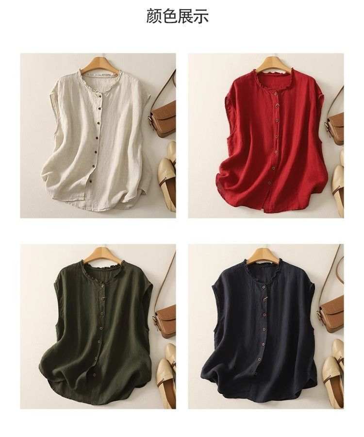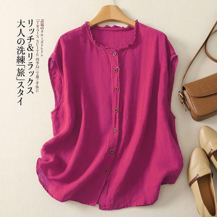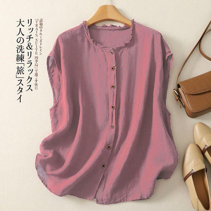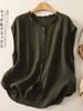 Verano Fresco Suelto para Mujer Color Dopamina Algodón y Lino Top sin Mangas Chaleco Cuello de Encaje Botón Cárdigan Top