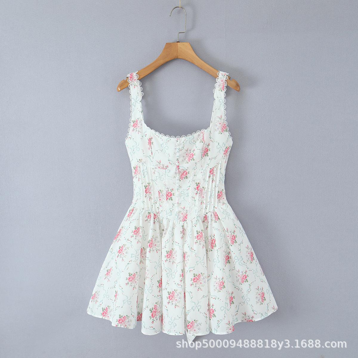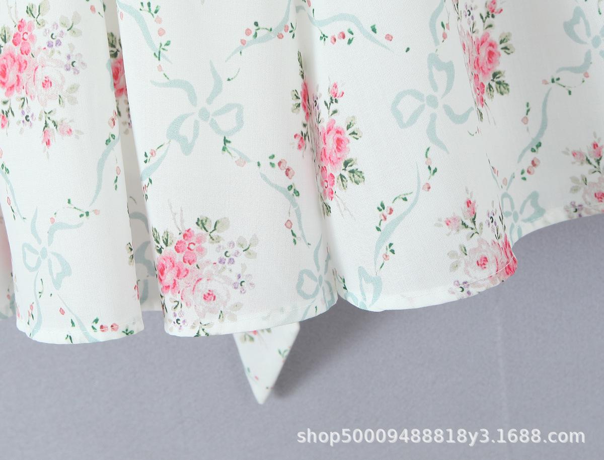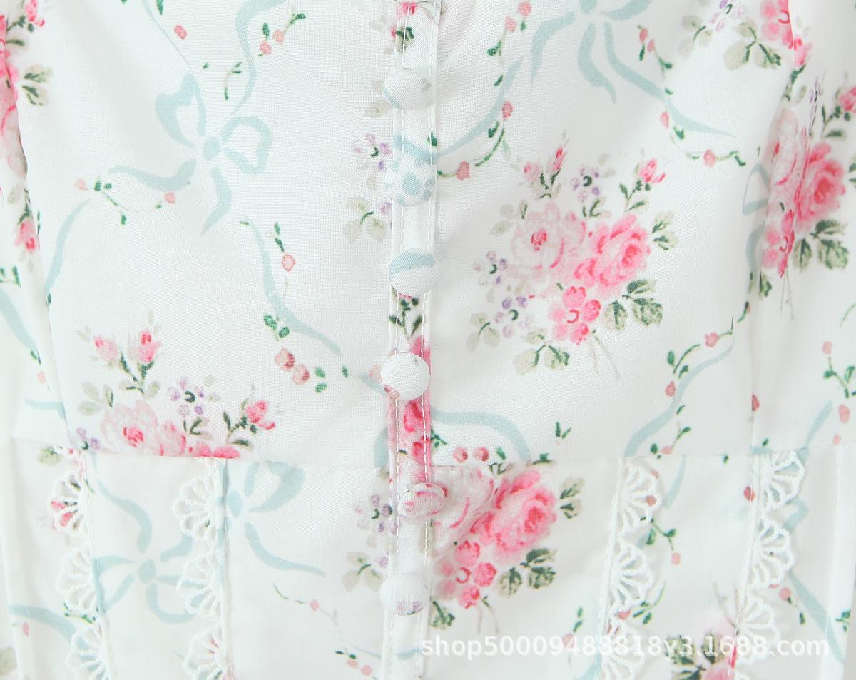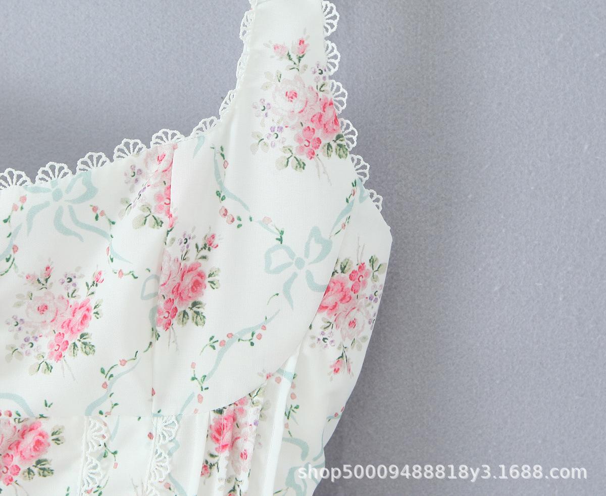 Casa Mismo Estilo Francés Estampado Rosa Dulce Decorado con Lazo Falda con Tirantes de Encaje Plisado en la Cintura Vestido de Mujer