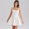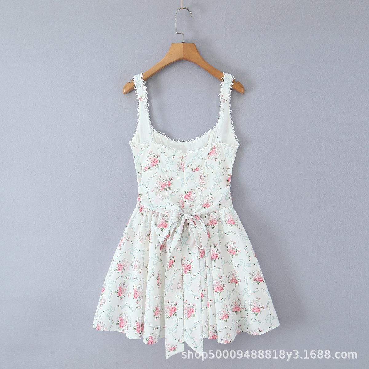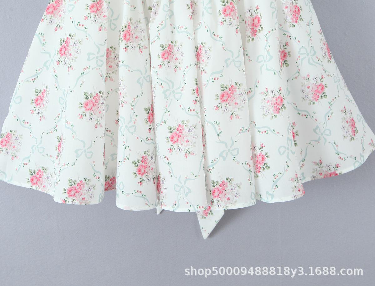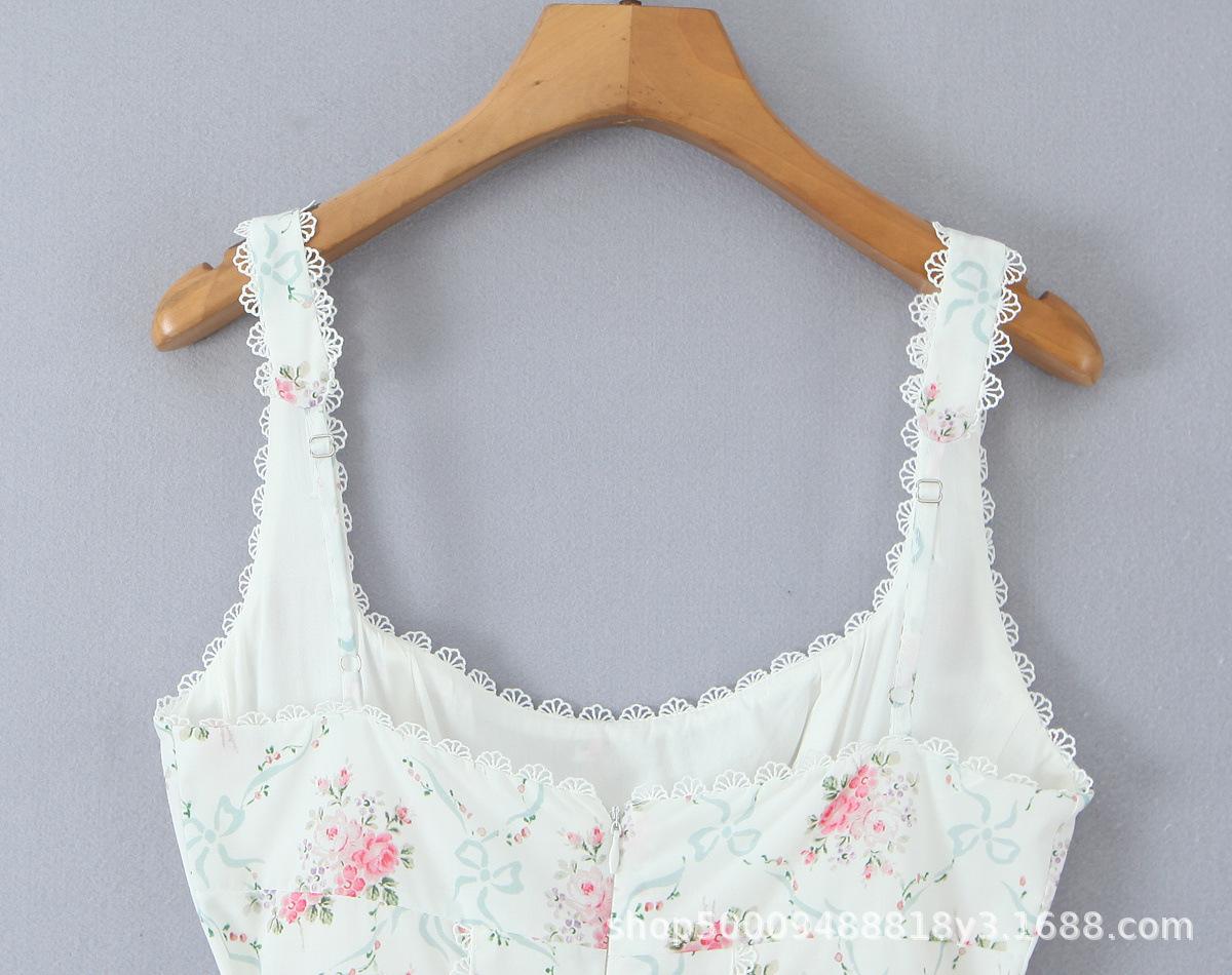 Casa Mismo Estilo Francés Estampado Rosa Dulce Decorado con Lazo Falda con Tirantes de Encaje Plisado en la Cintura Vestido de Mujer