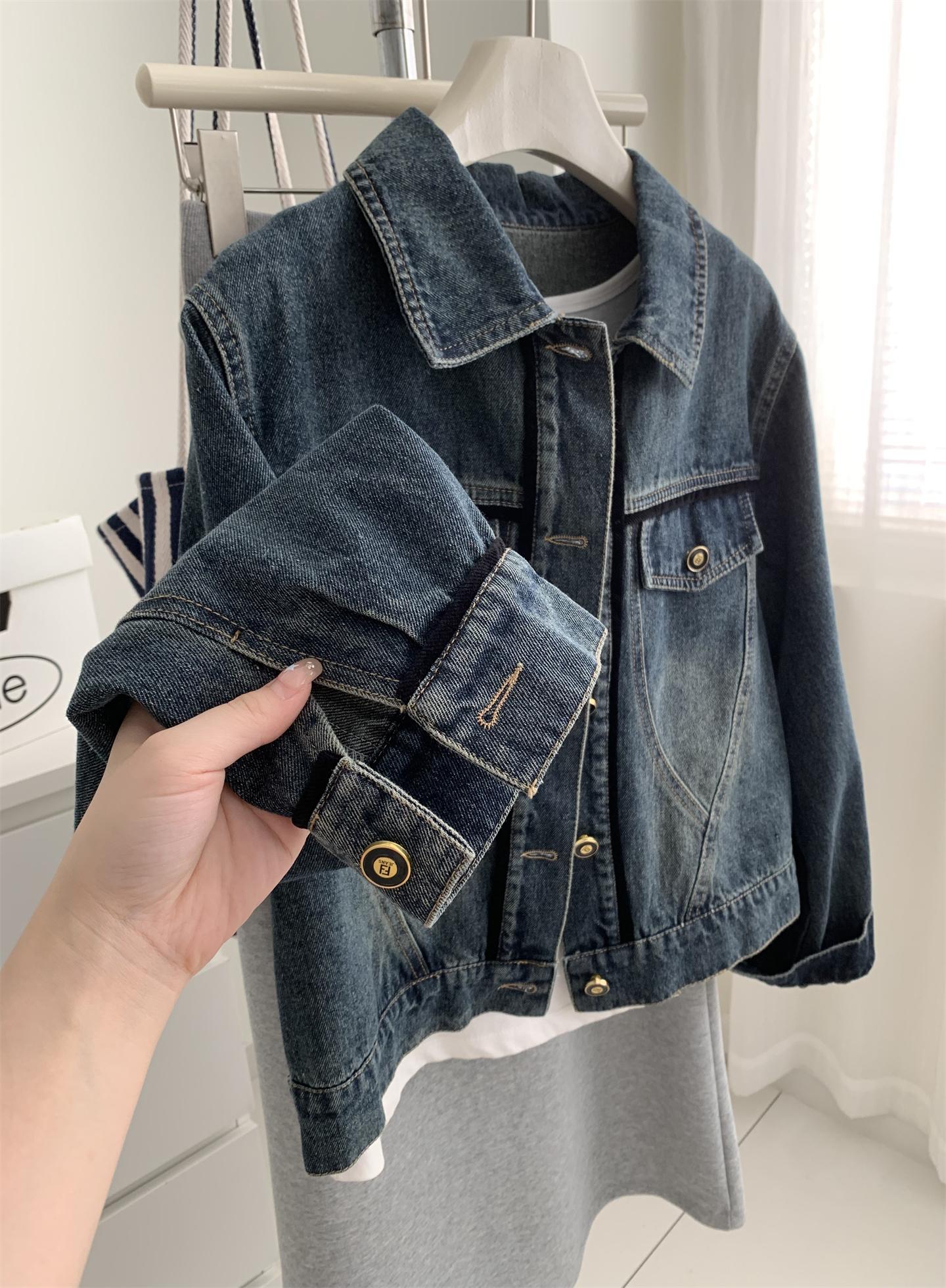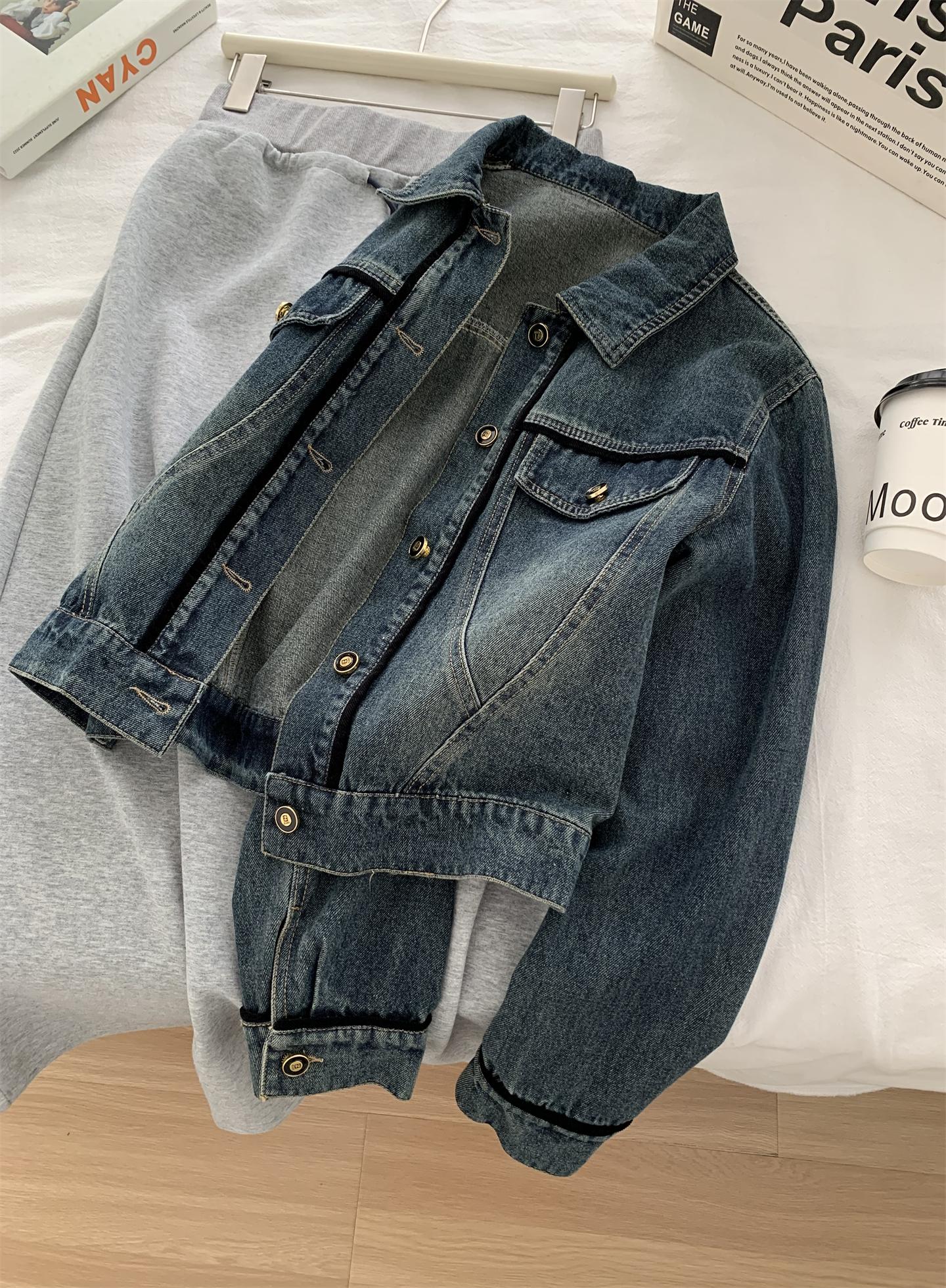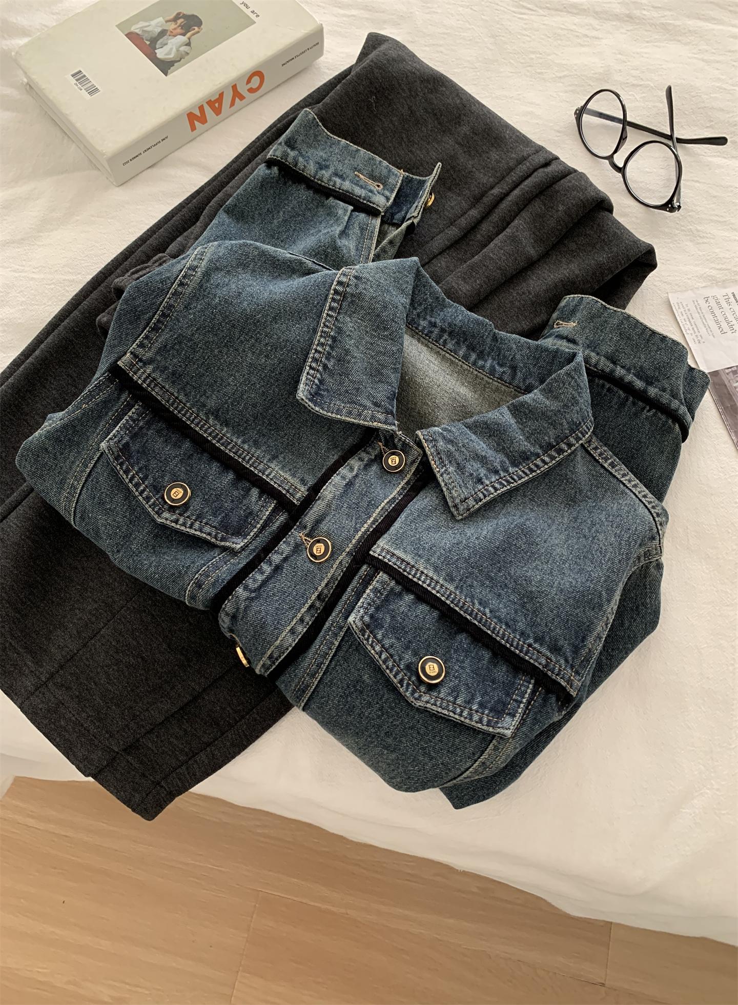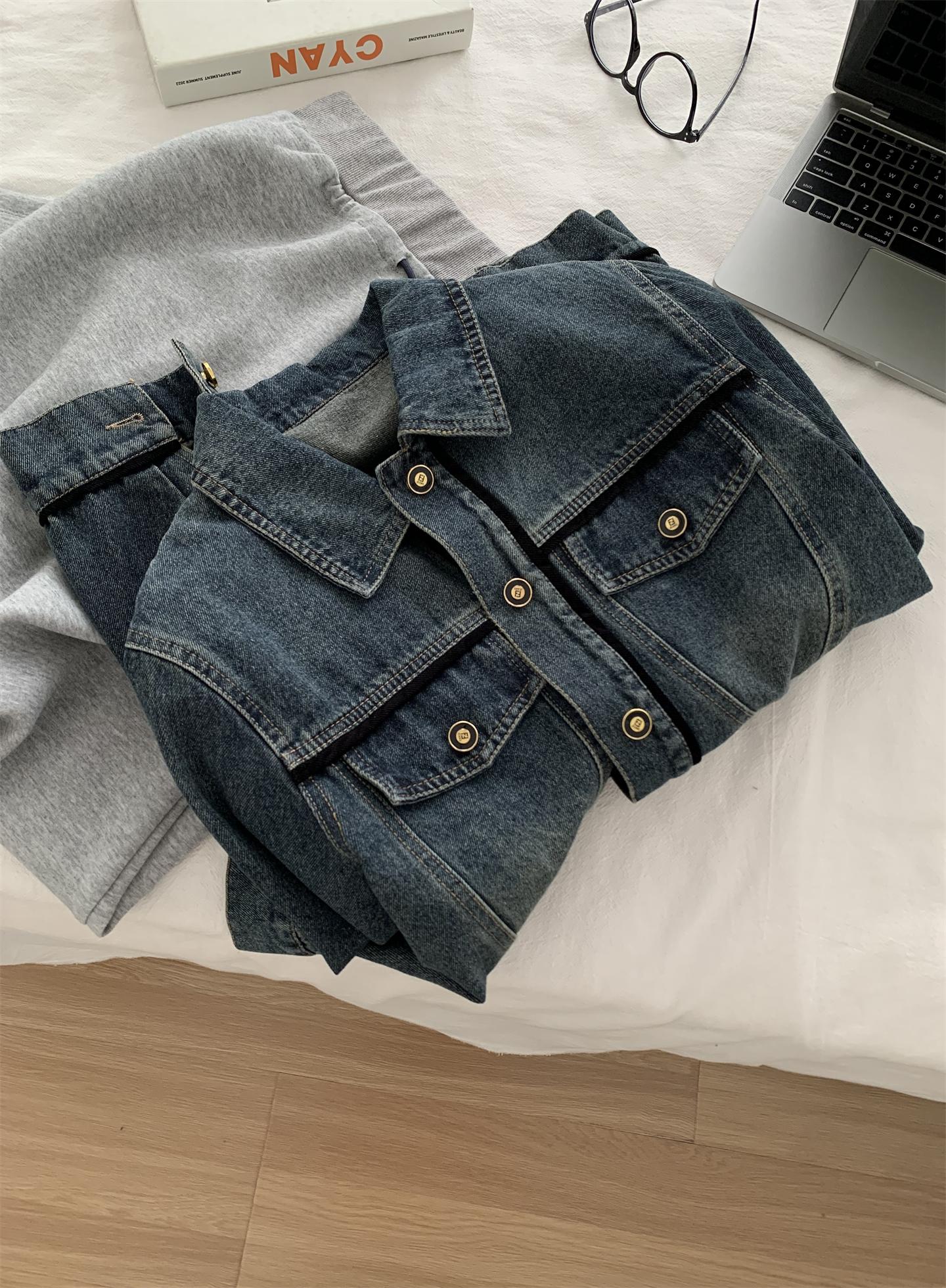 Diseño coreano chaqueta de mezclilla estilo pequeño Chanel mujer pequeña solapa con tira de bolso con hebilla dorada cárdigan corto top 25 otoño/invierno