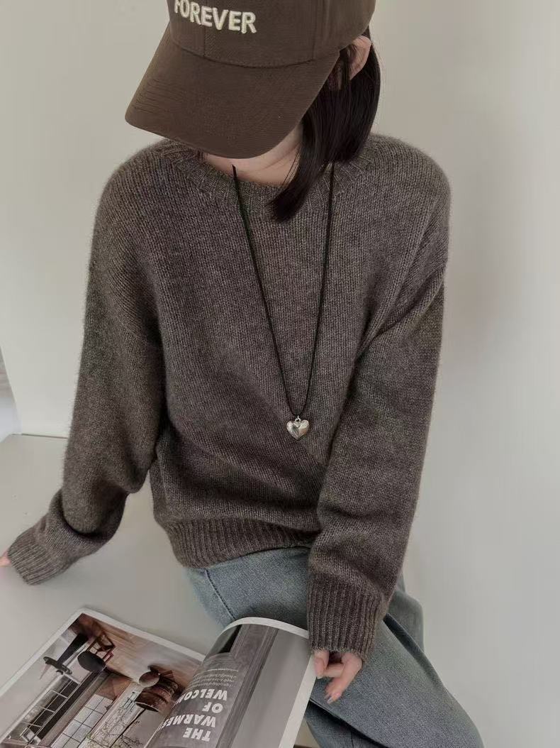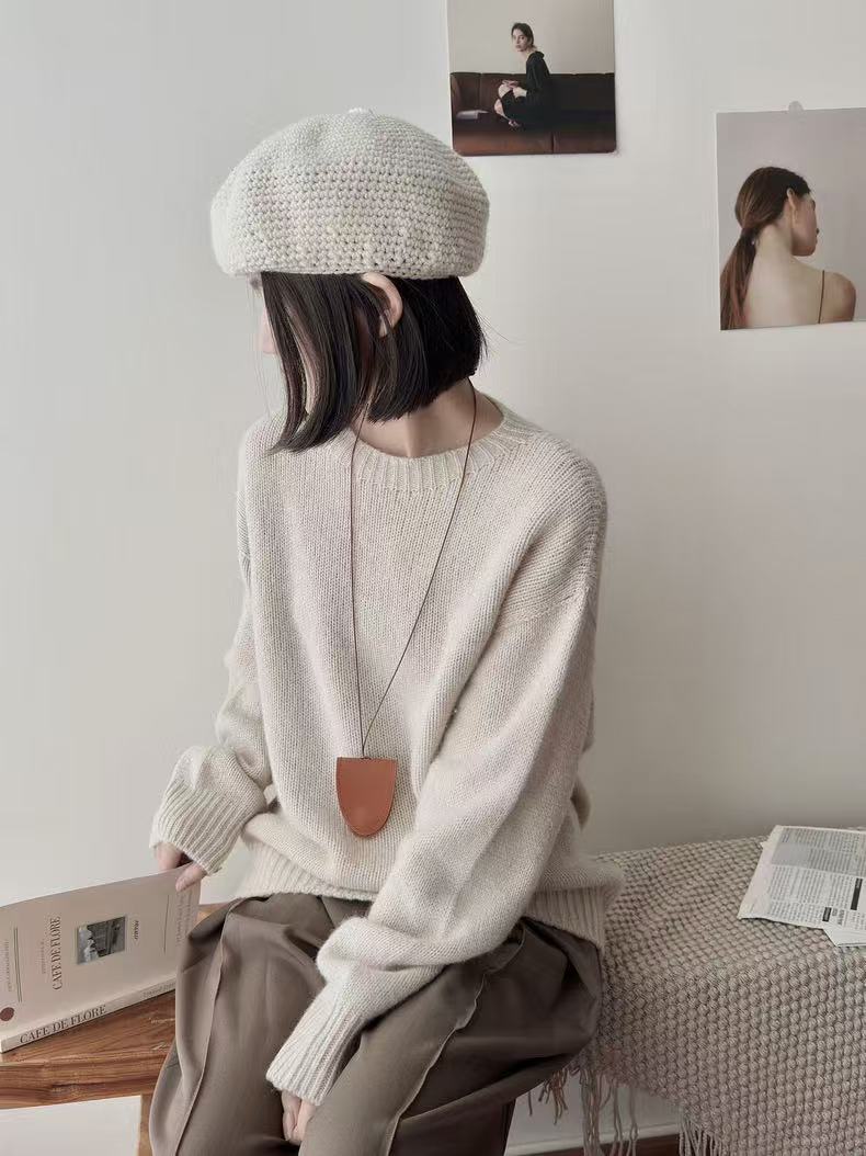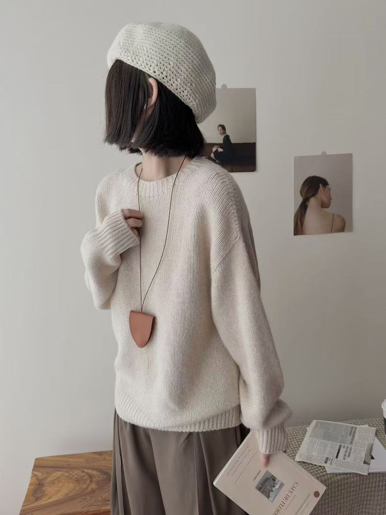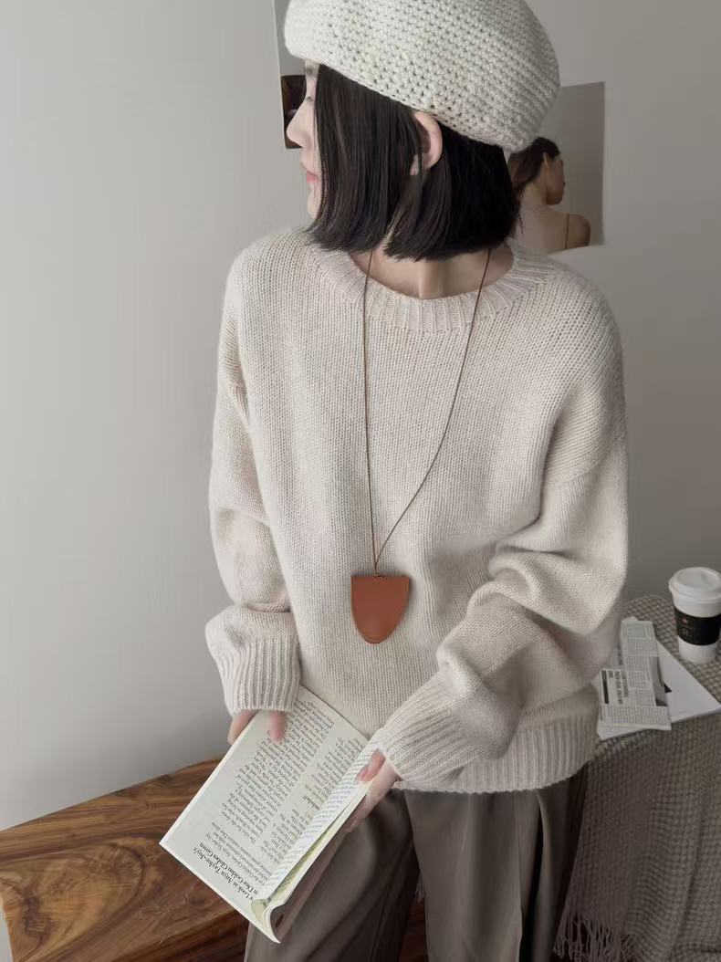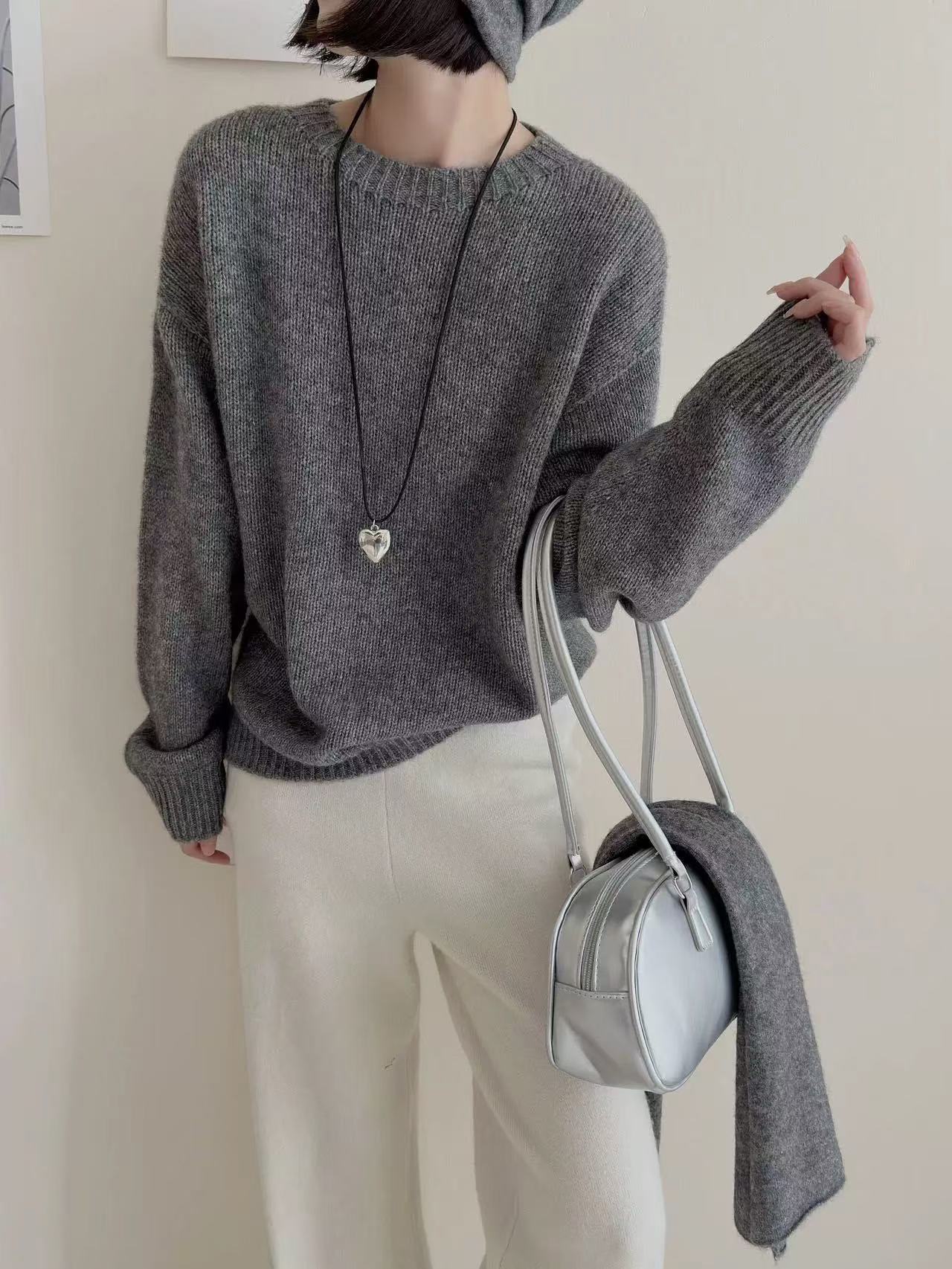 2025 Otoño/Invierno Nuevo Jersey de Punto de Lana Pura para Mujer con Cuello Redondo, Color Sólido, Holgado, Temperamental, Casual, Sencillo, Perezoso
