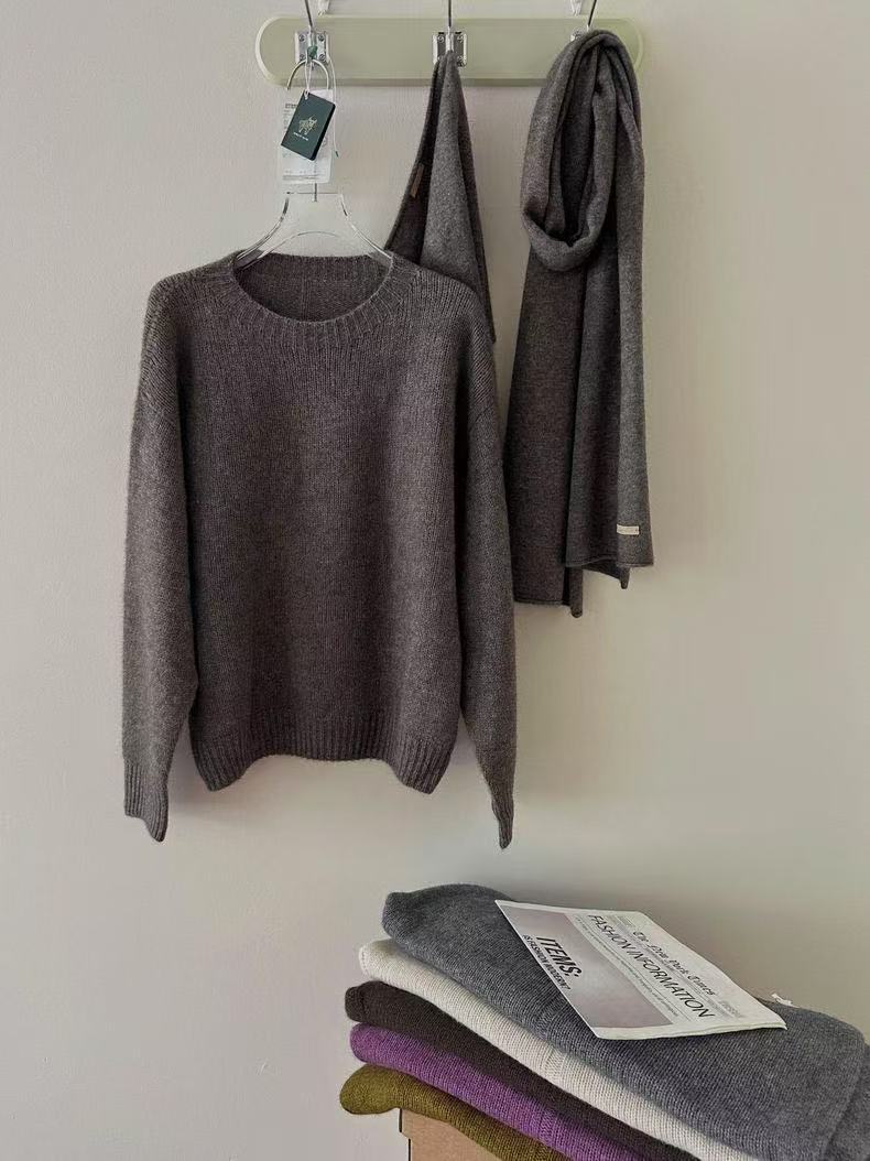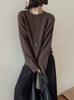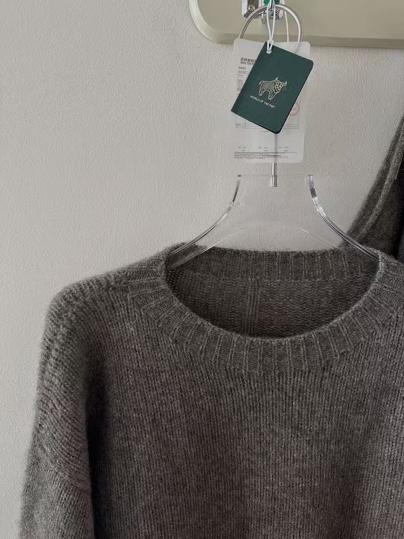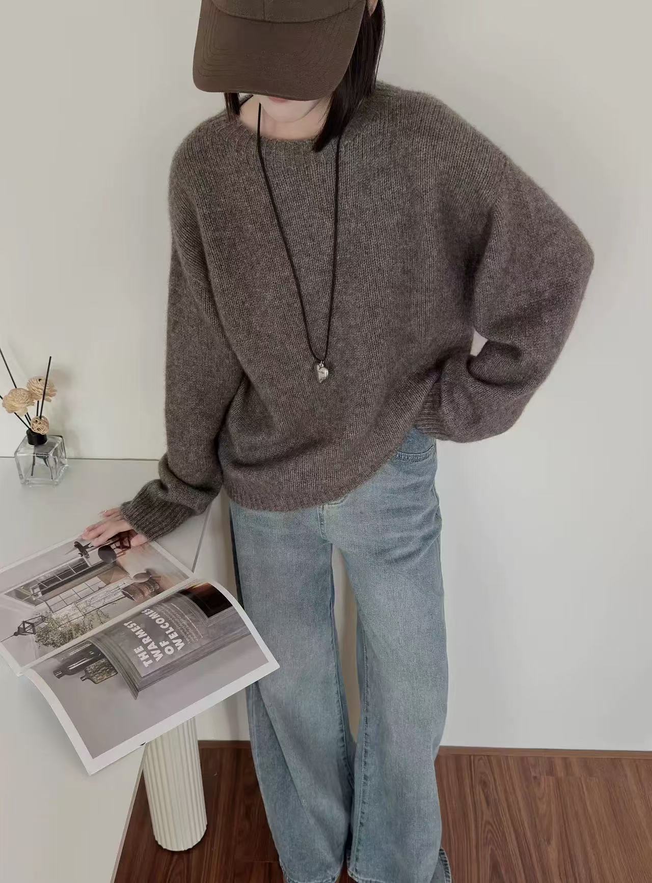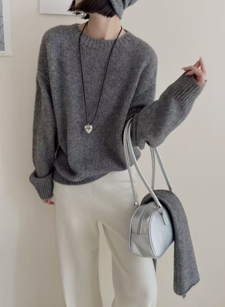 2025 Otoño/Invierno Nuevo Jersey de Punto de Lana Pura para Mujer con Cuello Redondo, Color Sólido, Holgado, Temperamental, Casual, Sencillo, Perezoso