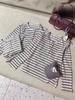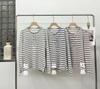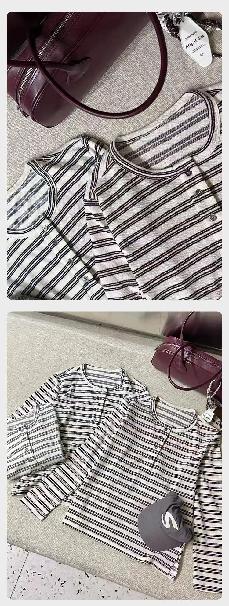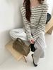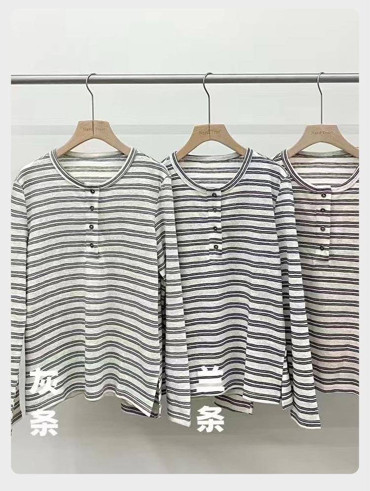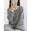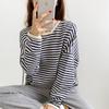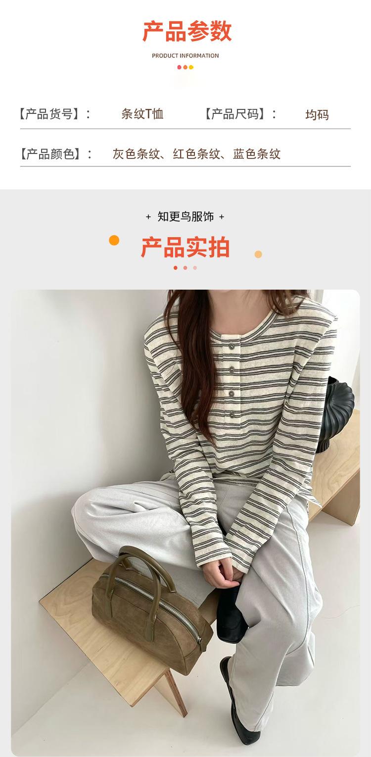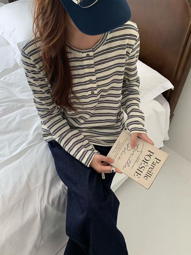 Otoño e invierno estilo coreano perezoso versátil botón cuello redondo playera de rayas mujeres holgada moderna manga larga top para mujer ZWT
