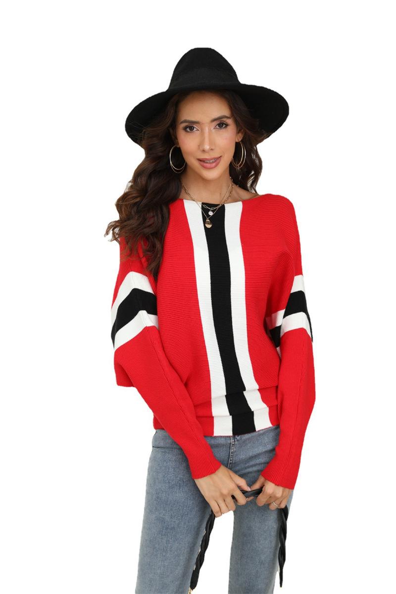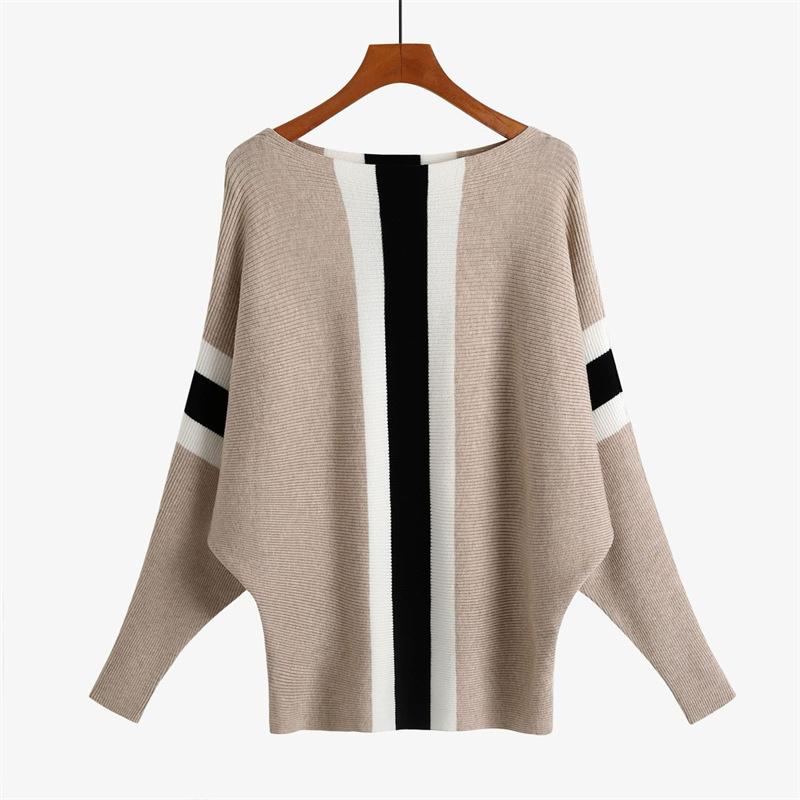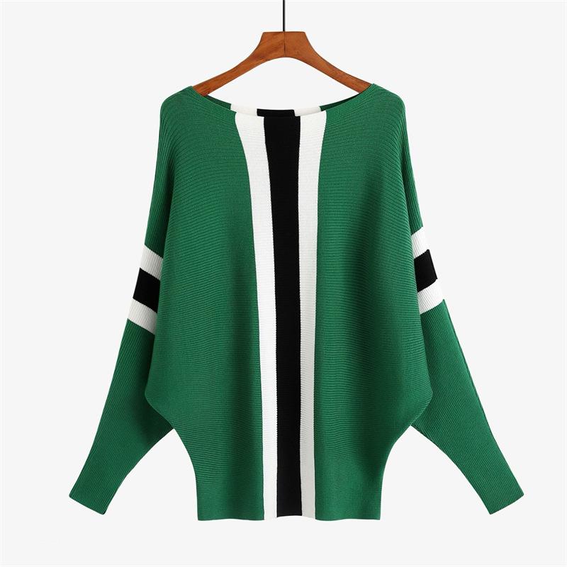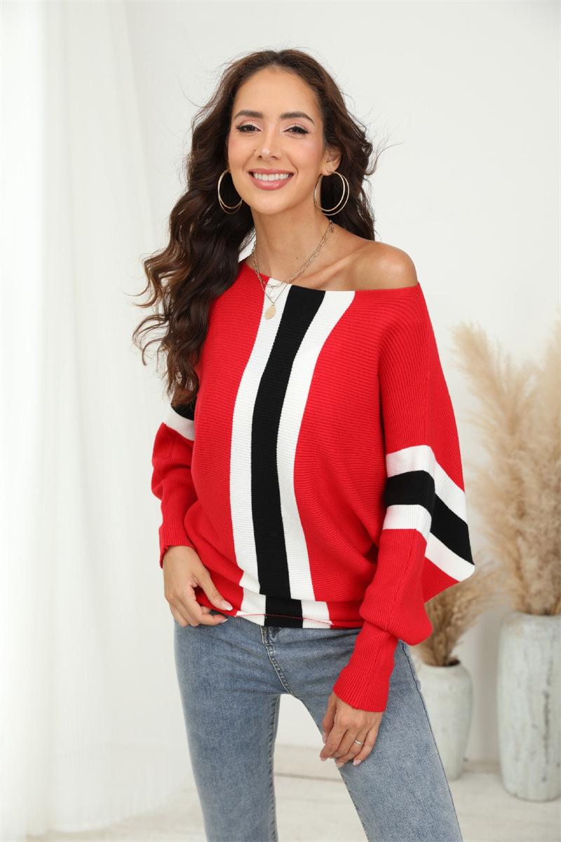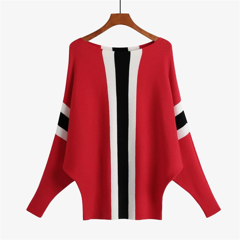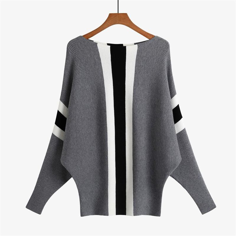 Suéter exclusivo de comercio electrónico transfronterizo para mujer europeo y americano de otoño e invierno con manga murciélago, un hombro, bloque de color a rayas, talla grande, top holgado