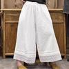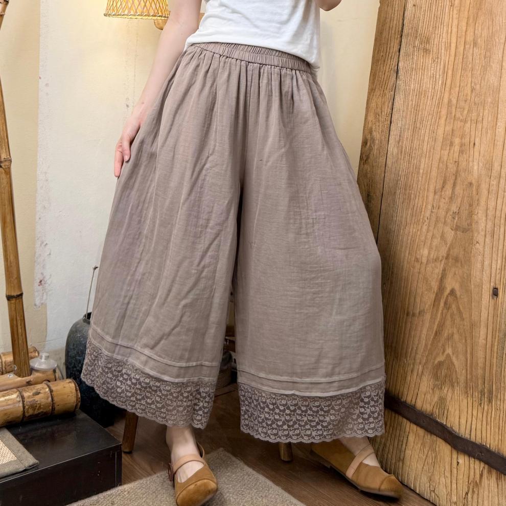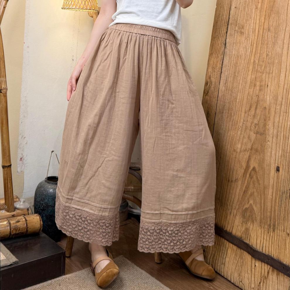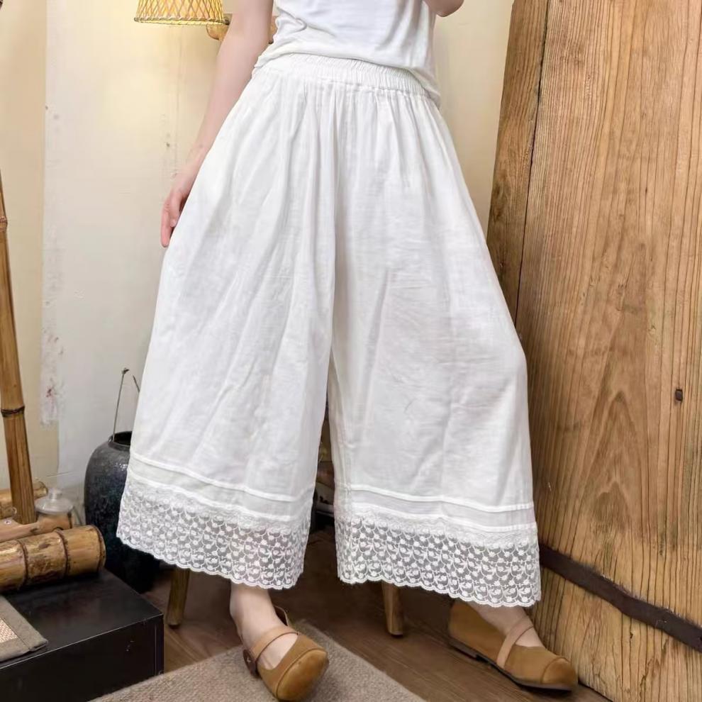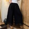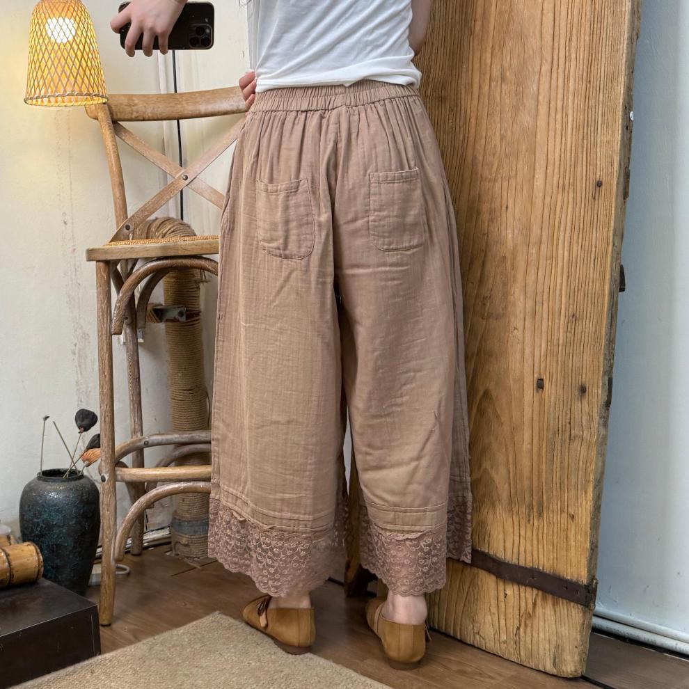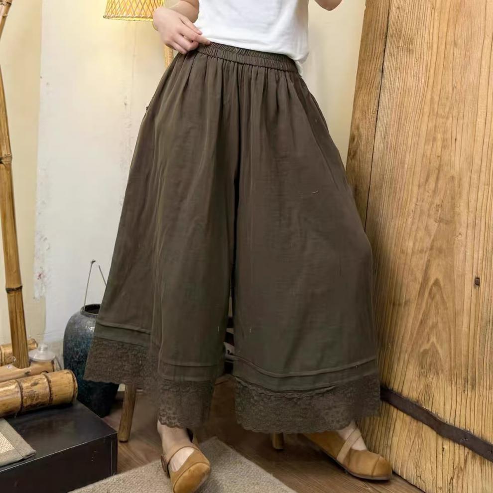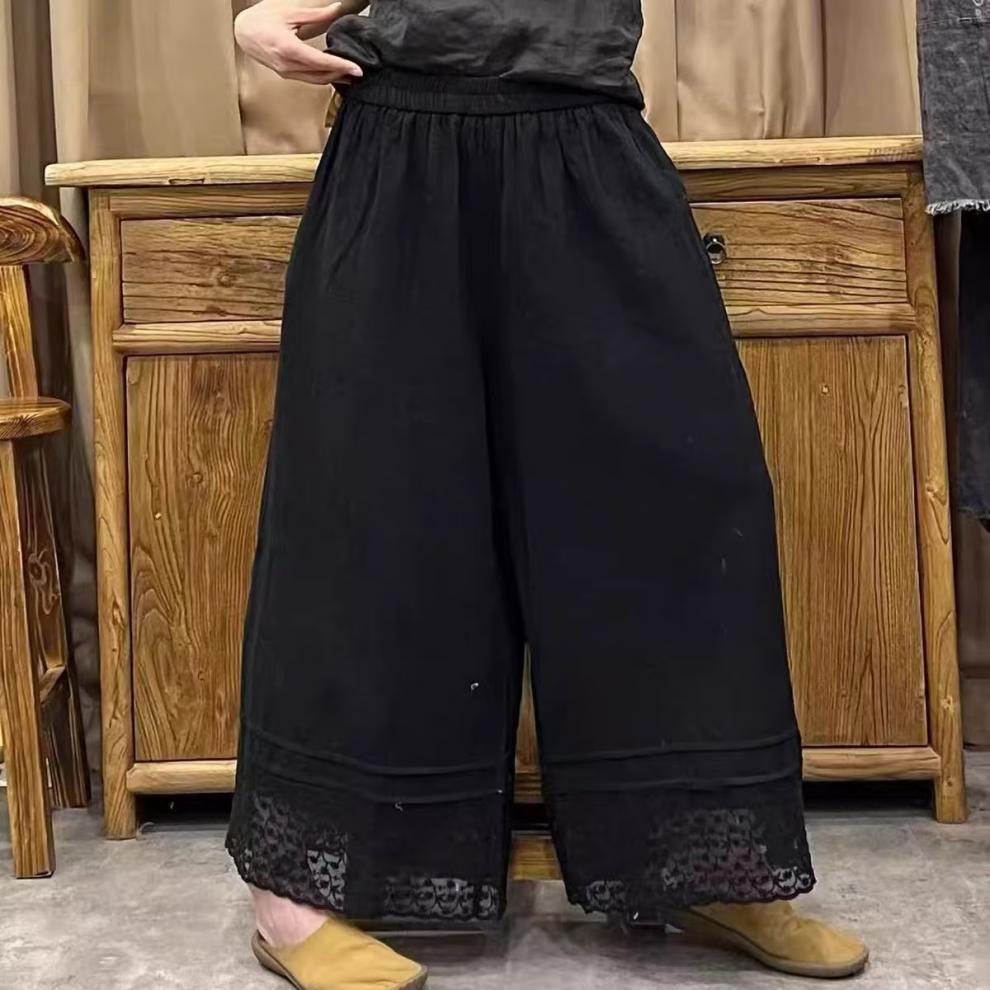 Otoño 2025 Nuevo Cómodo Casual Versátil Color Sólido Doble Capa Tela Gasa de Algodón Empalmado Encaje Pantalones Cintura Elástica Pantalones de Pierna Ancha