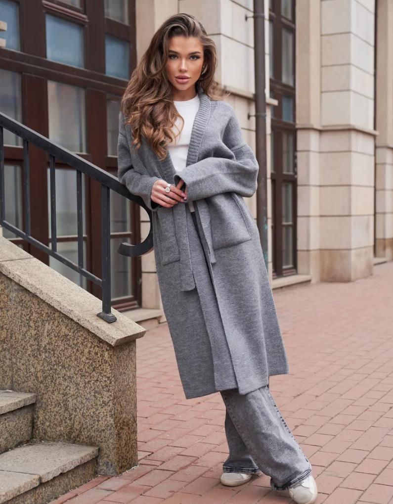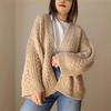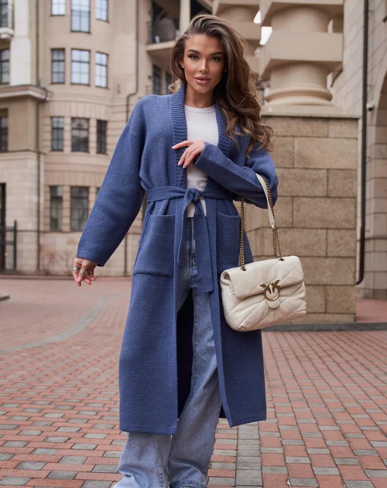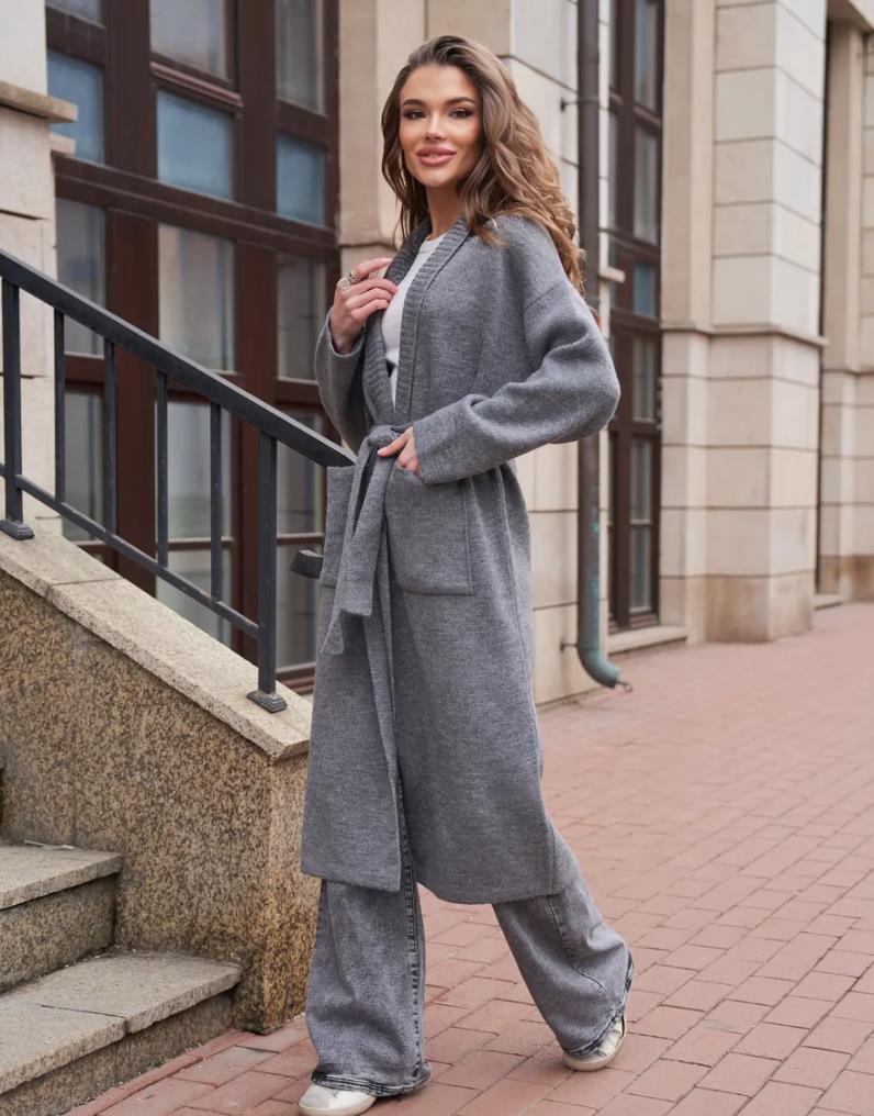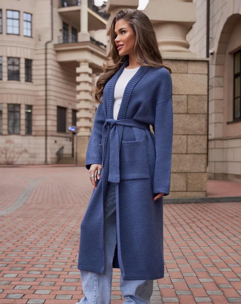 2025 Otoño/Invierno Nuevo Cárdigan de Punto de Solapa Larga Europeo y Americano Suéter Transfronterizo Abrigo Casual Holgado para Mujer Cinturón para Mujer