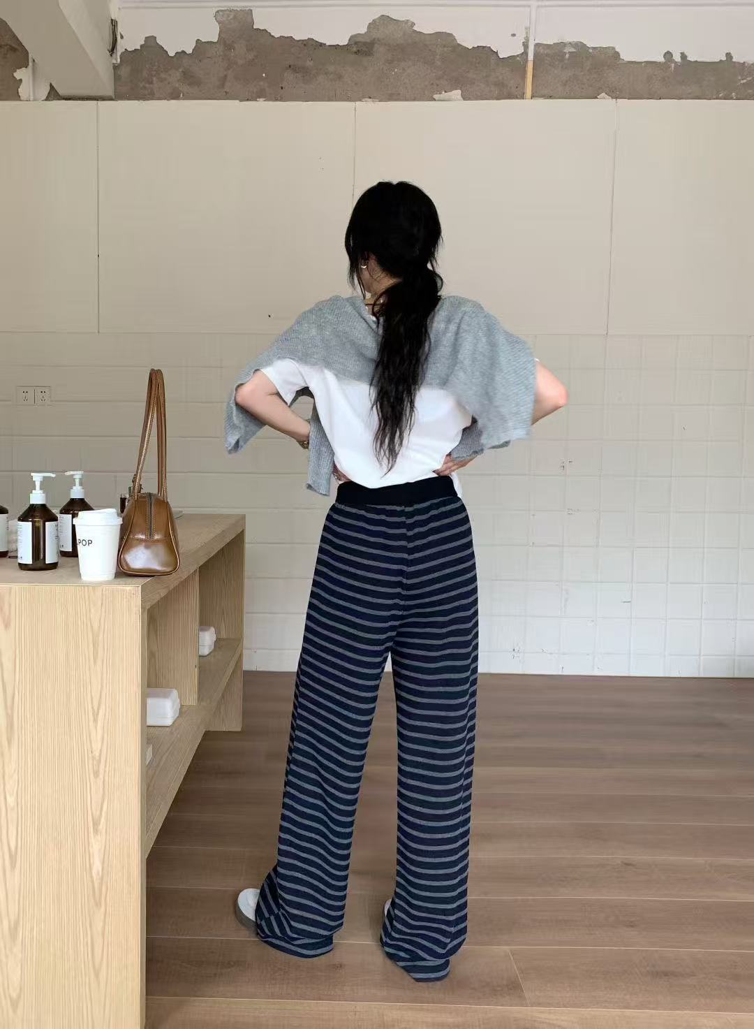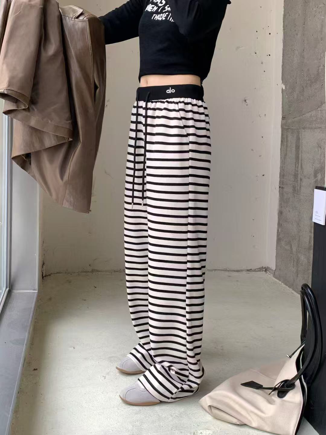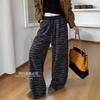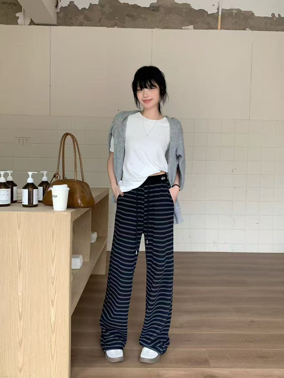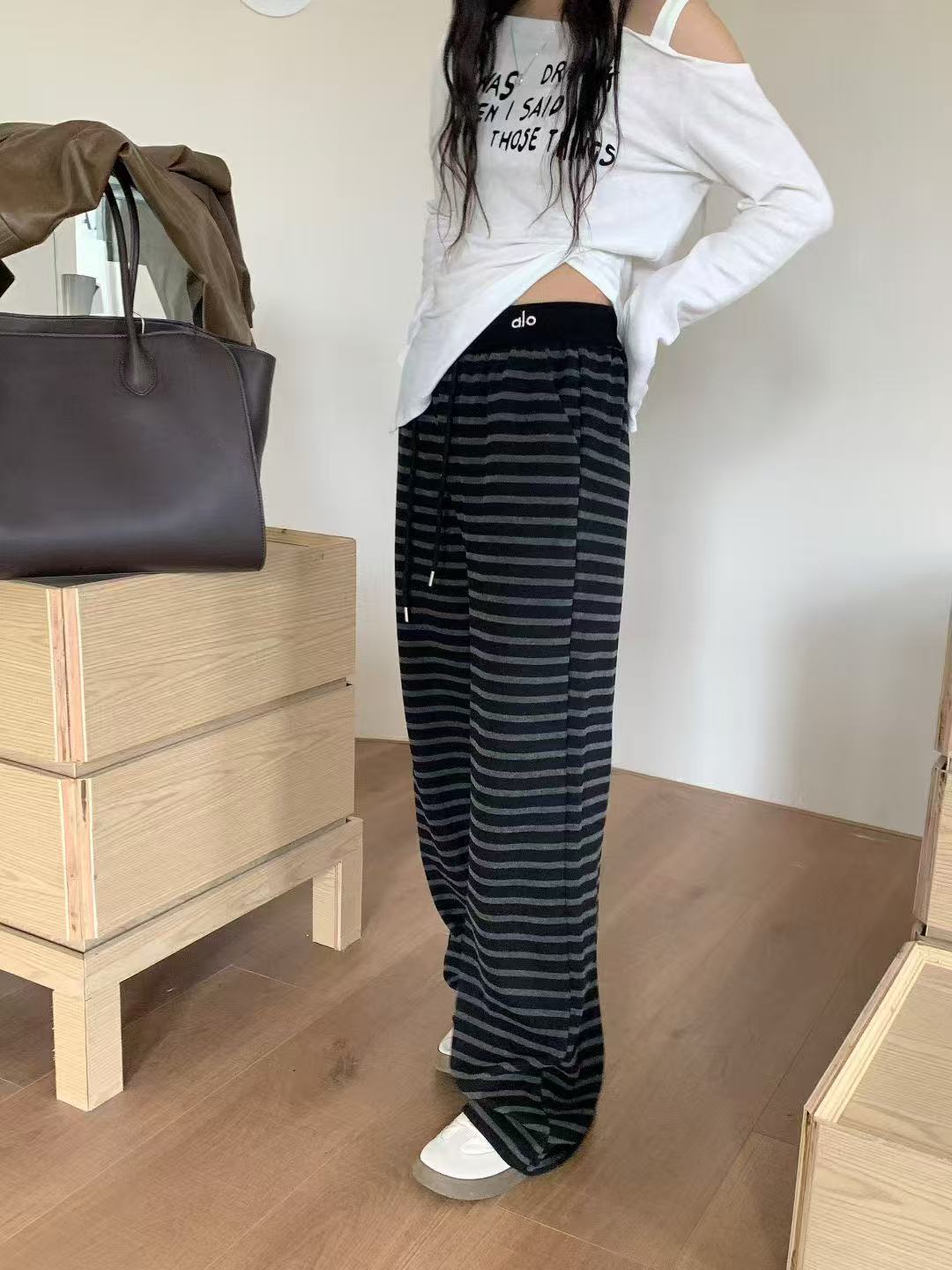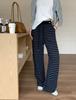 Pantalones Casuales de Punto a Rayas con Bloque de Color Estilo Coreano 2025 Otoño Nuevo Cintura Alta Adelgazantes Versátiles Pierna Recta Pierna Ancha Modernos para Mujer