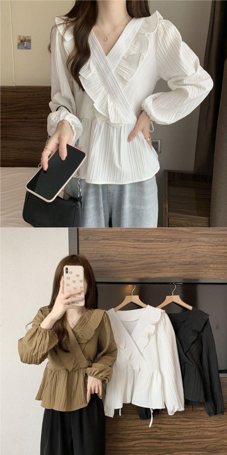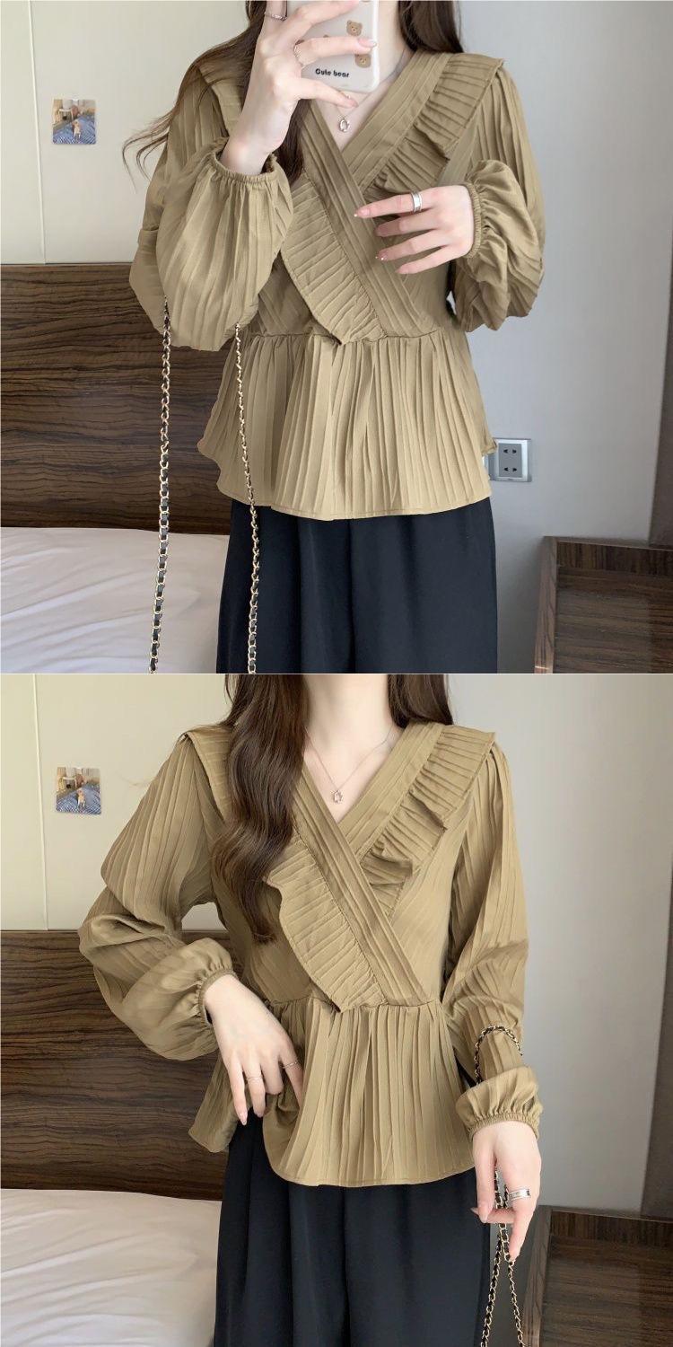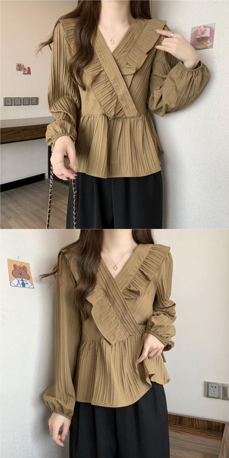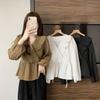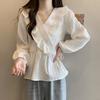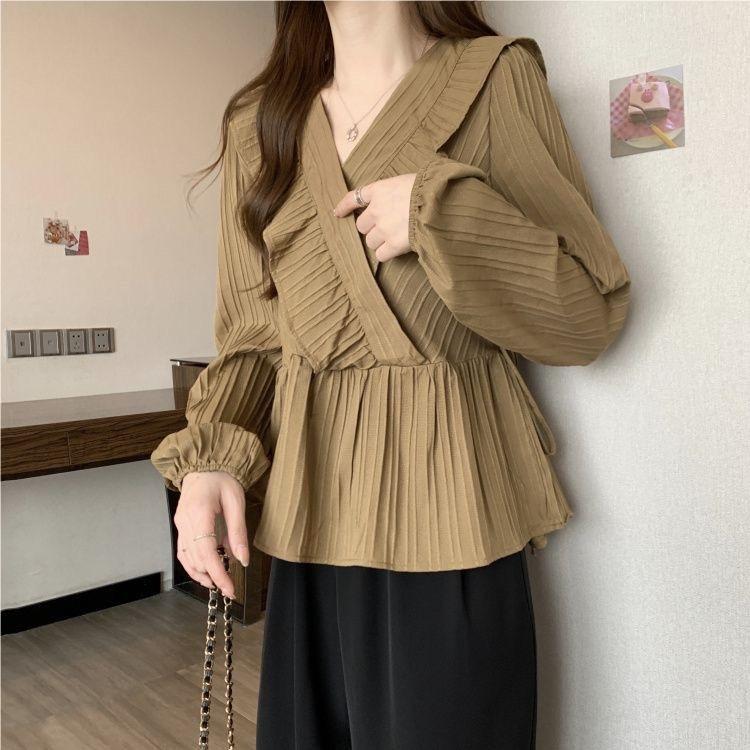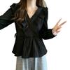 Talla Grande Nueva Camisa de Manga Larga con Cuello con Volantes para Mujer Otoño Temperamento Francés Reductor de Edad Cubre Vientre Top Adelgazante