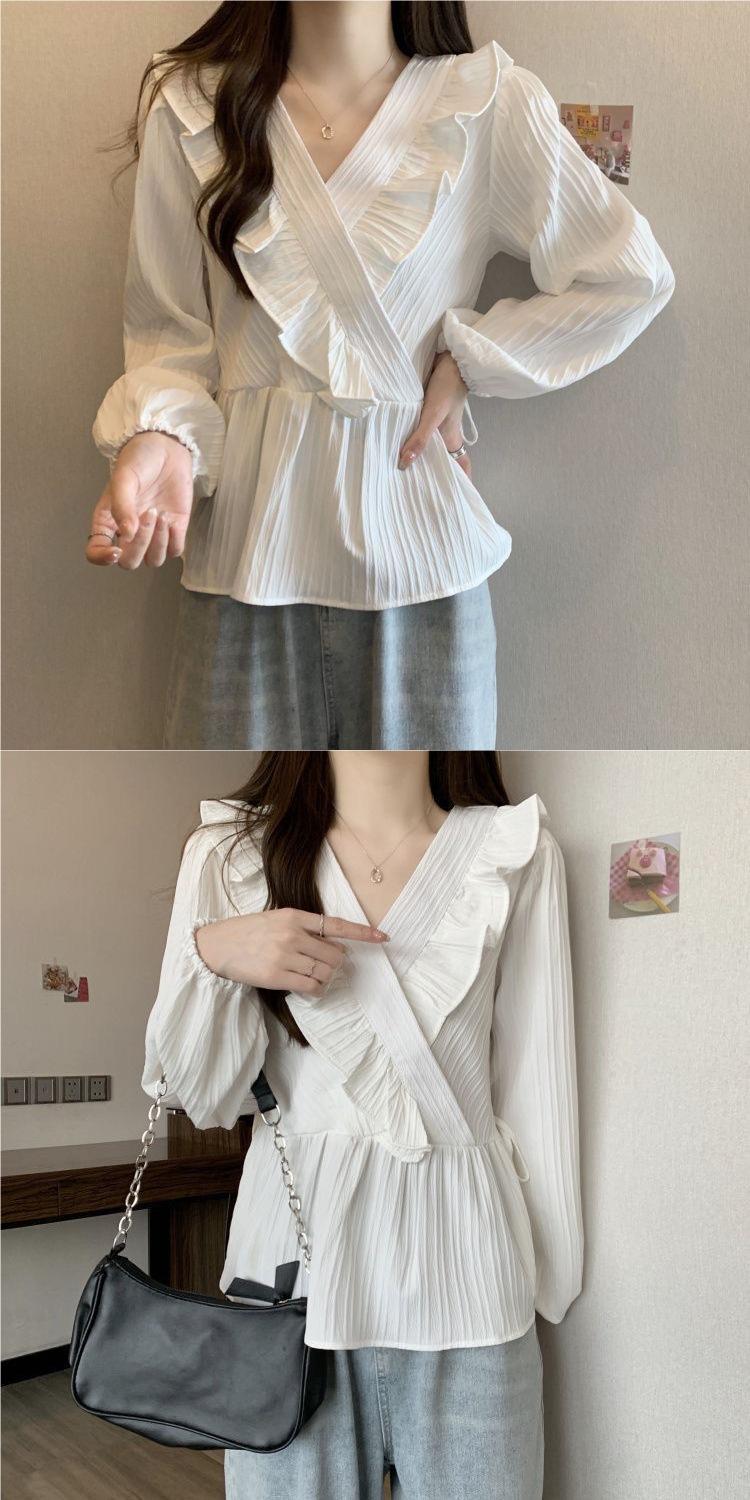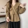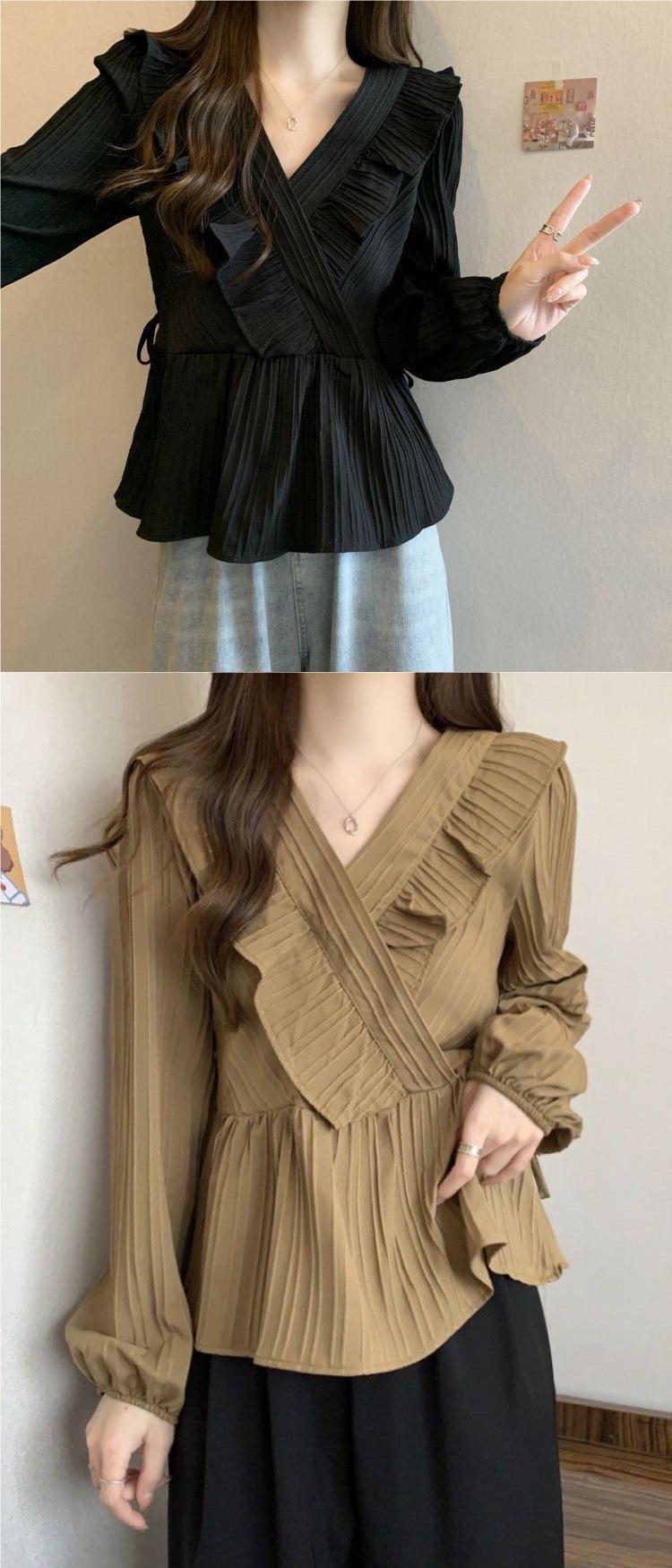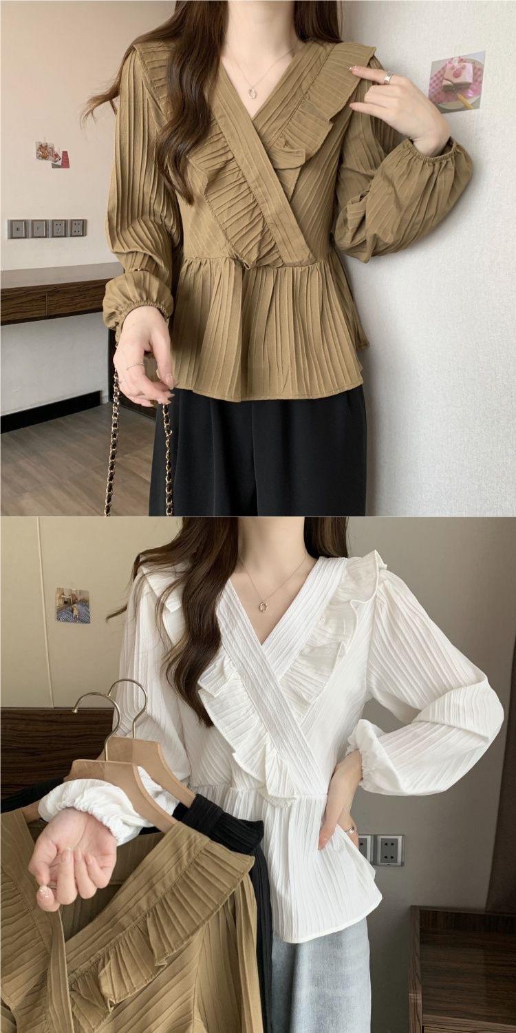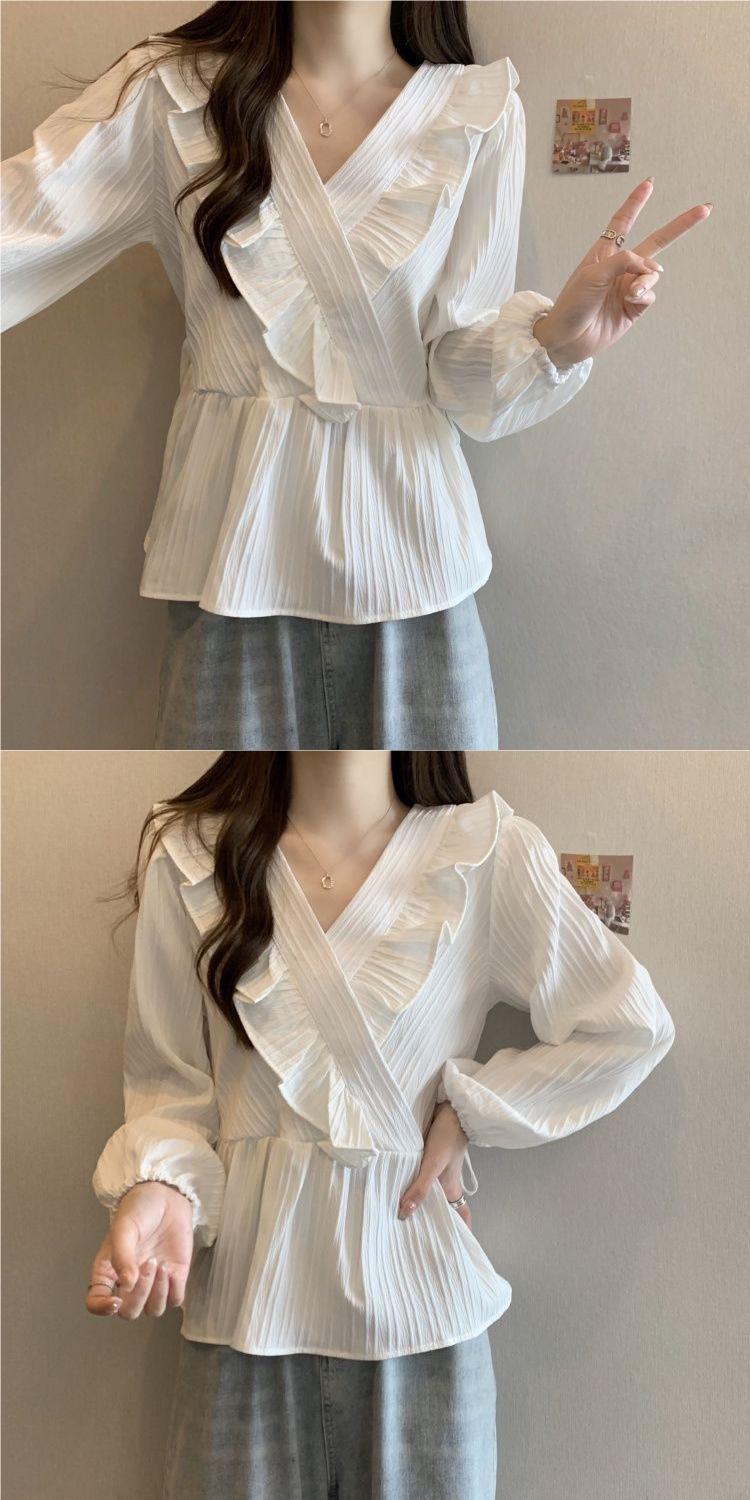 Talla Grande Nueva Camisa de Manga Larga con Cuello con Volantes para Mujer Otoño Temperamento Francés Reductor de Edad Cubre Vientre Top Adelgazante