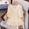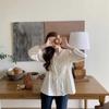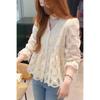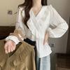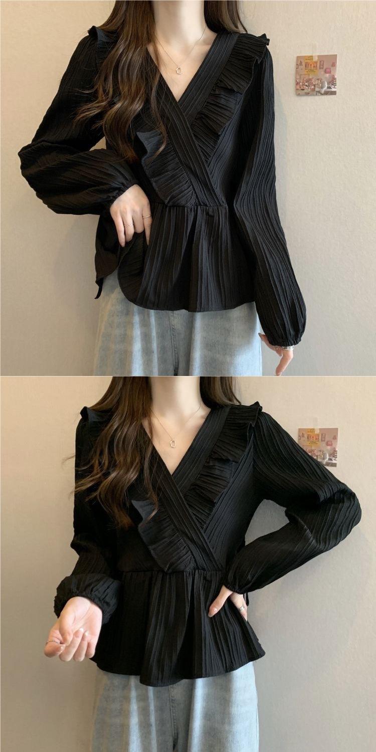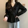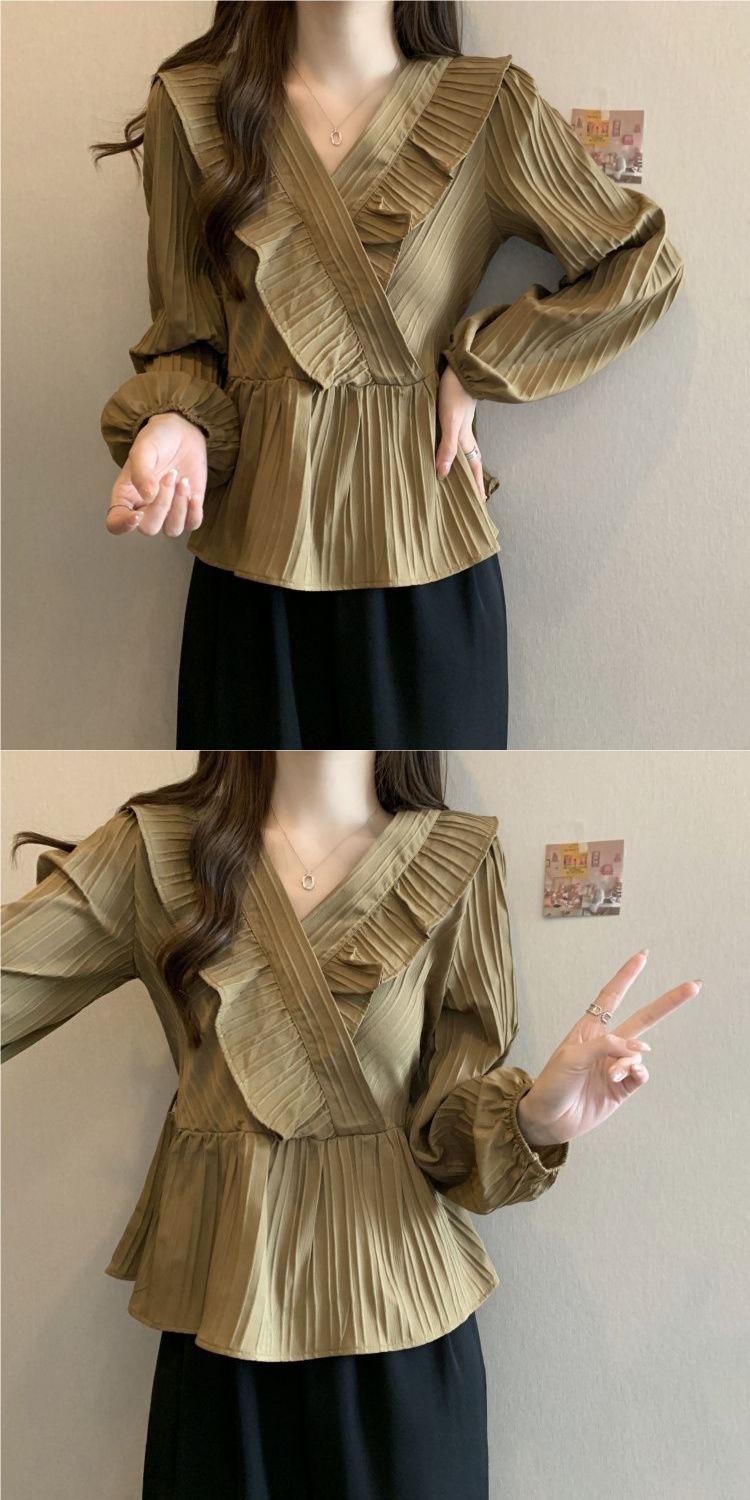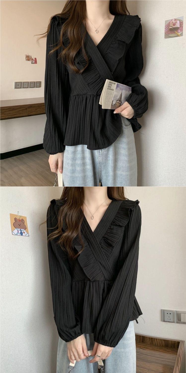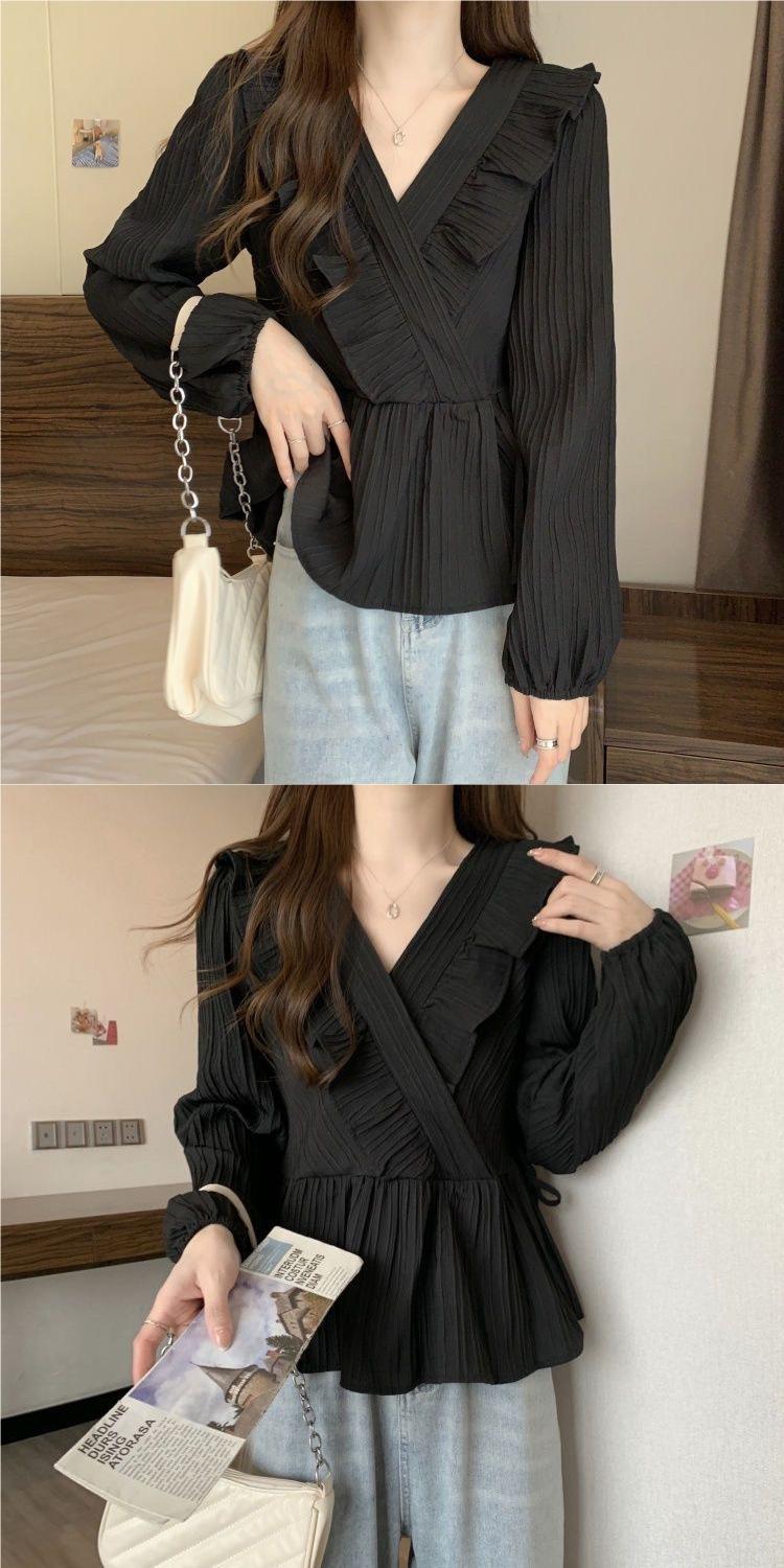 Talla Grande Nueva Camisa de Manga Larga con Cuello con Volantes para Mujer Otoño Temperamento Francés Reductor de Edad Cubre Vientre Top Adelgazante