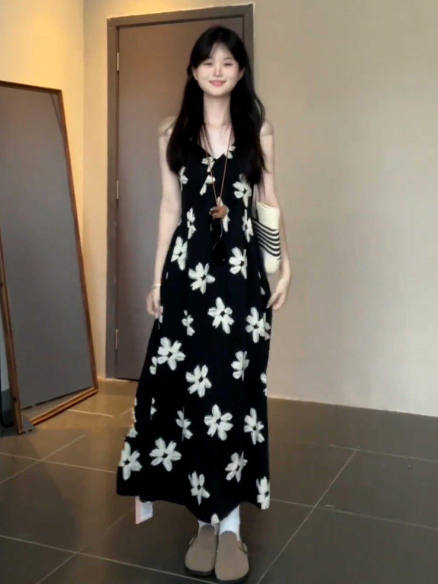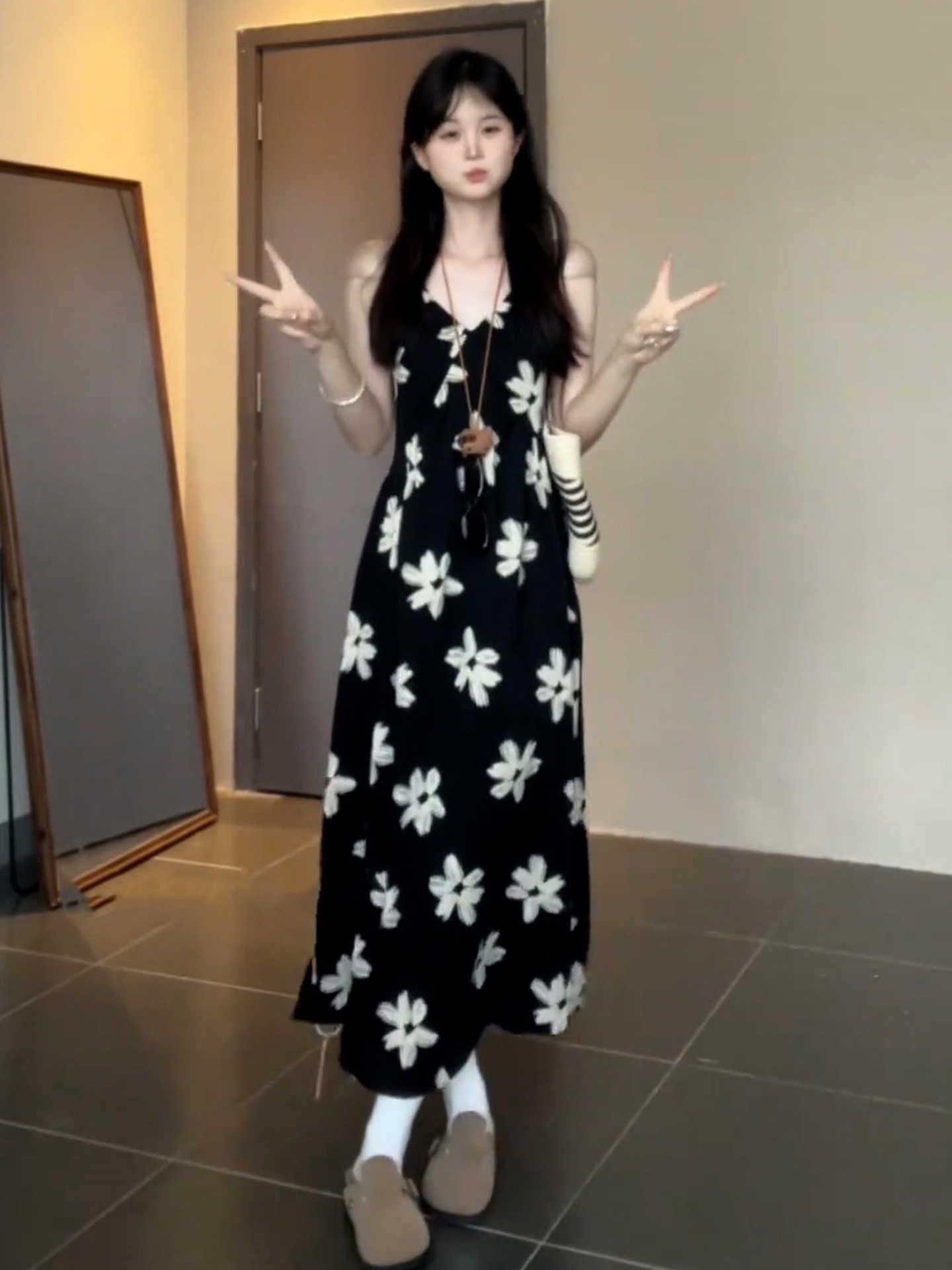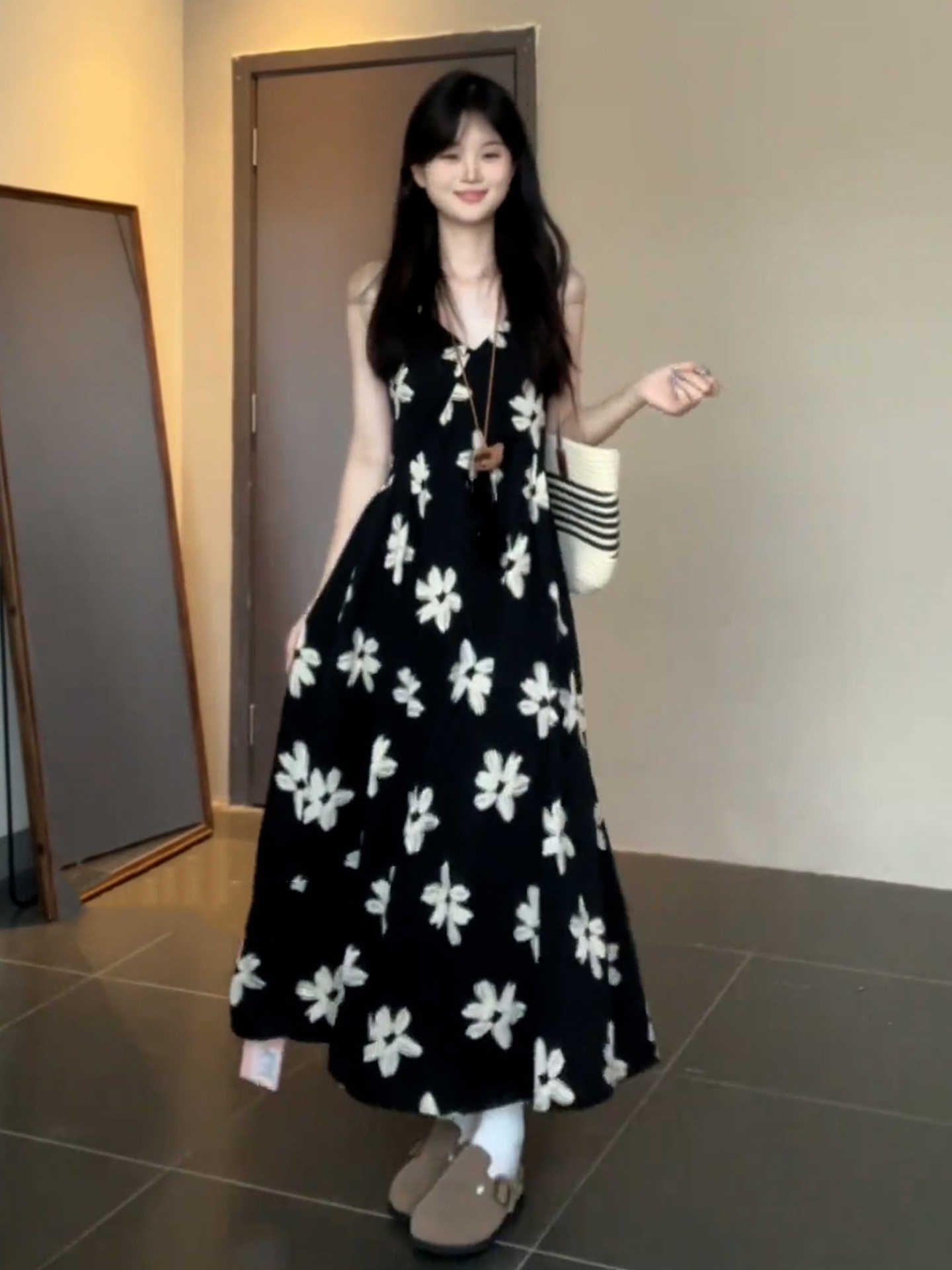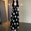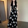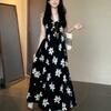 2025 nuevo vestido francés de vacaciones junto al mar negro de tirantes espagueti floral vestido largo de verano para mujer petite temperamento