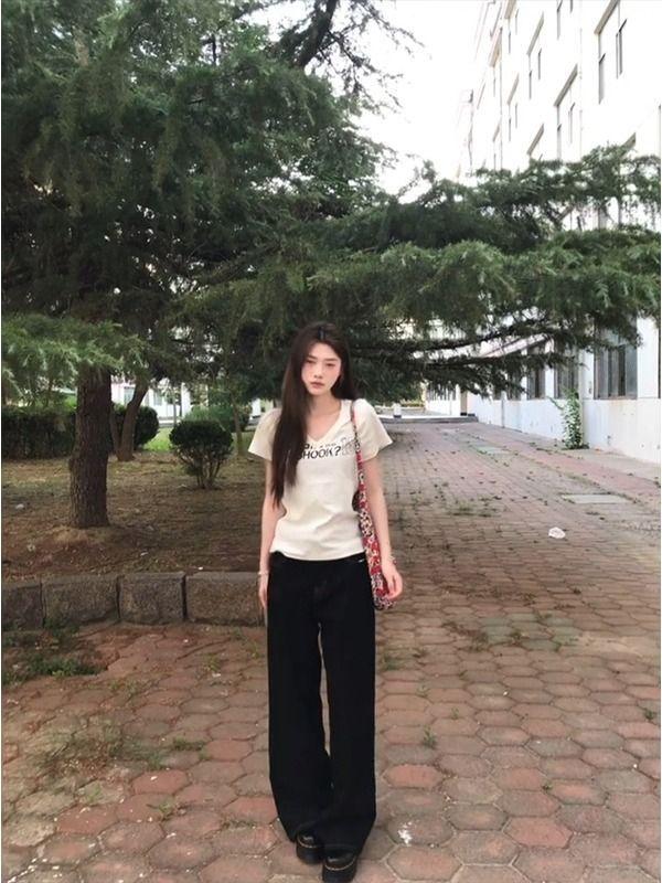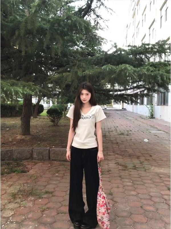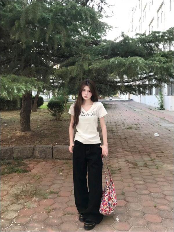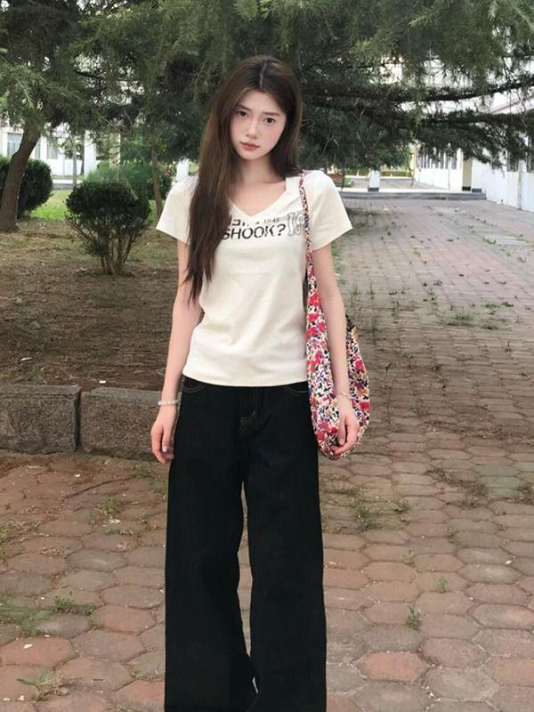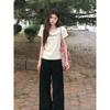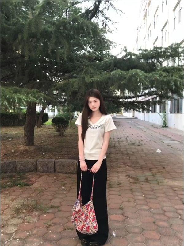 Camiseta de manga corta de algodón puro con cuello en V y hombro recto de nicho con sentido del diseño para mujer, verano, chica caliente americana, corte corto ajustado adelgazante, top