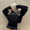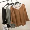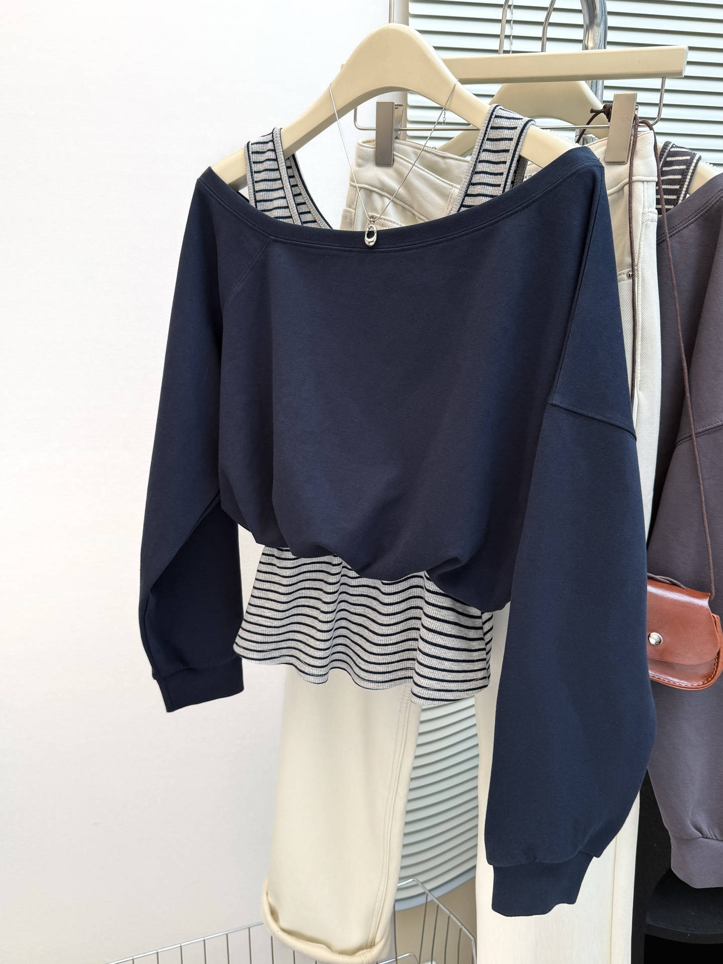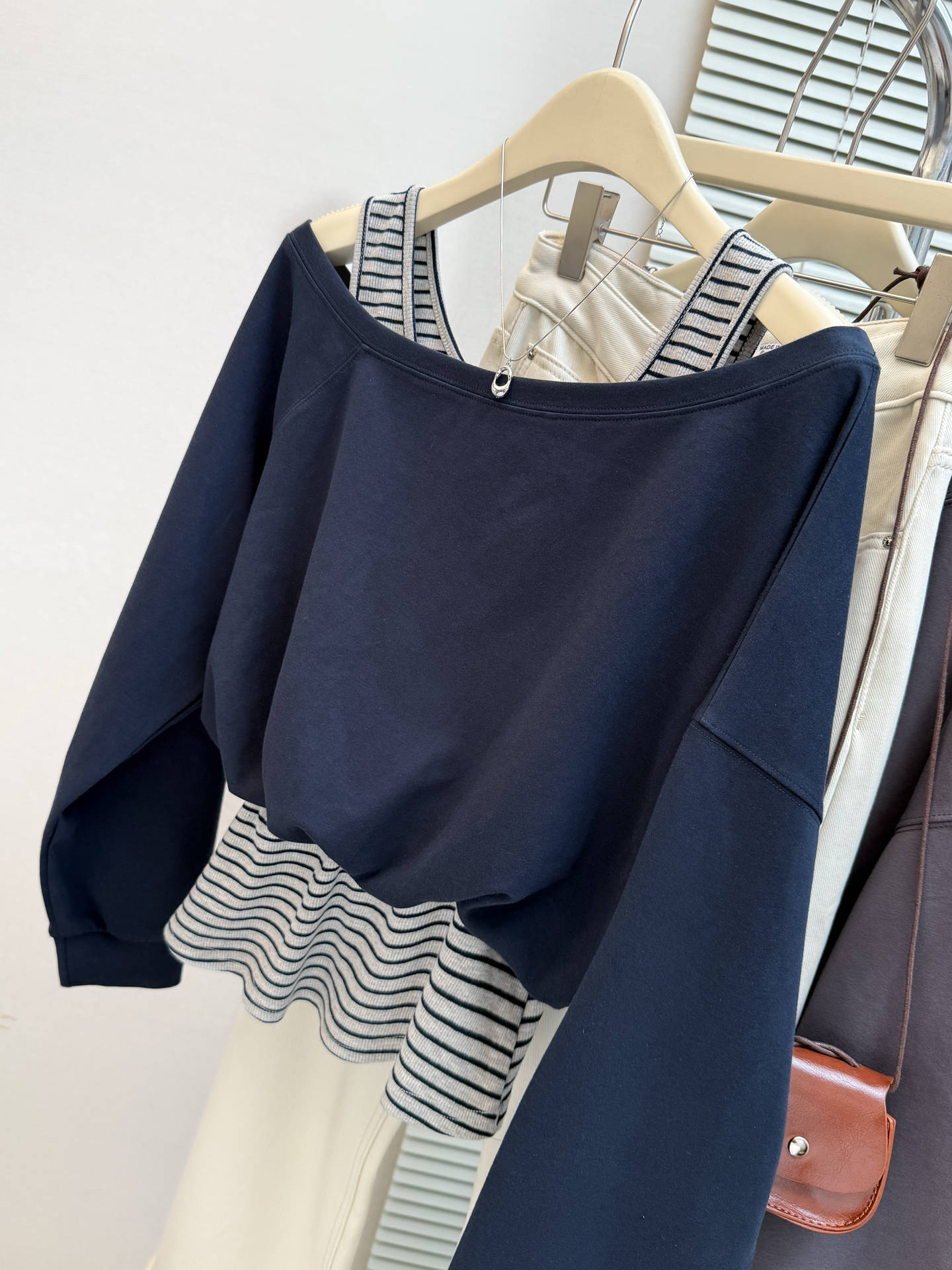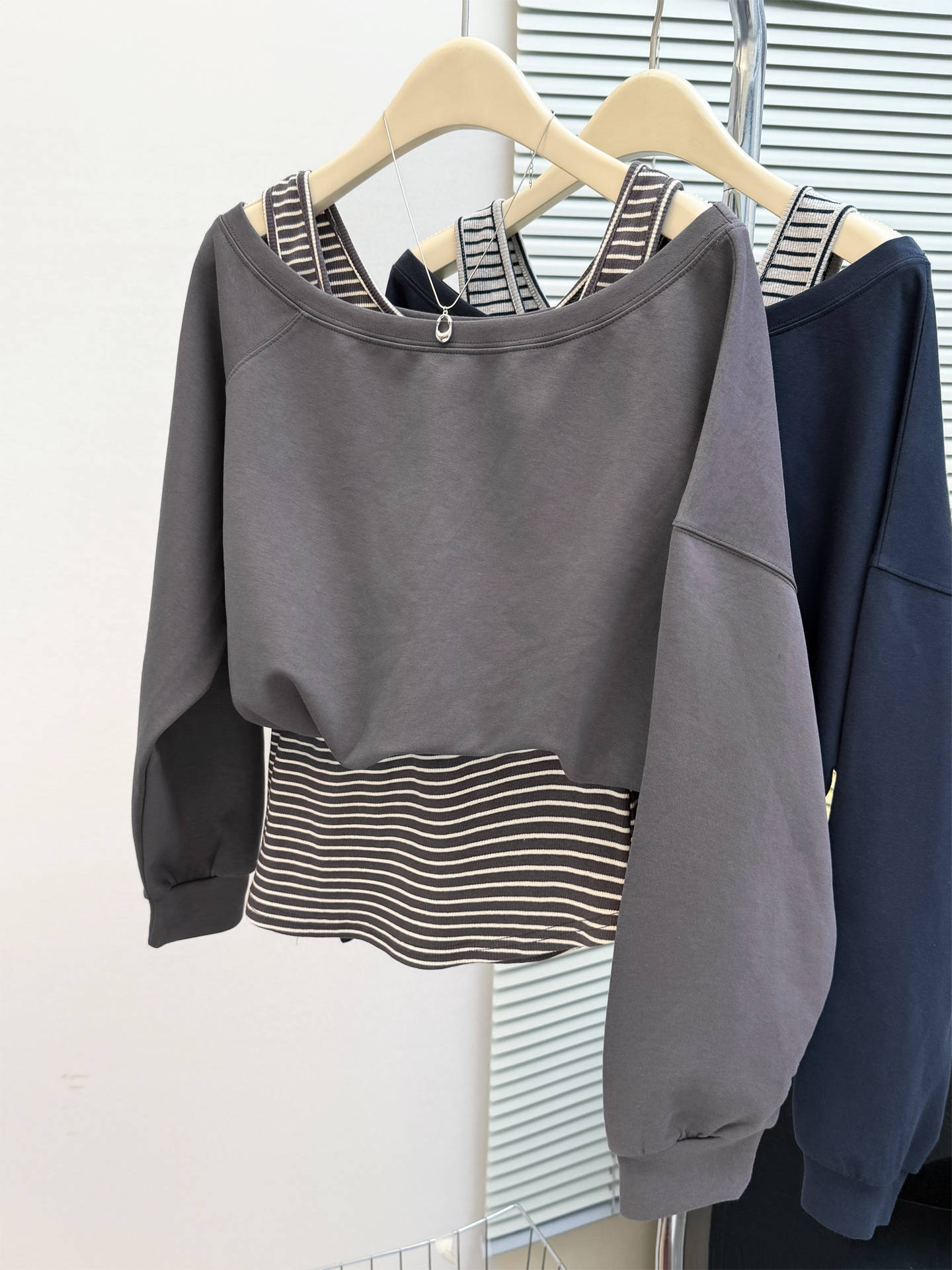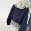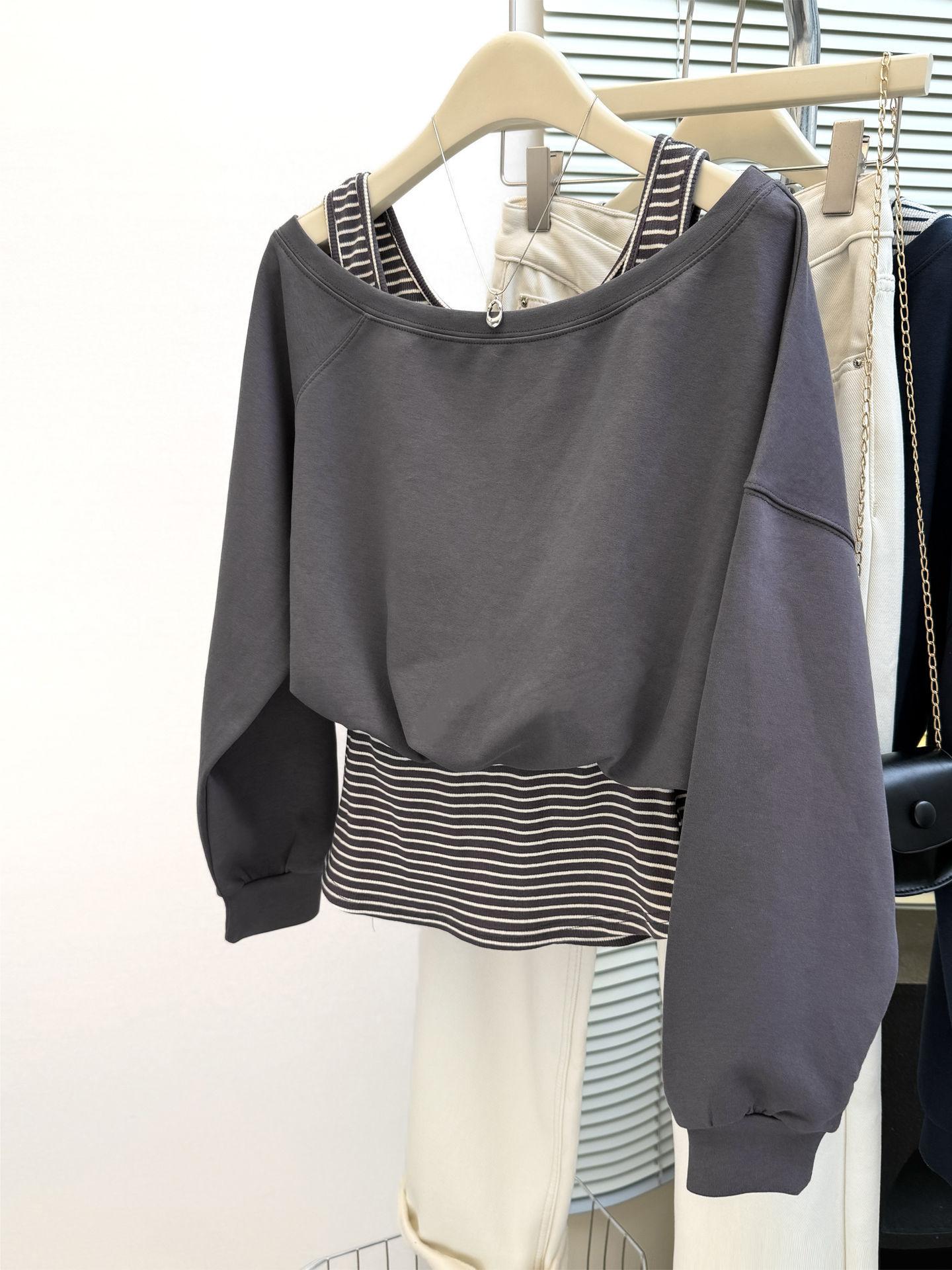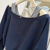 Sudadera de Manga Larga Empalmada de Dos Piezas Falsas de Comercio Exterior para Mujer Primavera Temprana y Otoño Holgada Estilo Coreano Top Rayado con Hombros Descubiertos
