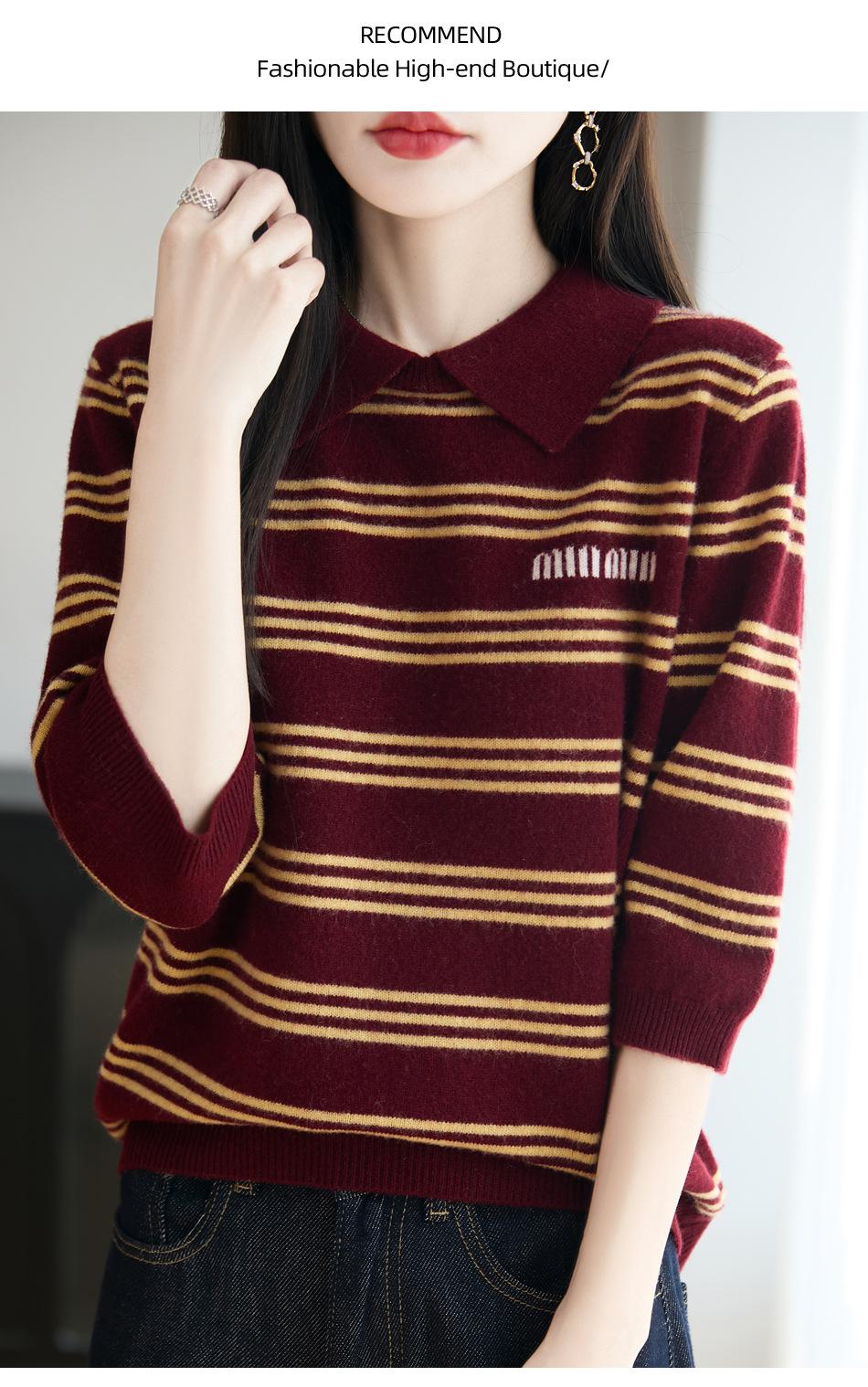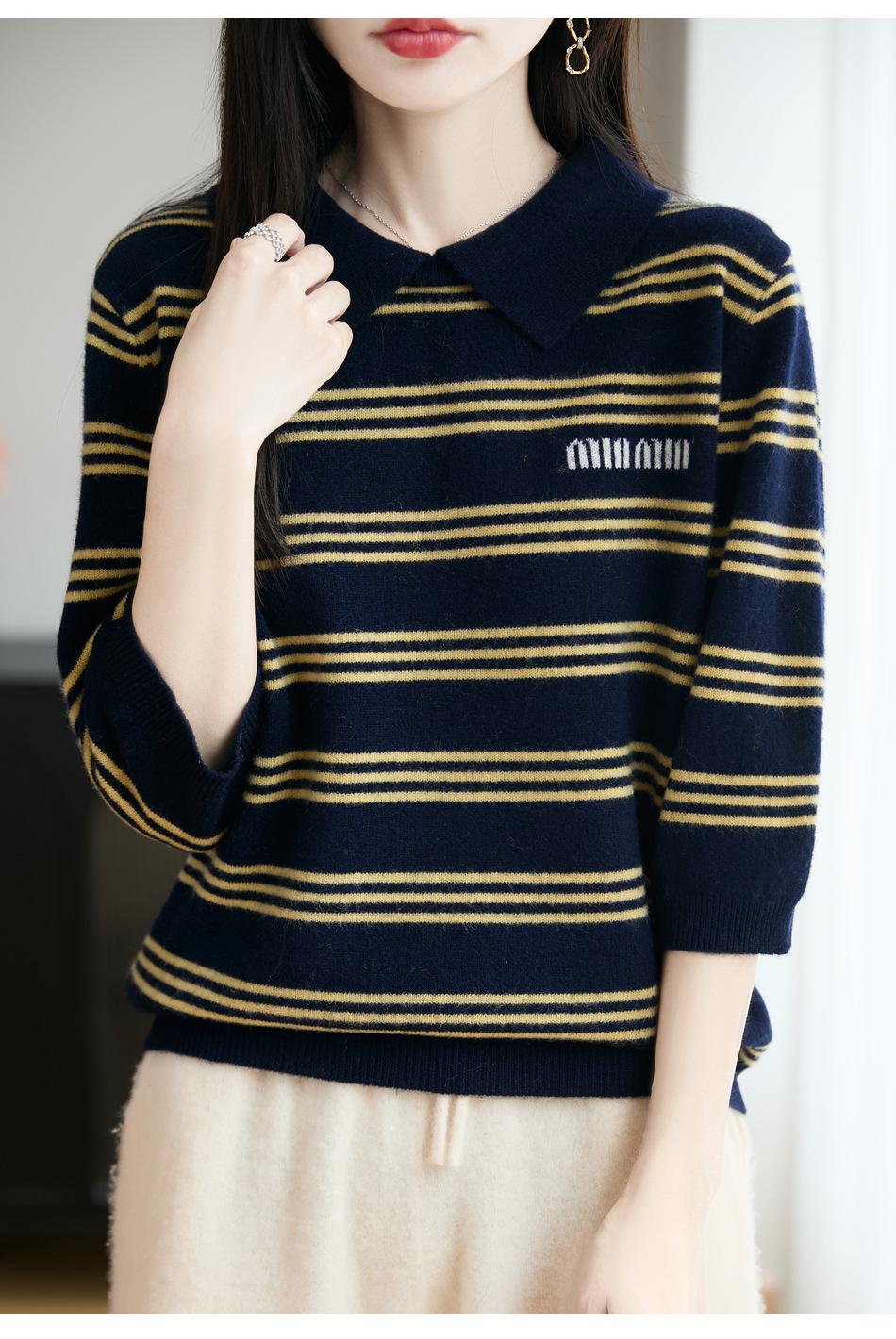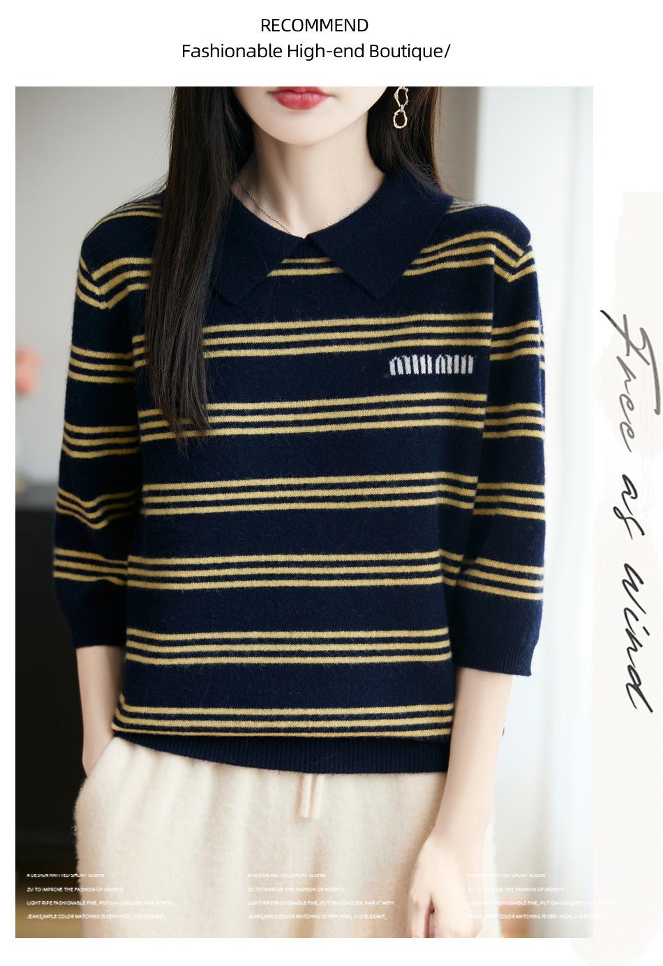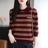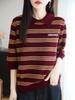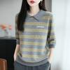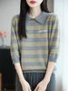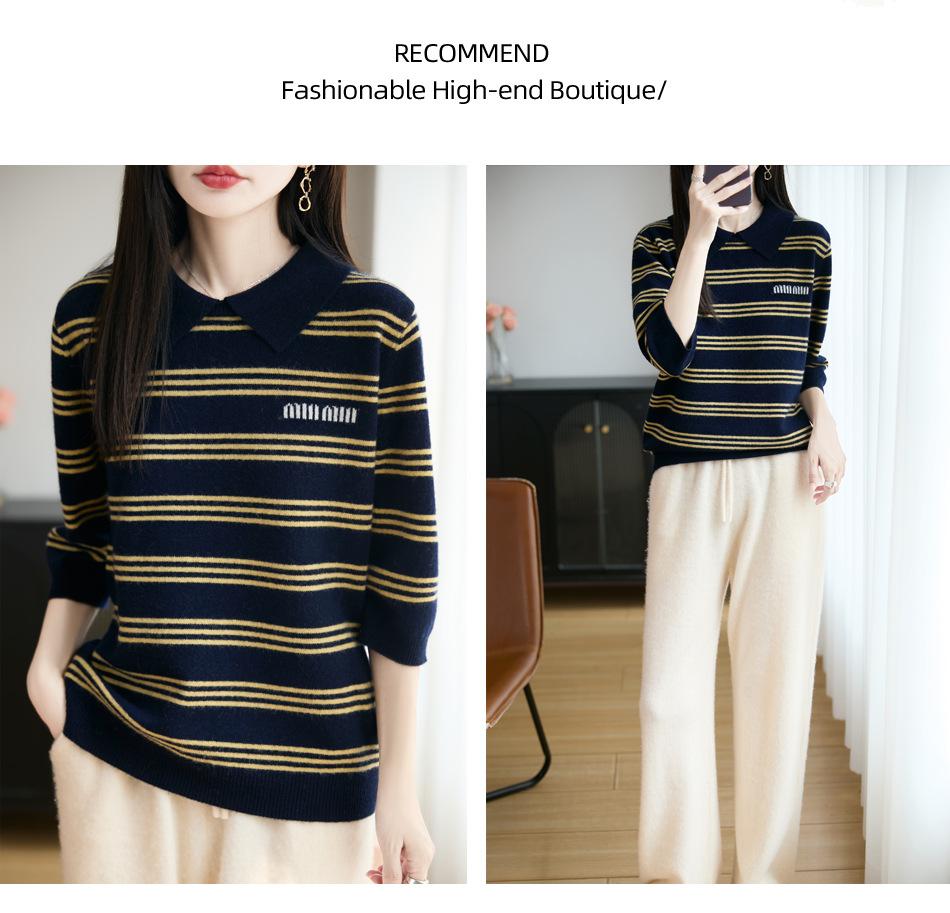 2025 Otoño/Invierno Nuevo Tejido de Punto de Lana Pura con Cuello Vuelto Manga Cinco Cuartos para Mujer Camisa Básica Rayada con Bloques de Color y Letra Bordada