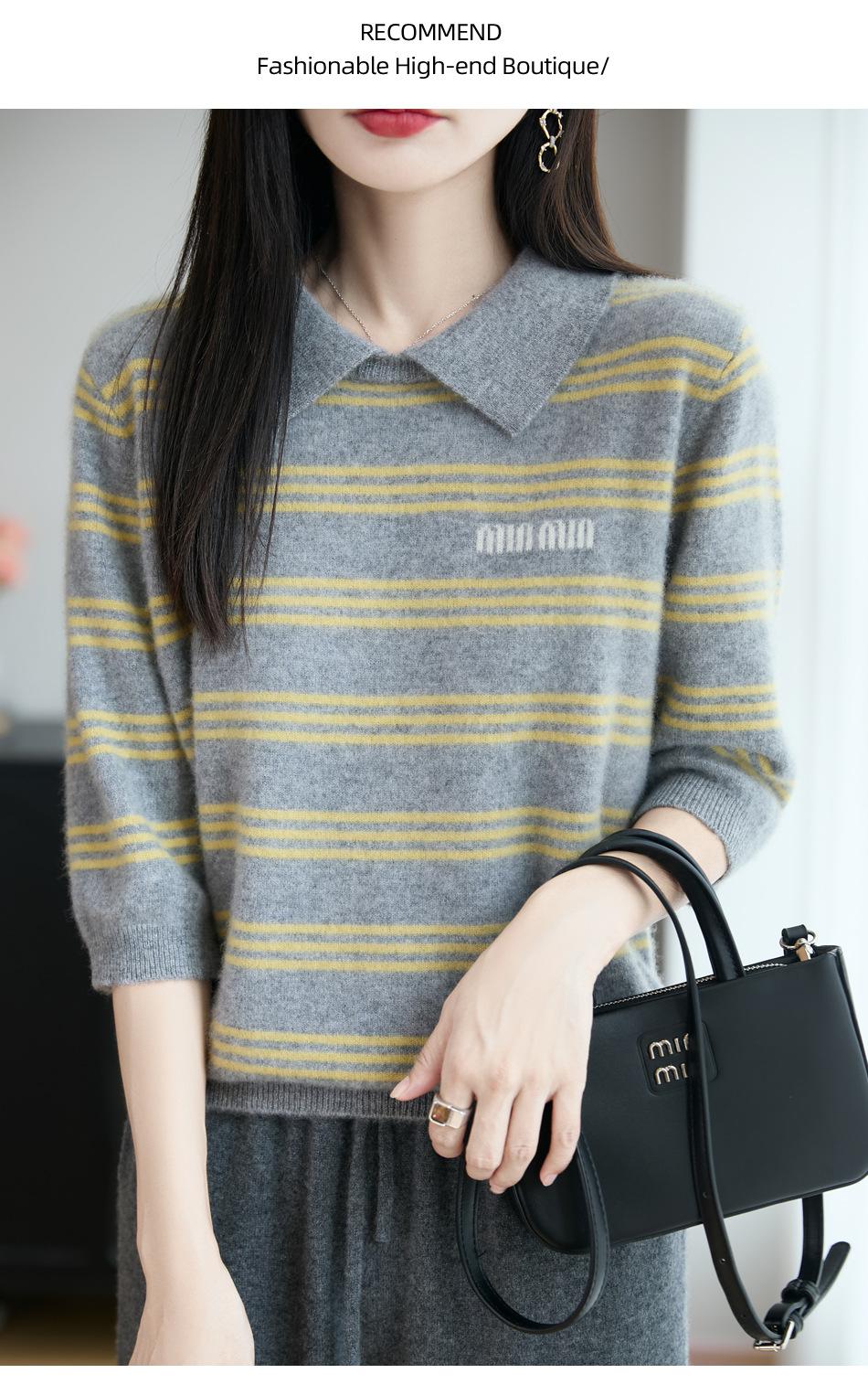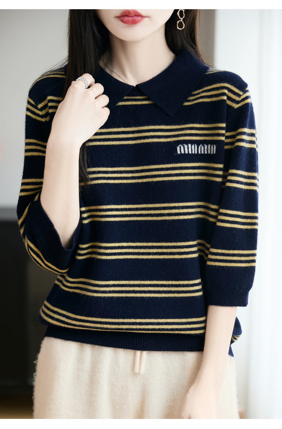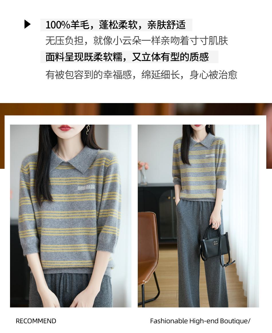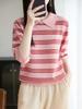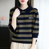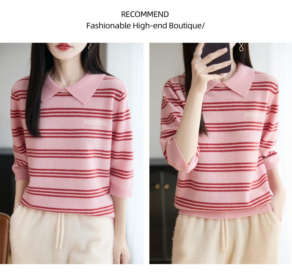2025 Otoño/Invierno Nuevo Tejido de Punto de Lana Pura con Cuello Vuelto Manga Cinco Cuartos para Mujer Camisa Básica Rayada con Bloques de Color y Letra Bordada