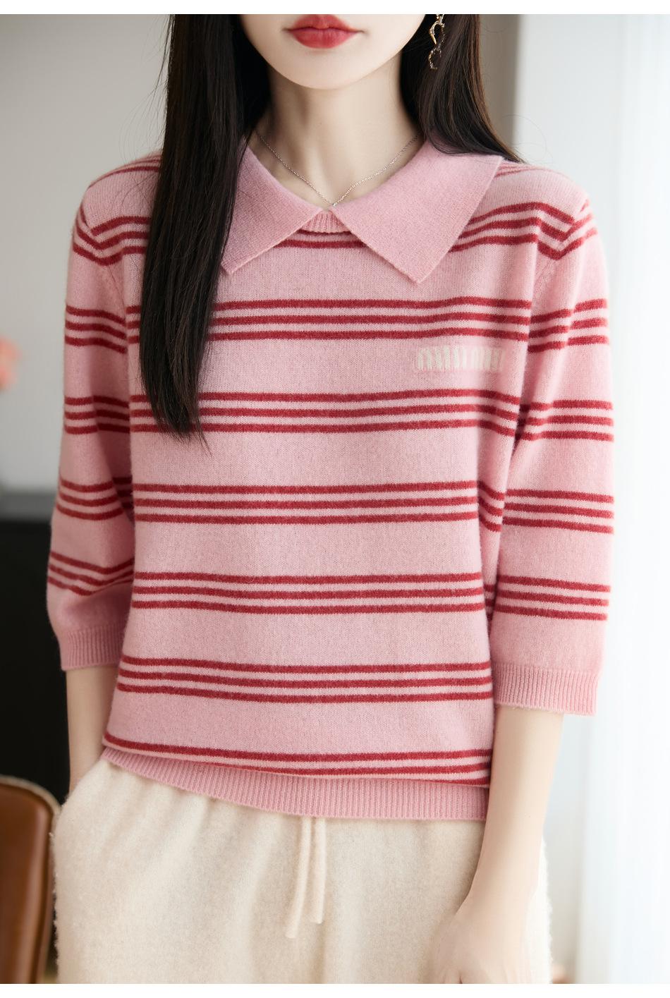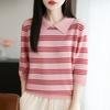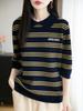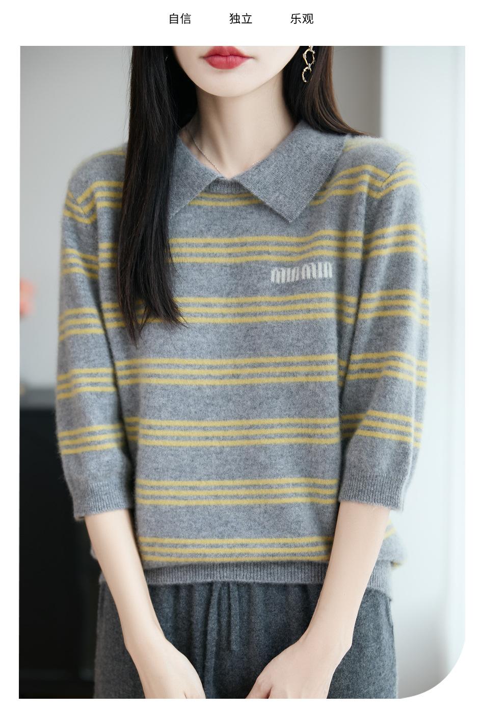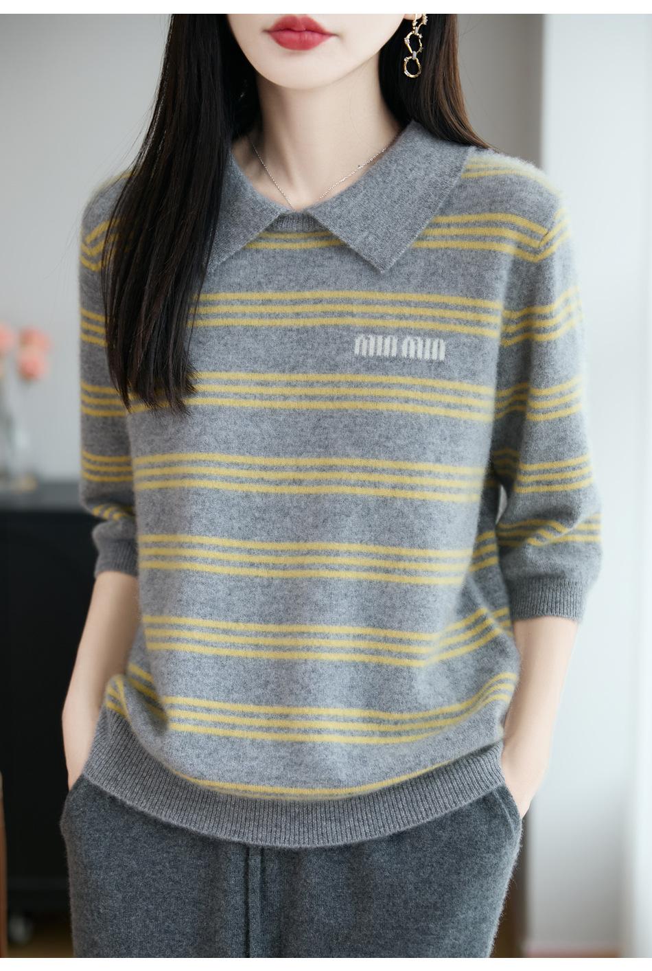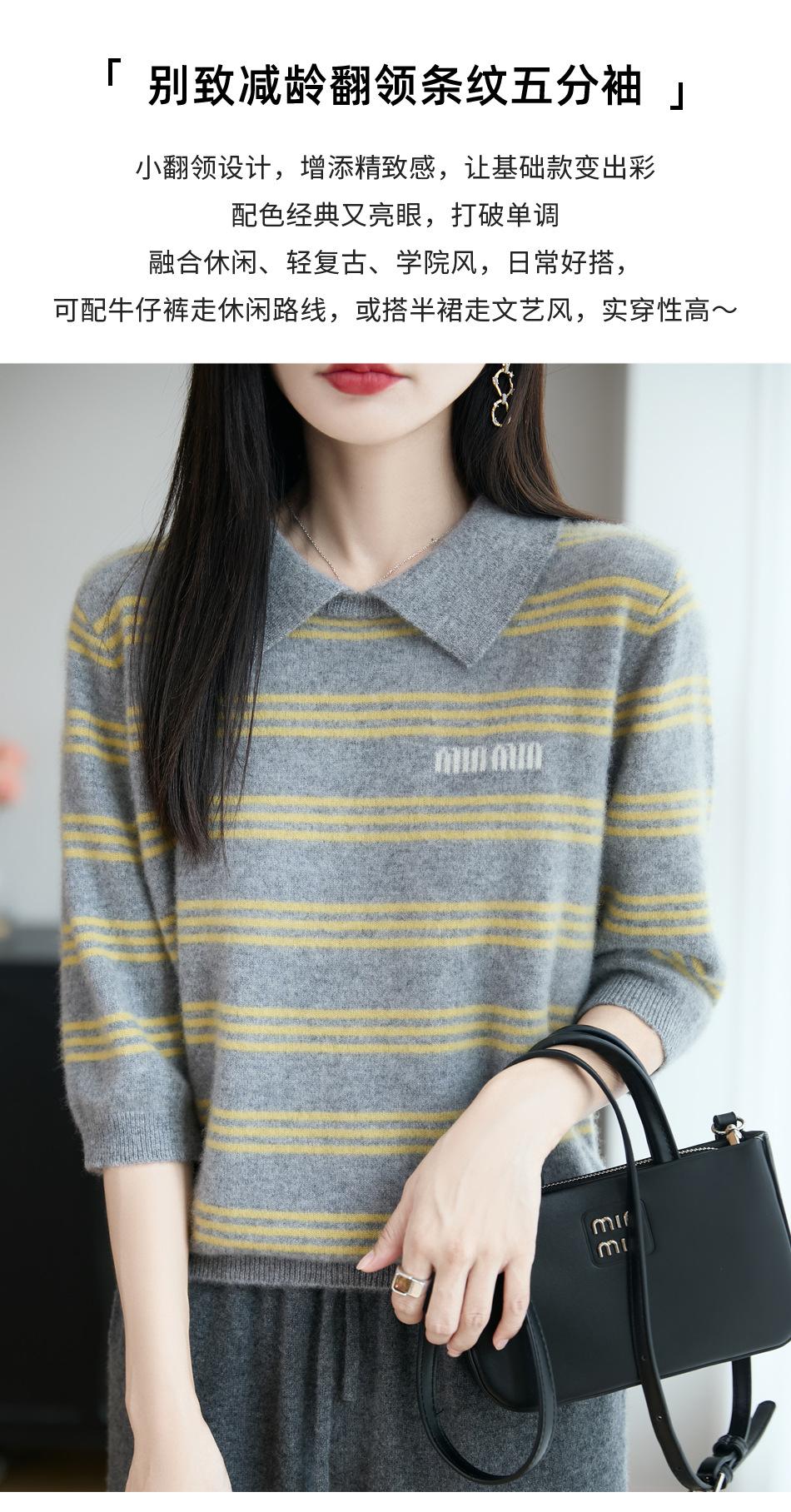 2025 Otoño/Invierno Nuevo Tejido de Punto de Lana Pura con Cuello Vuelto Manga Cinco Cuartos para Mujer Camisa Básica Rayada con Bloques de Color y Letra Bordada