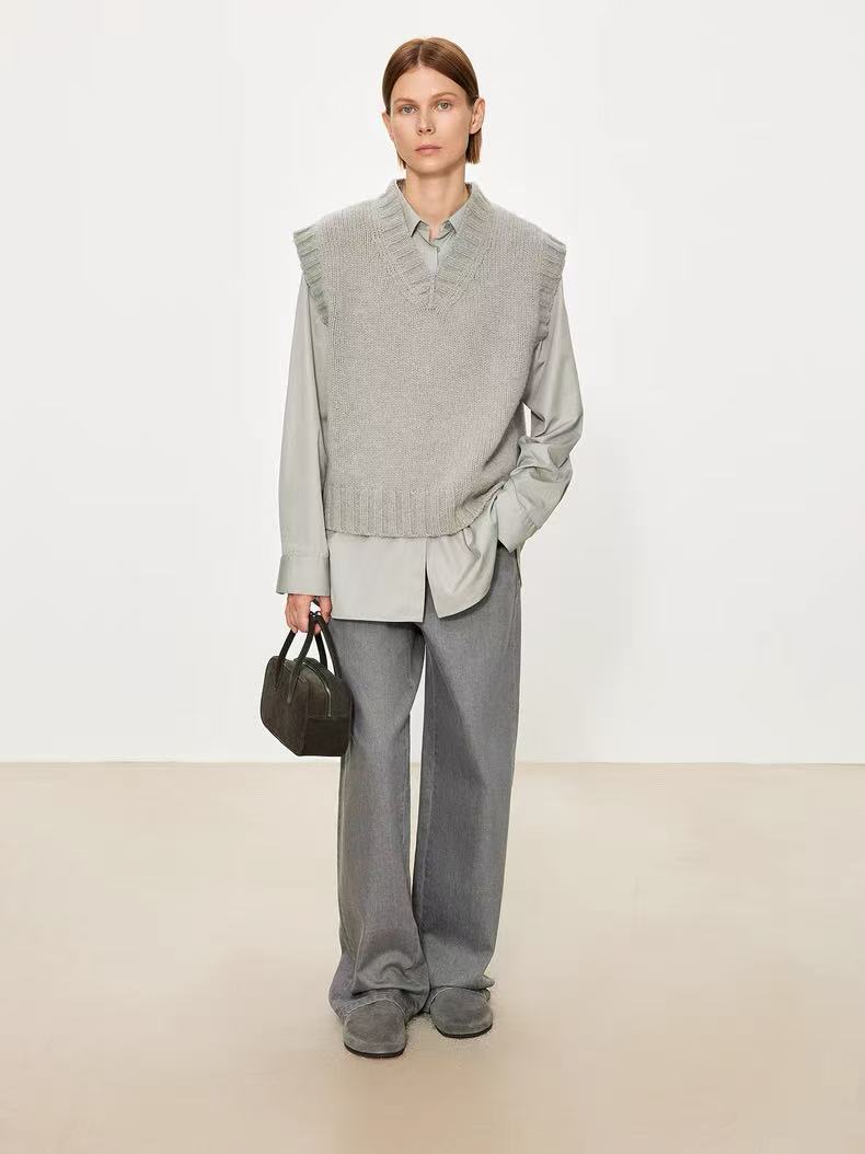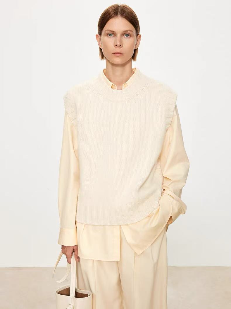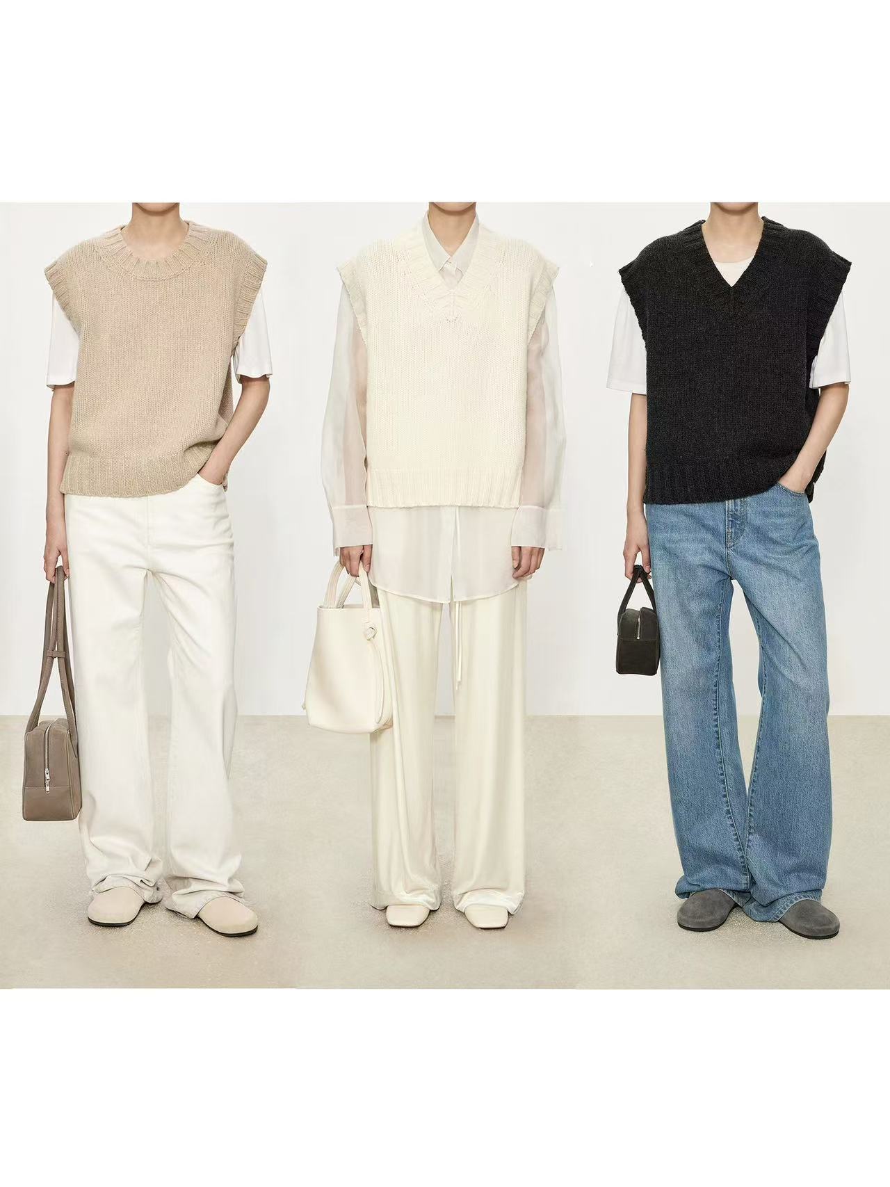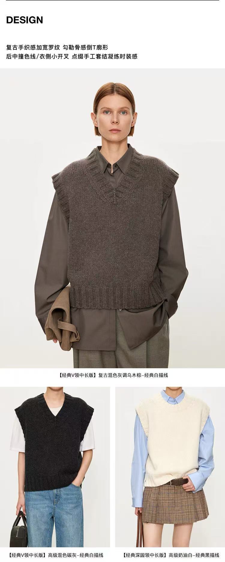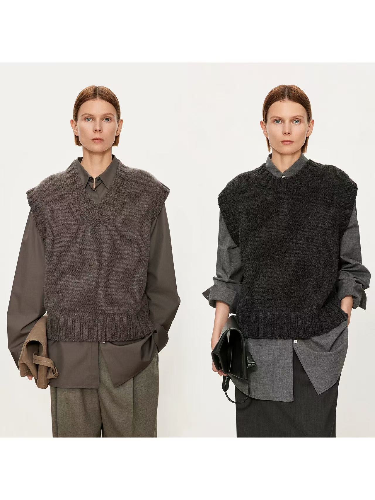 25 Otoño/Invierno Nuevo Chaleco de Punto de Lana Pura para Mujer Cuello en V Color Sólido Jersey Holgado Sin Mangas Holgado Camiseta Básica