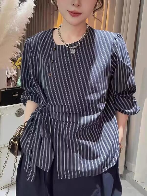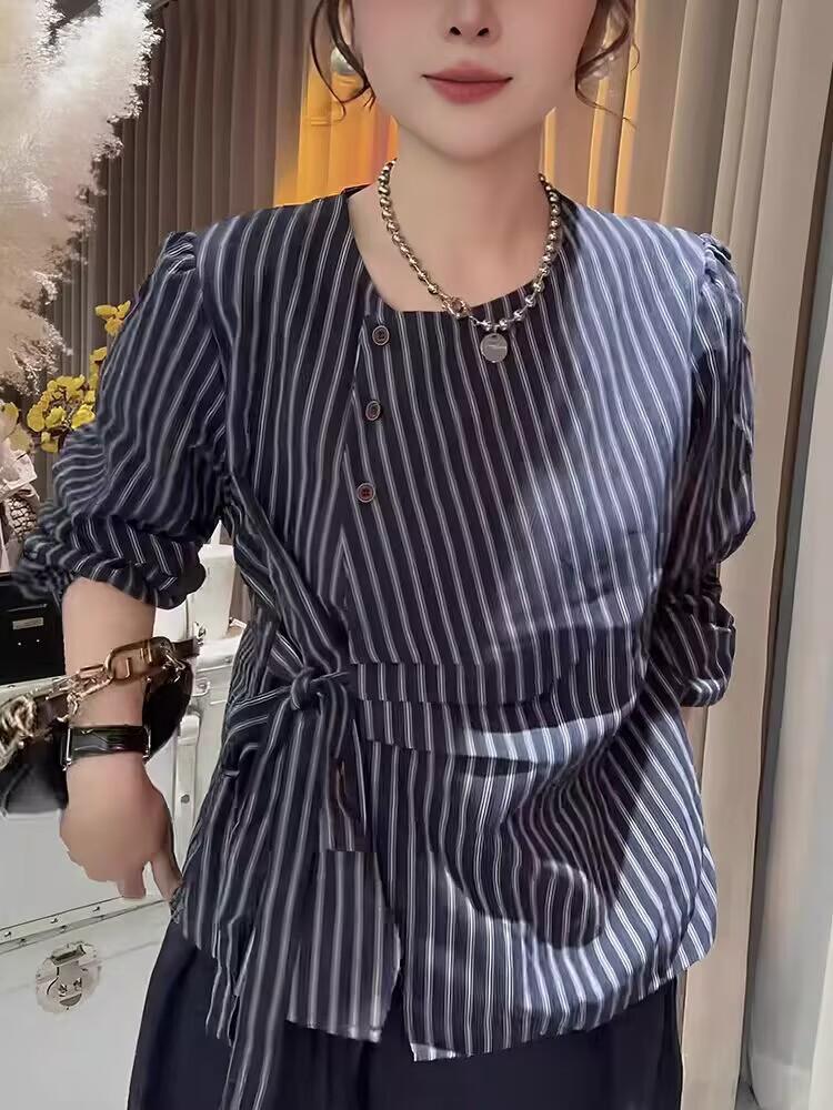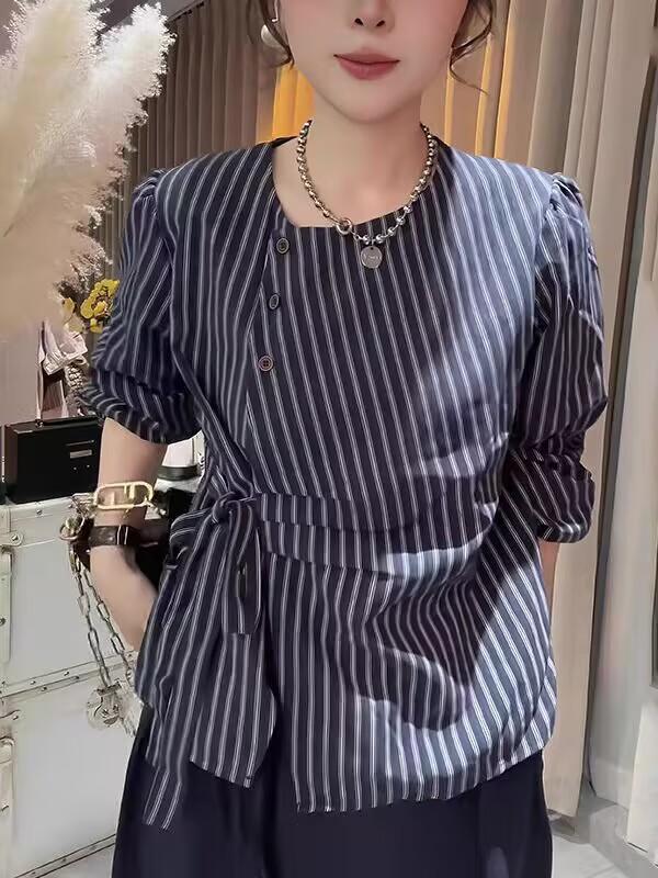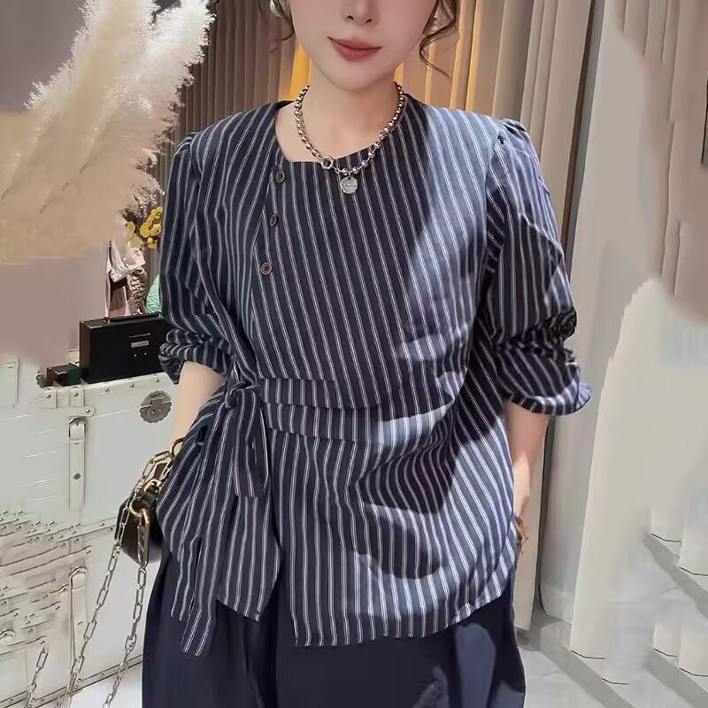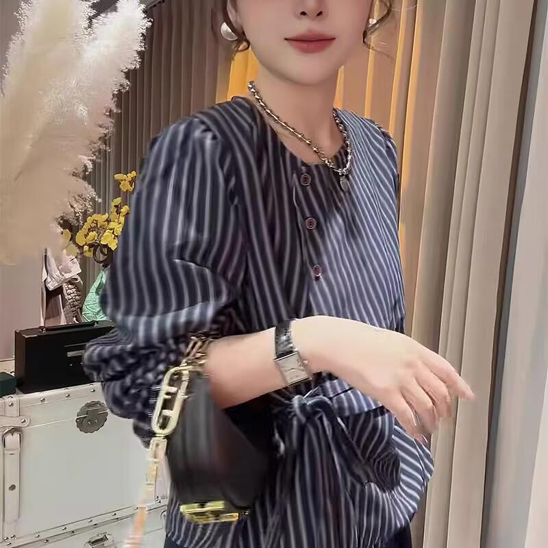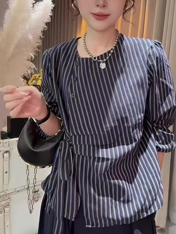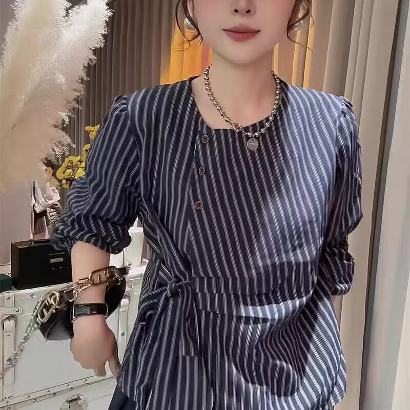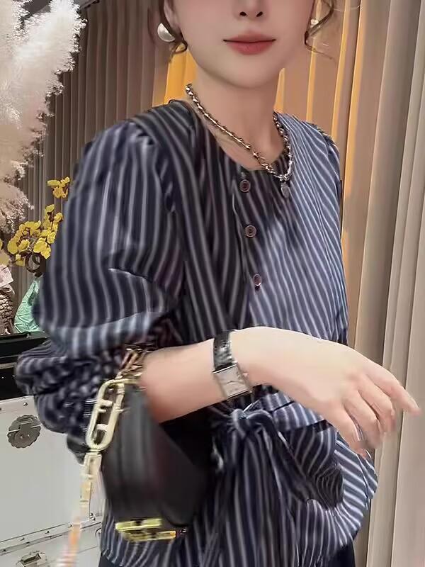 Top de Moda de Alta Gama Otoño Temprano 2025 Estilo Perezoso de Alta Gama Camisa de Diseño Rayado Estilo Francés Elegante Maduro Ligero Tendencia