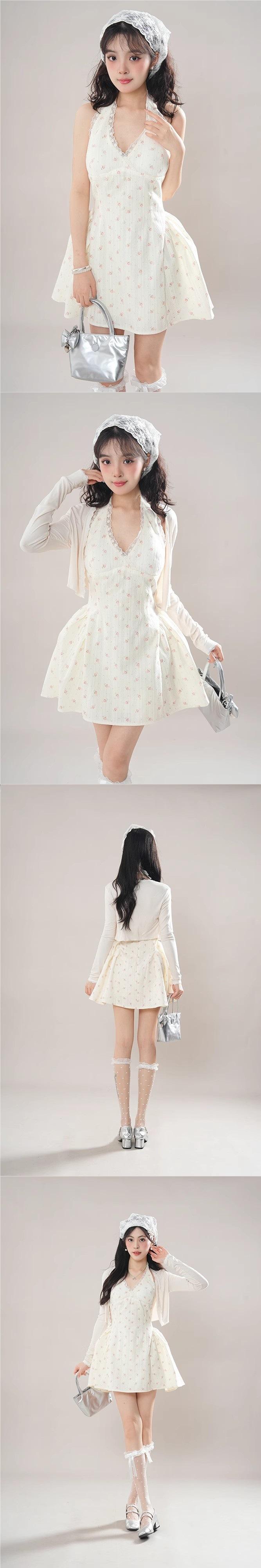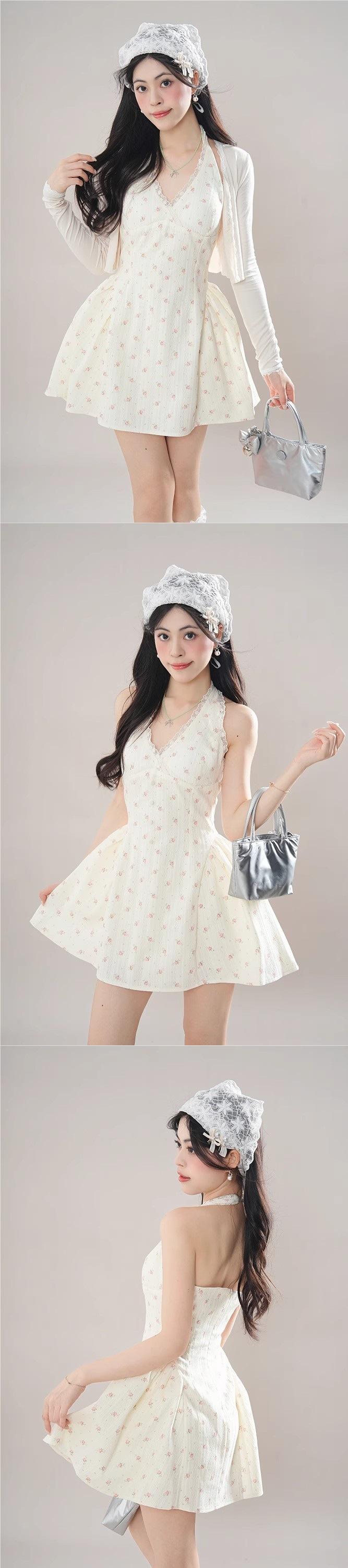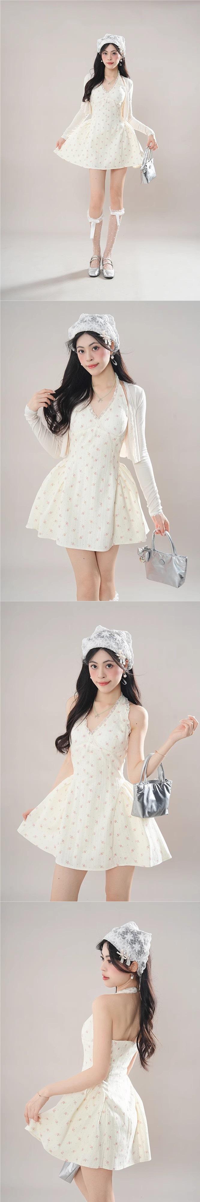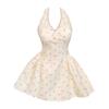 Vestido Halter con Encaje Patchwork sin Espalda con Cuello en V para Mujer Verano Ajustado Floral Dulce Cintura Ceñida Falda Corta Abullonada
