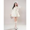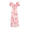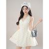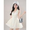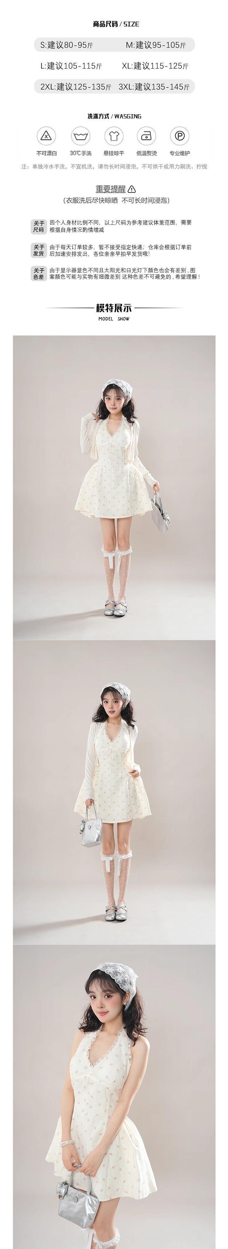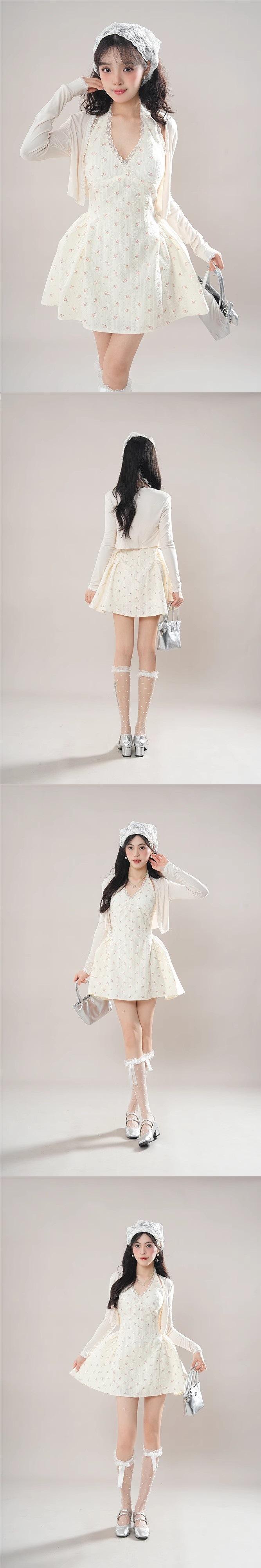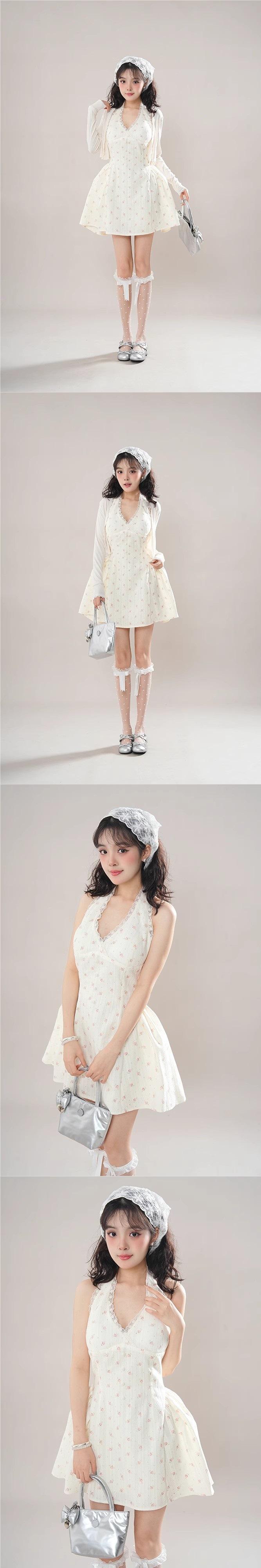 Vestido Halter con Encaje Patchwork sin Espalda con Cuello en V para Mujer Verano Ajustado Floral Dulce Cintura Ceñida Falda Corta Abullonada