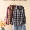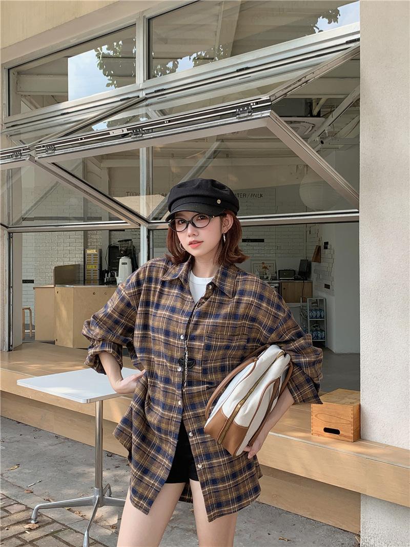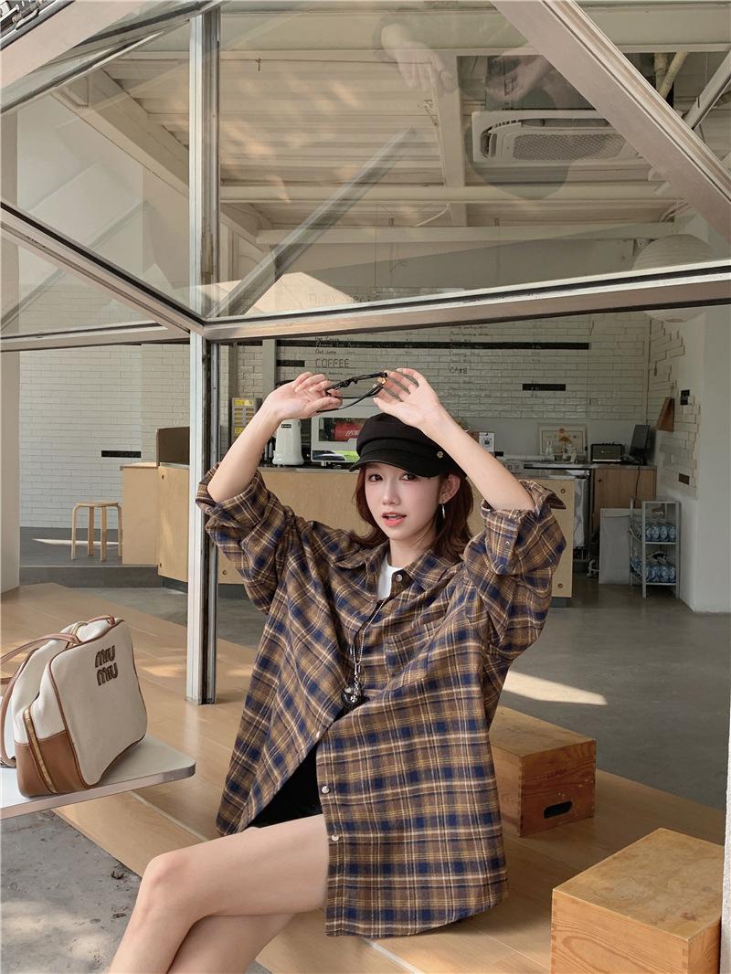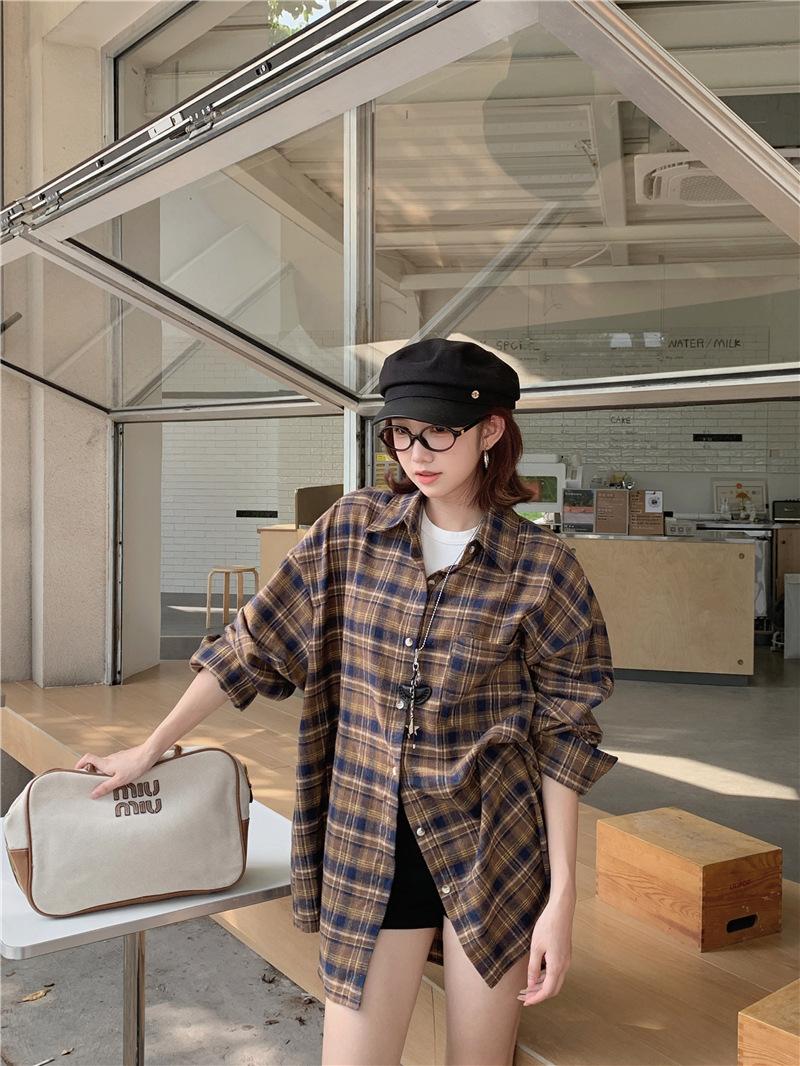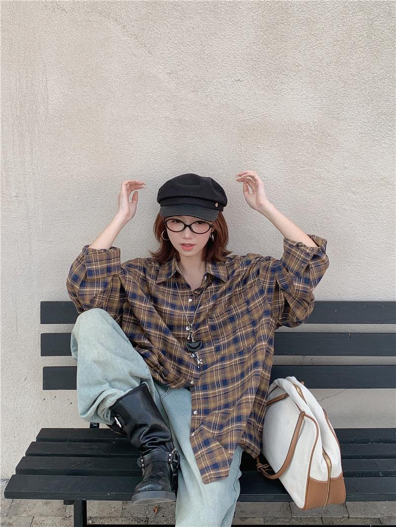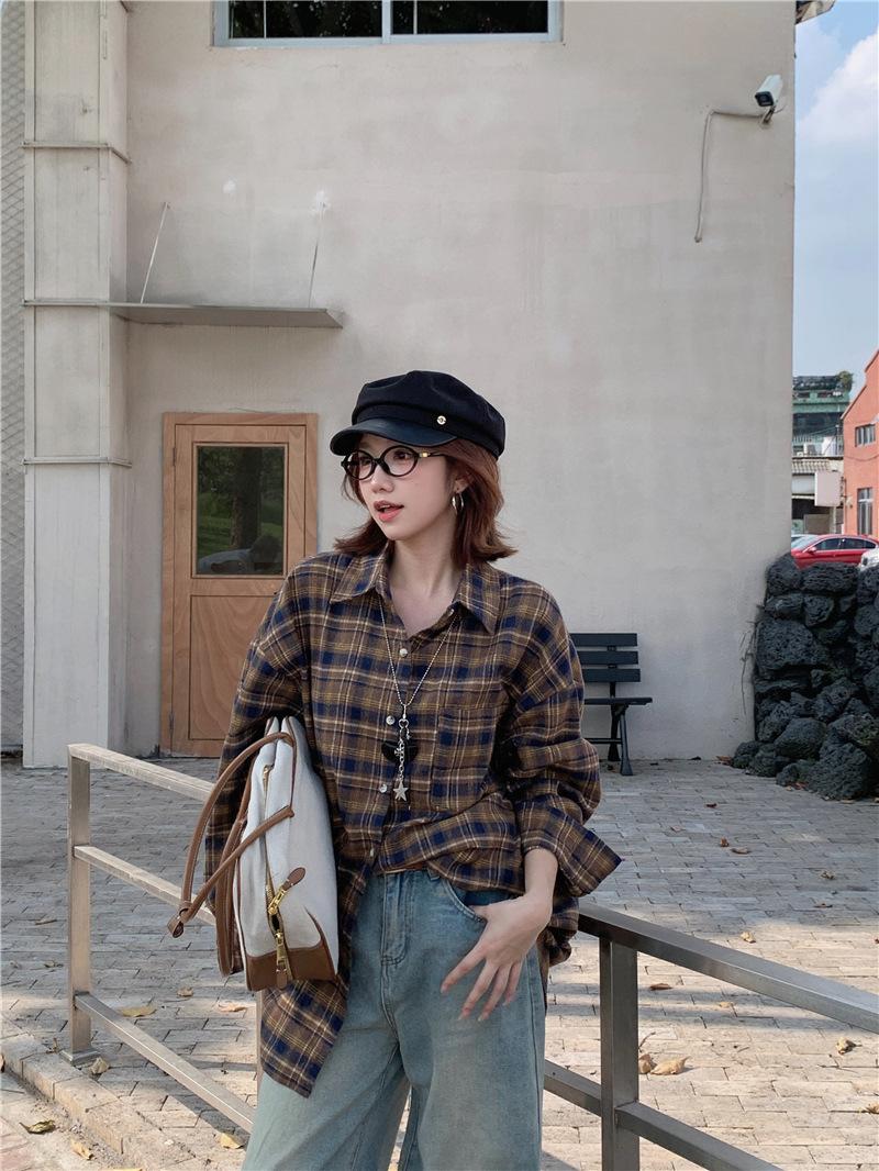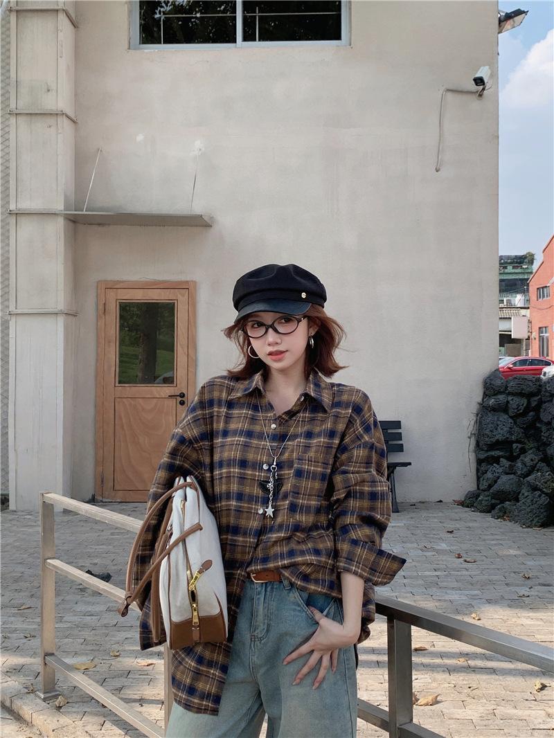Foto Real Ropa de Mujer Estilo Coreano 2025 Otoño Nuevo Retro Suelto Versátil Camisa de Manga Larga a Cuadros