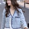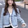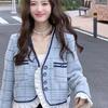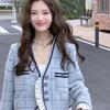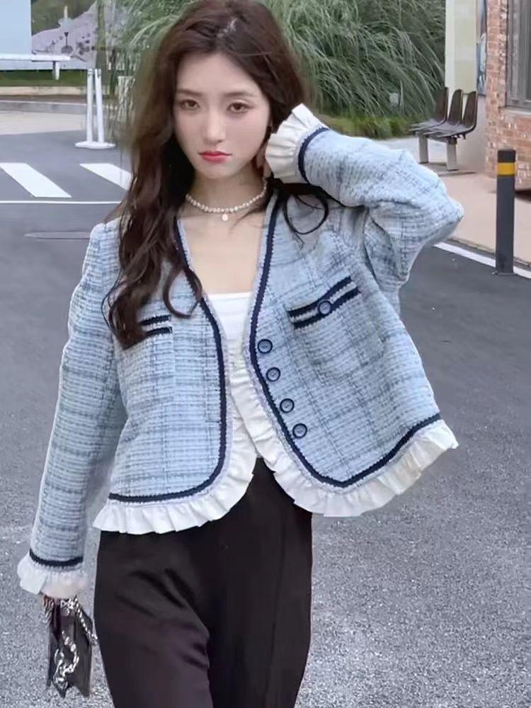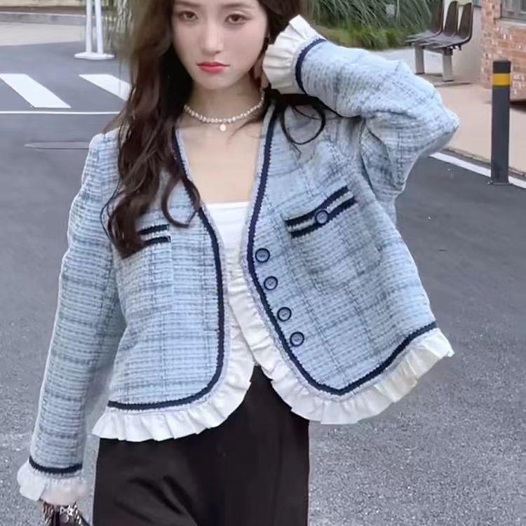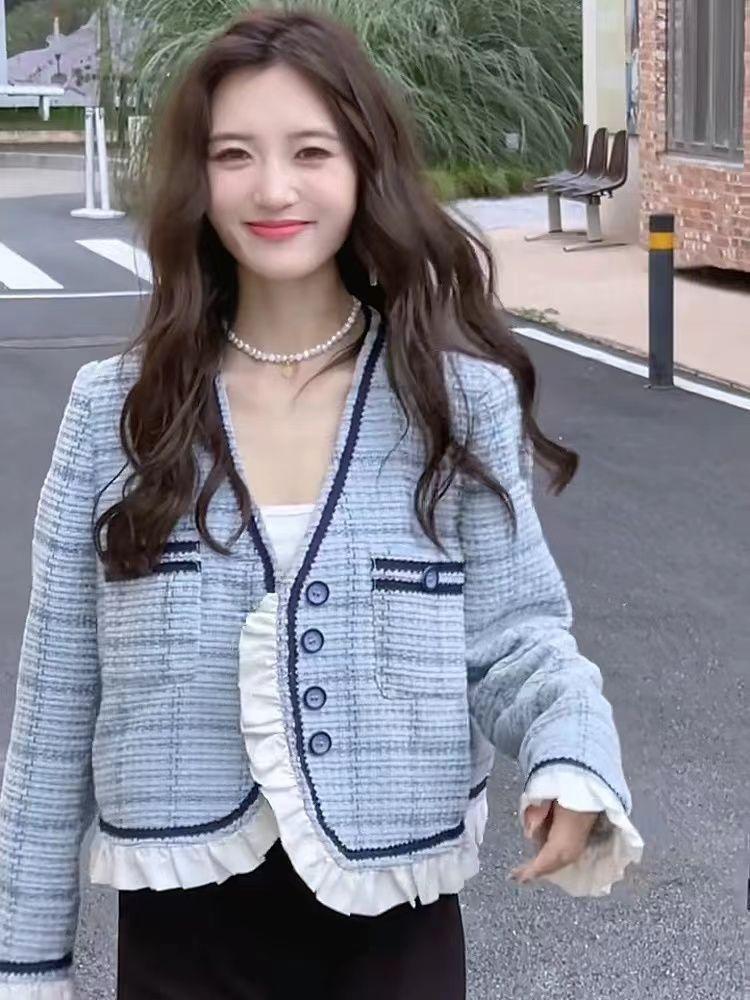 Chaqueta Corta para Mujer 2025 Patchwork a Cuadros Adelgazante Encaje Vintage Volante Temperamento Dulce Estilo Pequeño Fragante Top para Mujer Nuevo