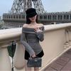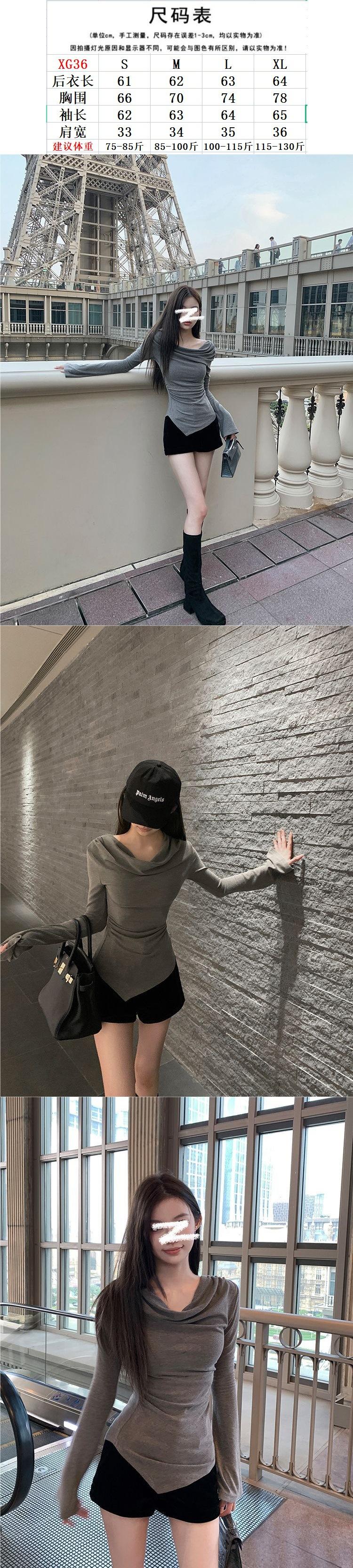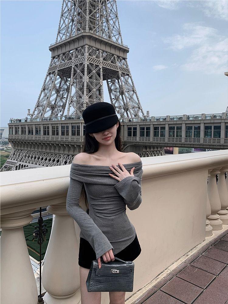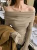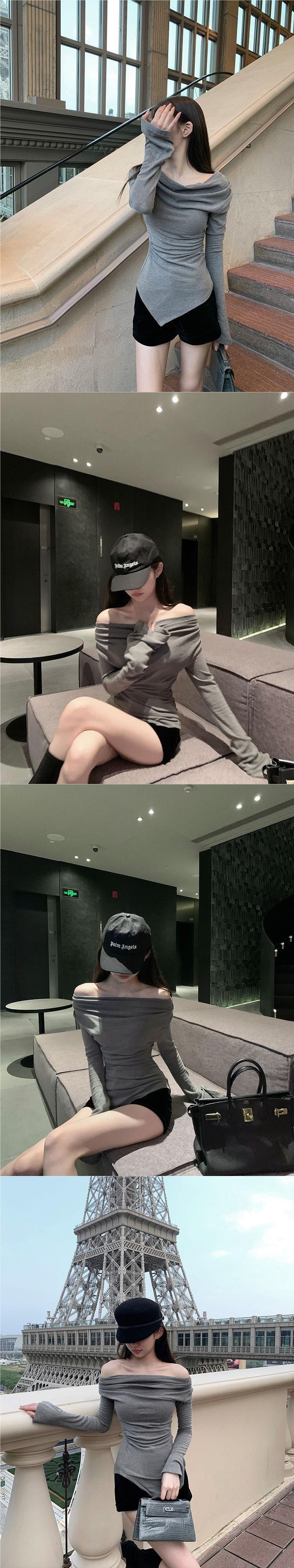 Camiseta de Manga Larga Irregular con Nicho de Sentido del Diseño para Mujer Primavera y Otoño Nuevo Estilo Camiseta Base Ajustada Top de un Hombro Descubierto
