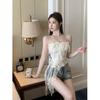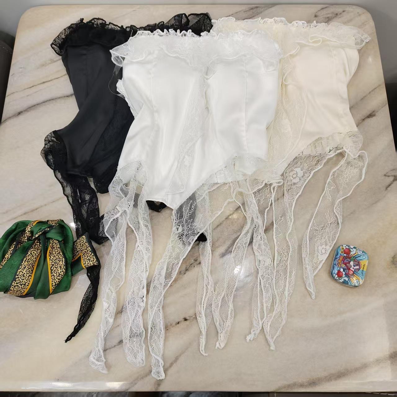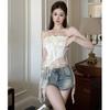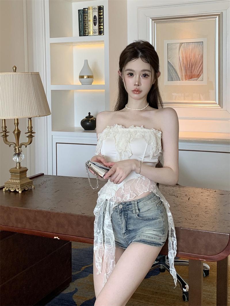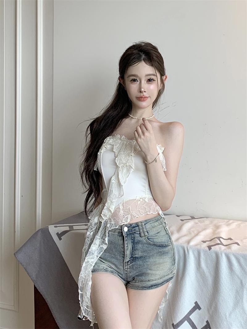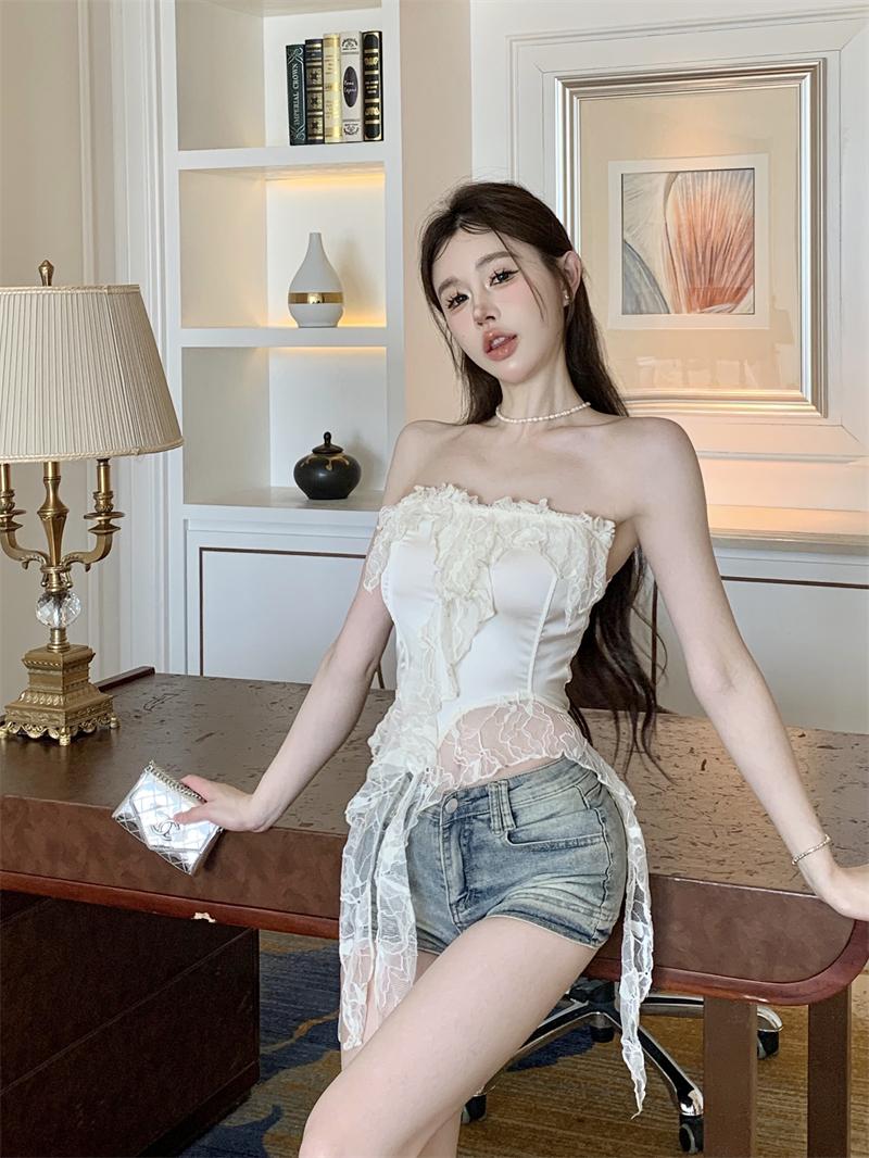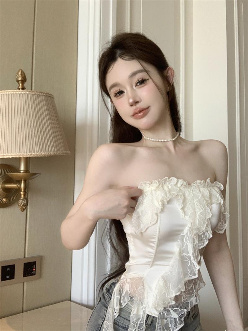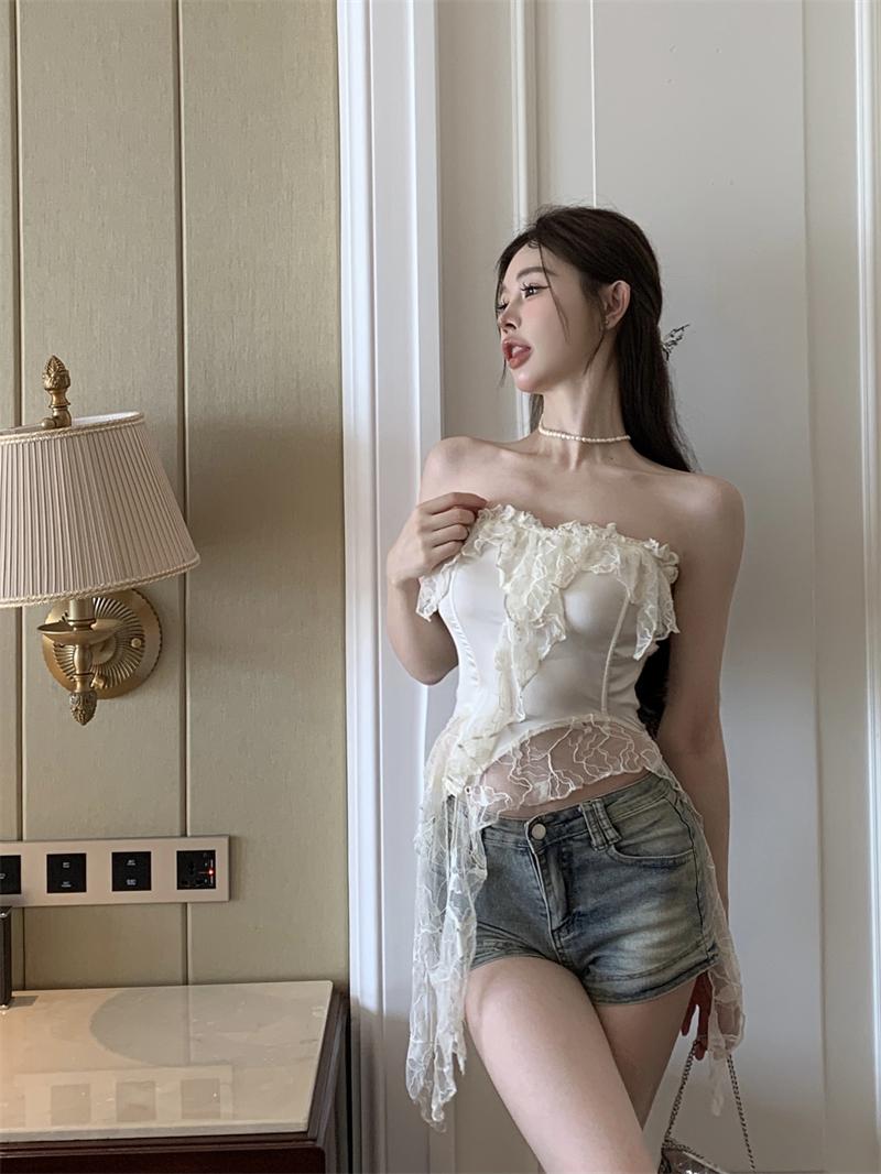 Deseo Puro Sexy Top de Tubo con Volantes sin Mangas para Mujer, Ropa Exterior de Verano, Chaleco Corto Irregular de Encaje con Cinta