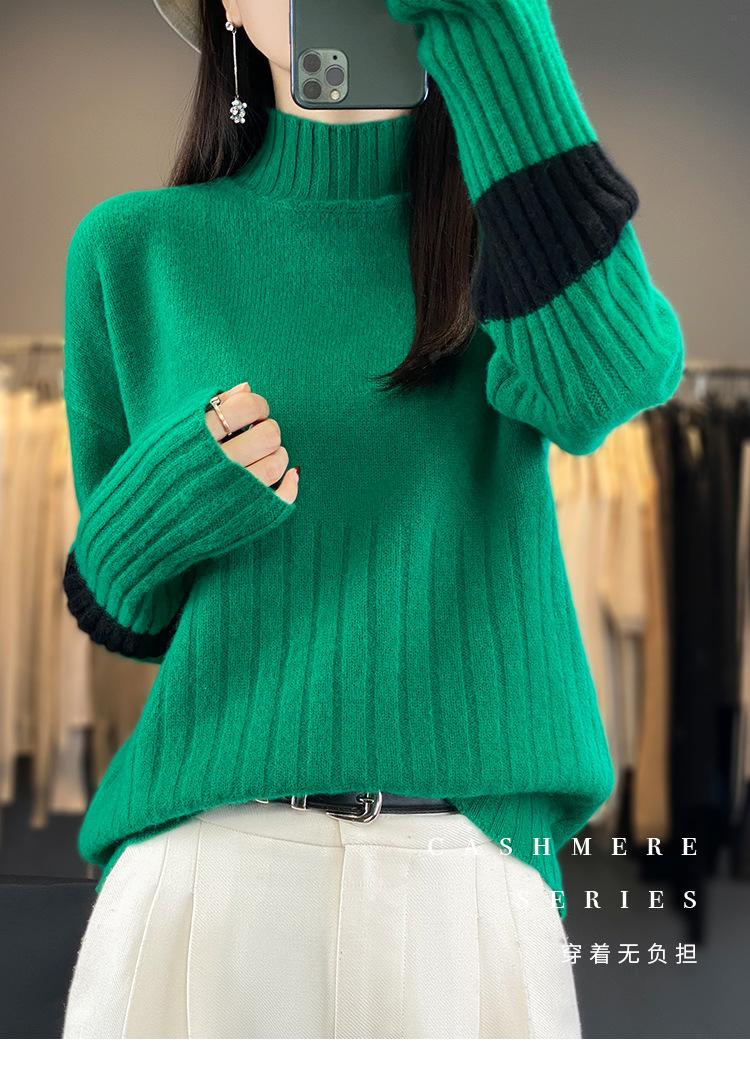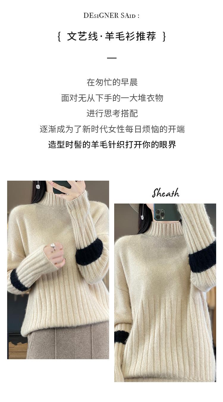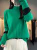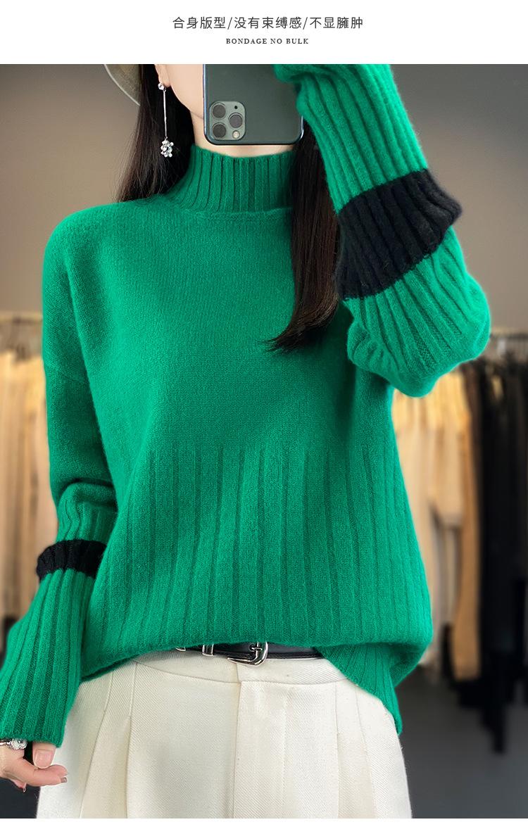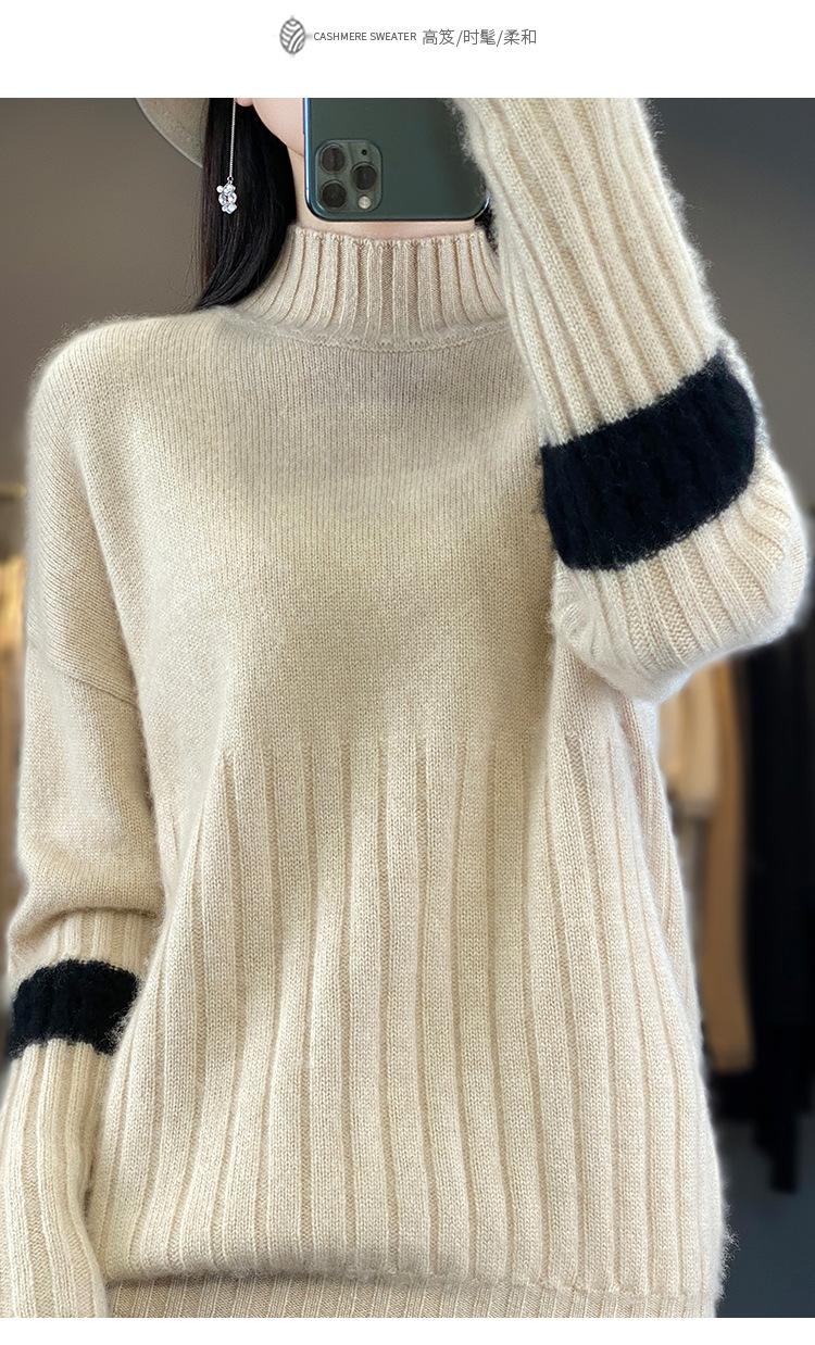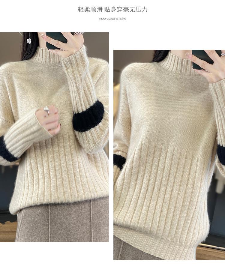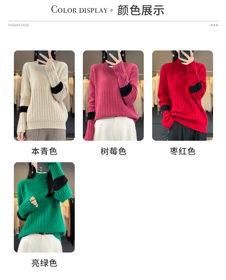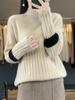 2025 Otoño/Invierno Nuevo Suéter Tejido de Lana Pura de Cuello Medio Alto Manga Larga para Mujer Color Block Acanalado Jersey Capa Base Top