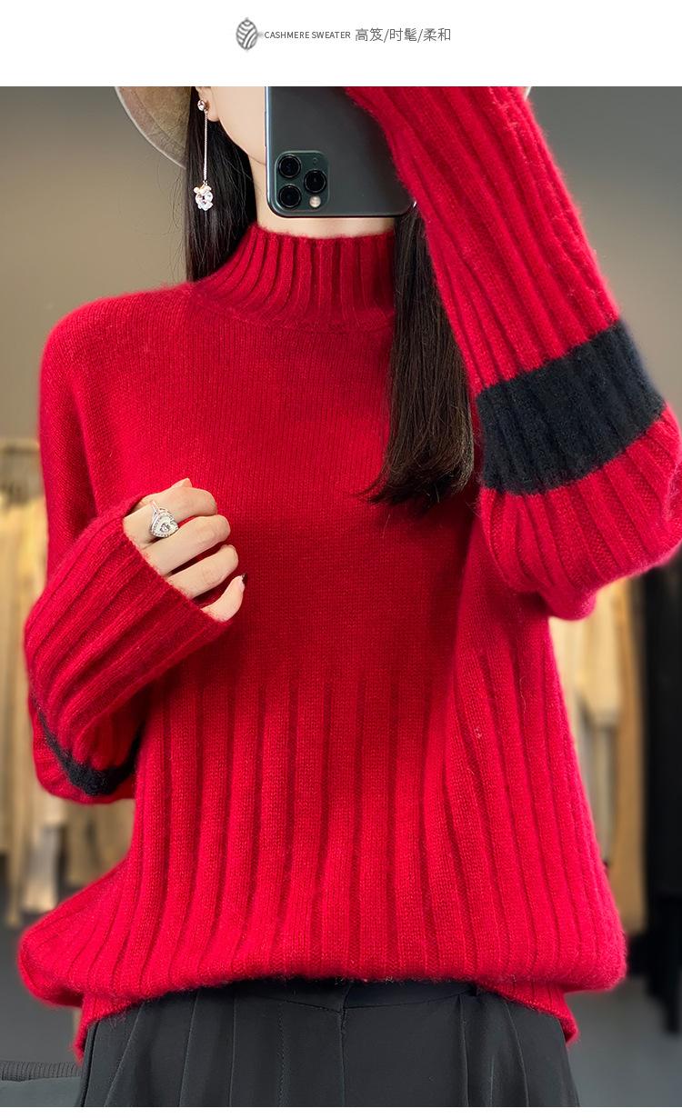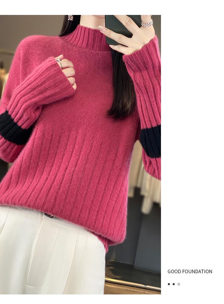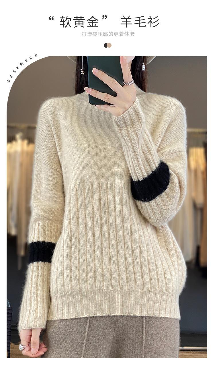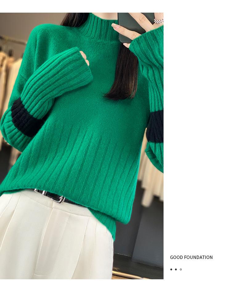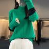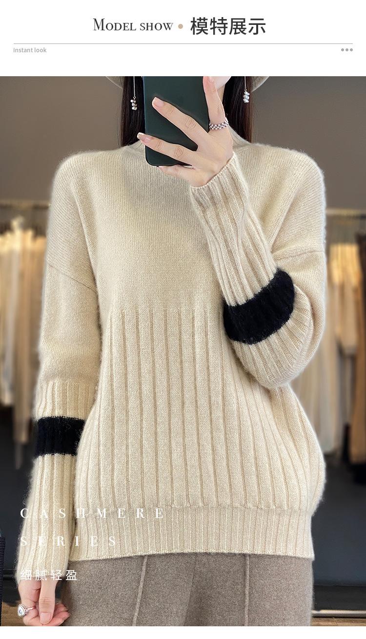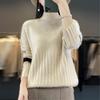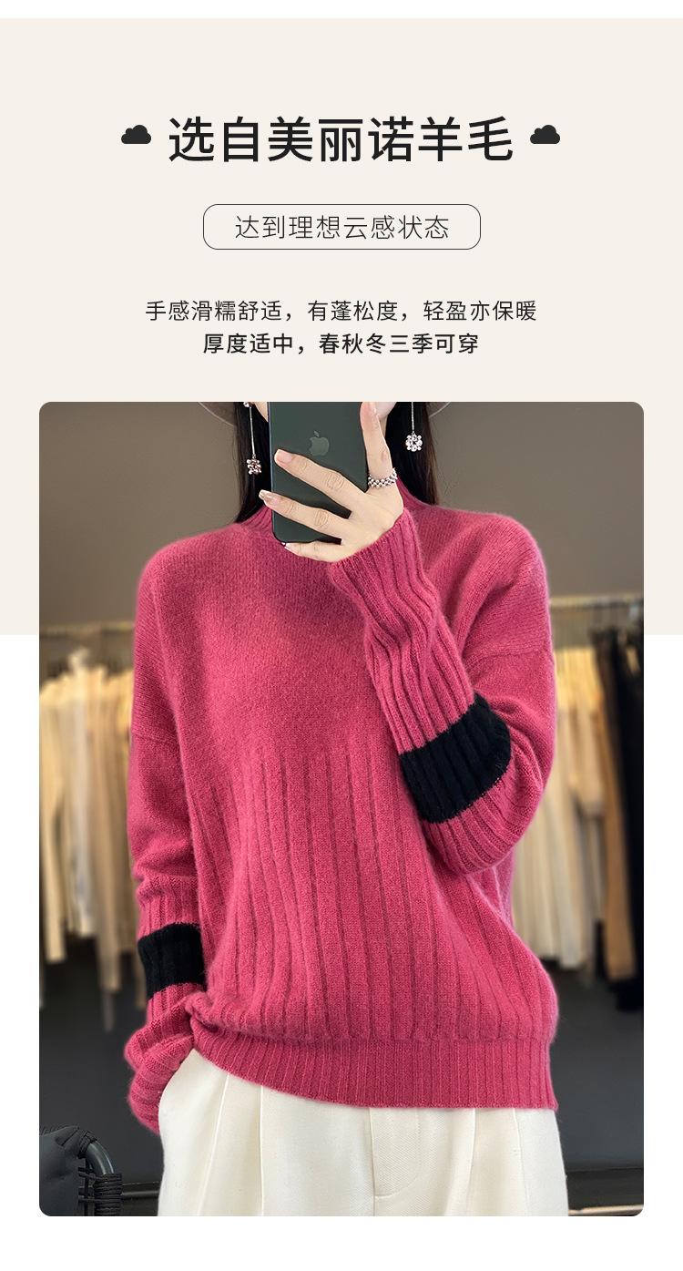 2025 Otoño/Invierno Nuevo Suéter Tejido de Lana Pura de Cuello Medio Alto Manga Larga para Mujer Color Block Acanalado Jersey Capa Base Top