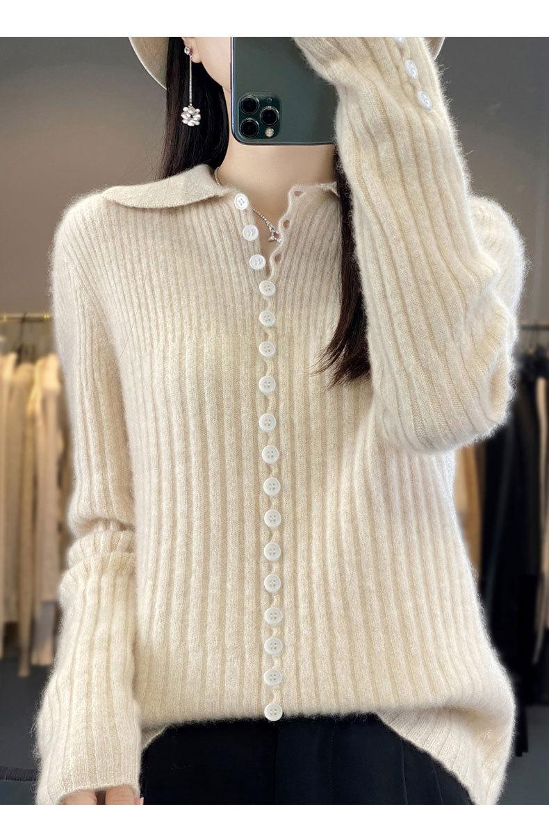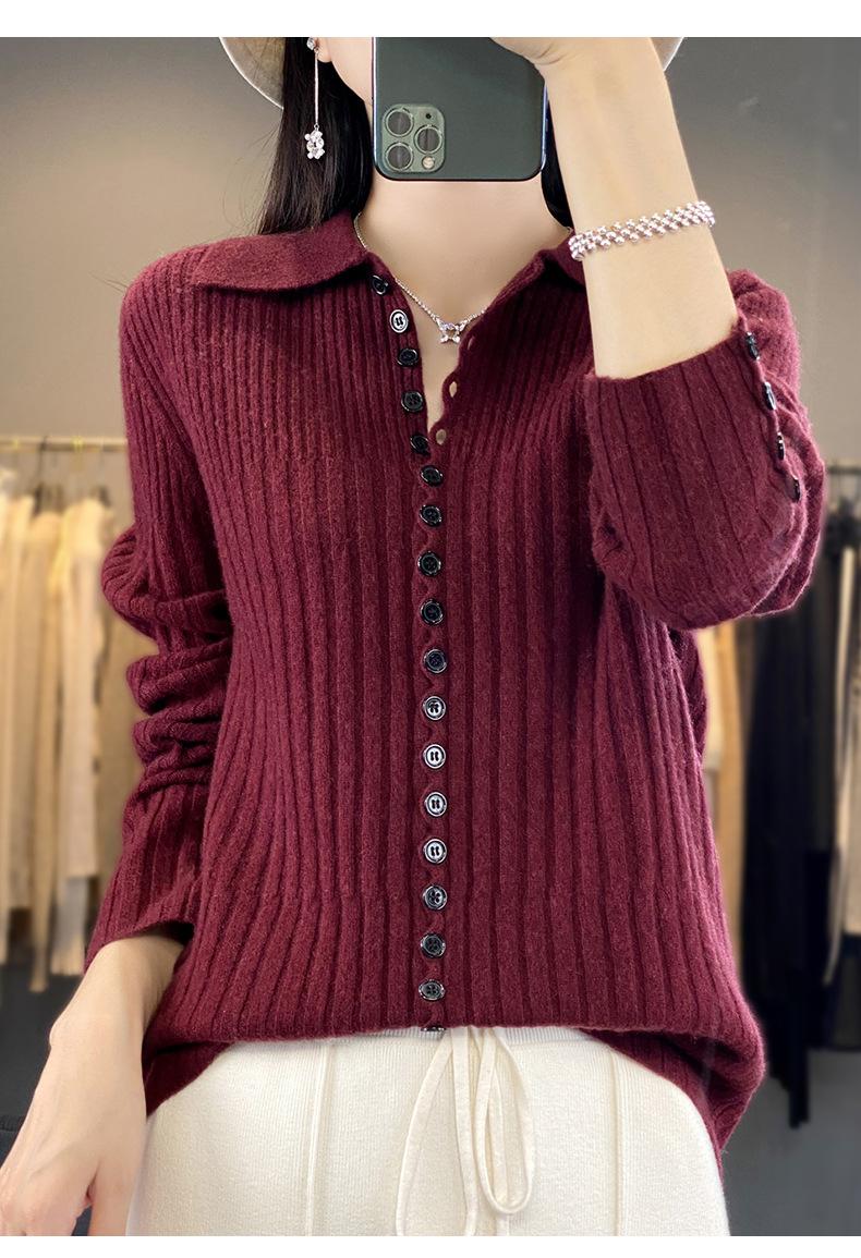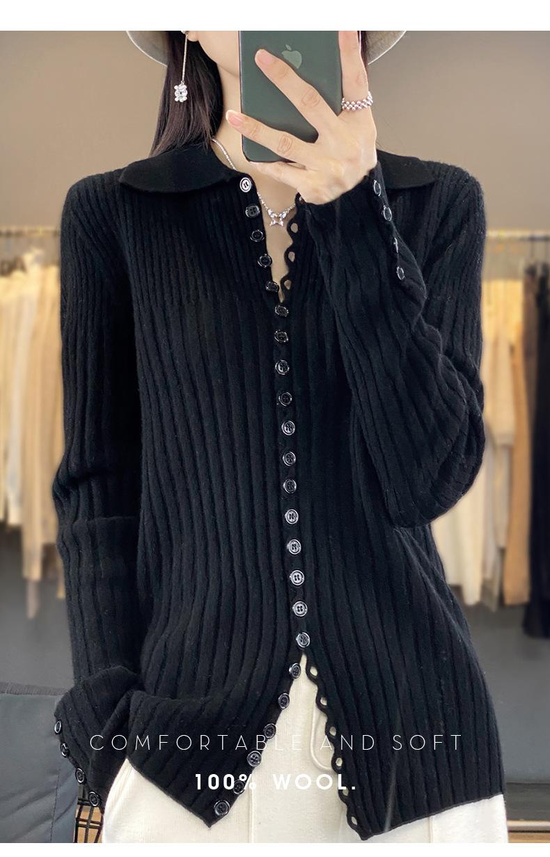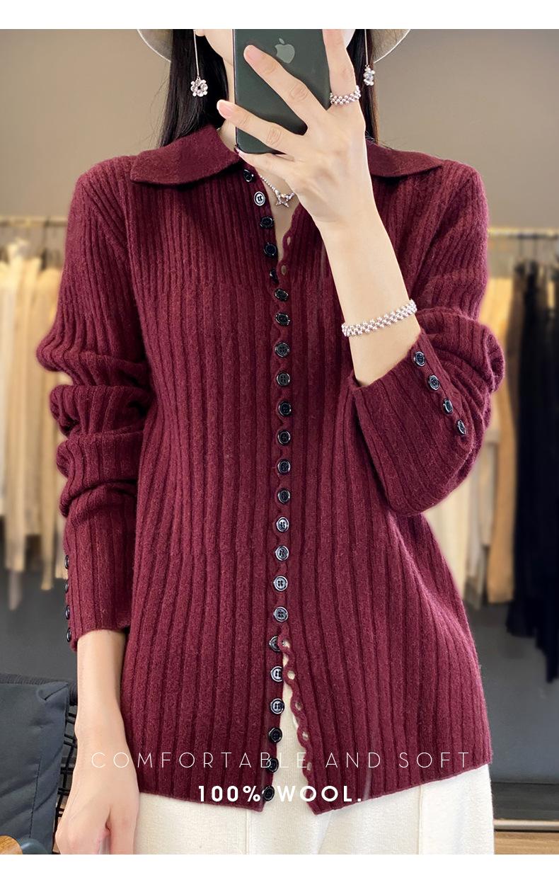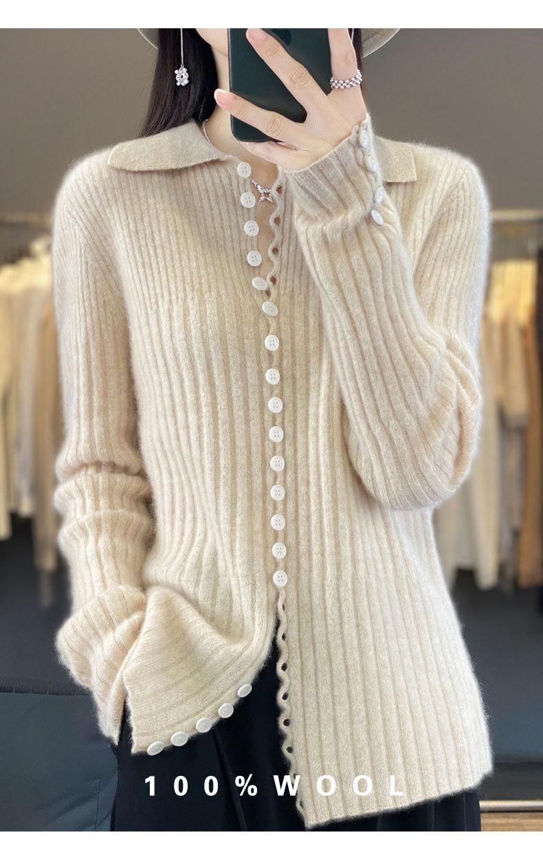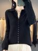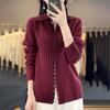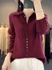 Cárdigan de Punto de Lana Pura con Solapa Nuevo 2025 para Mujer Corte Slim Acanalado Color Sólido Temperamento Manga Larga Suave con Botones Prendas de Exterior