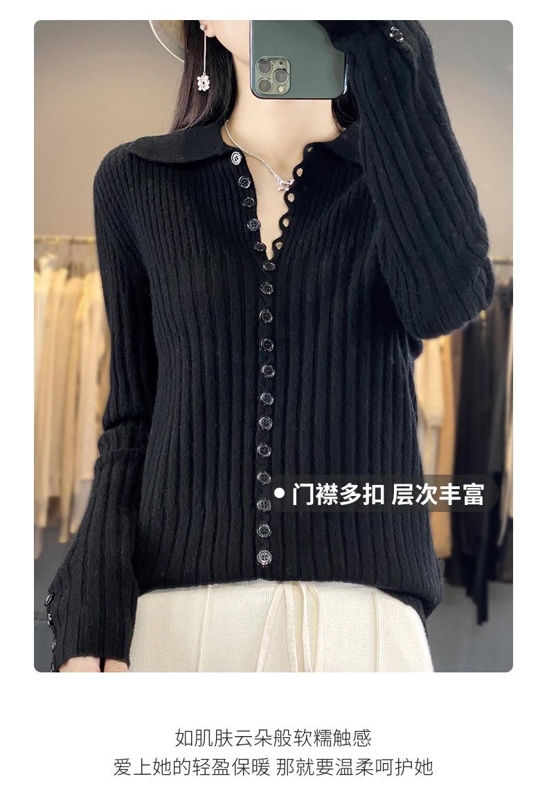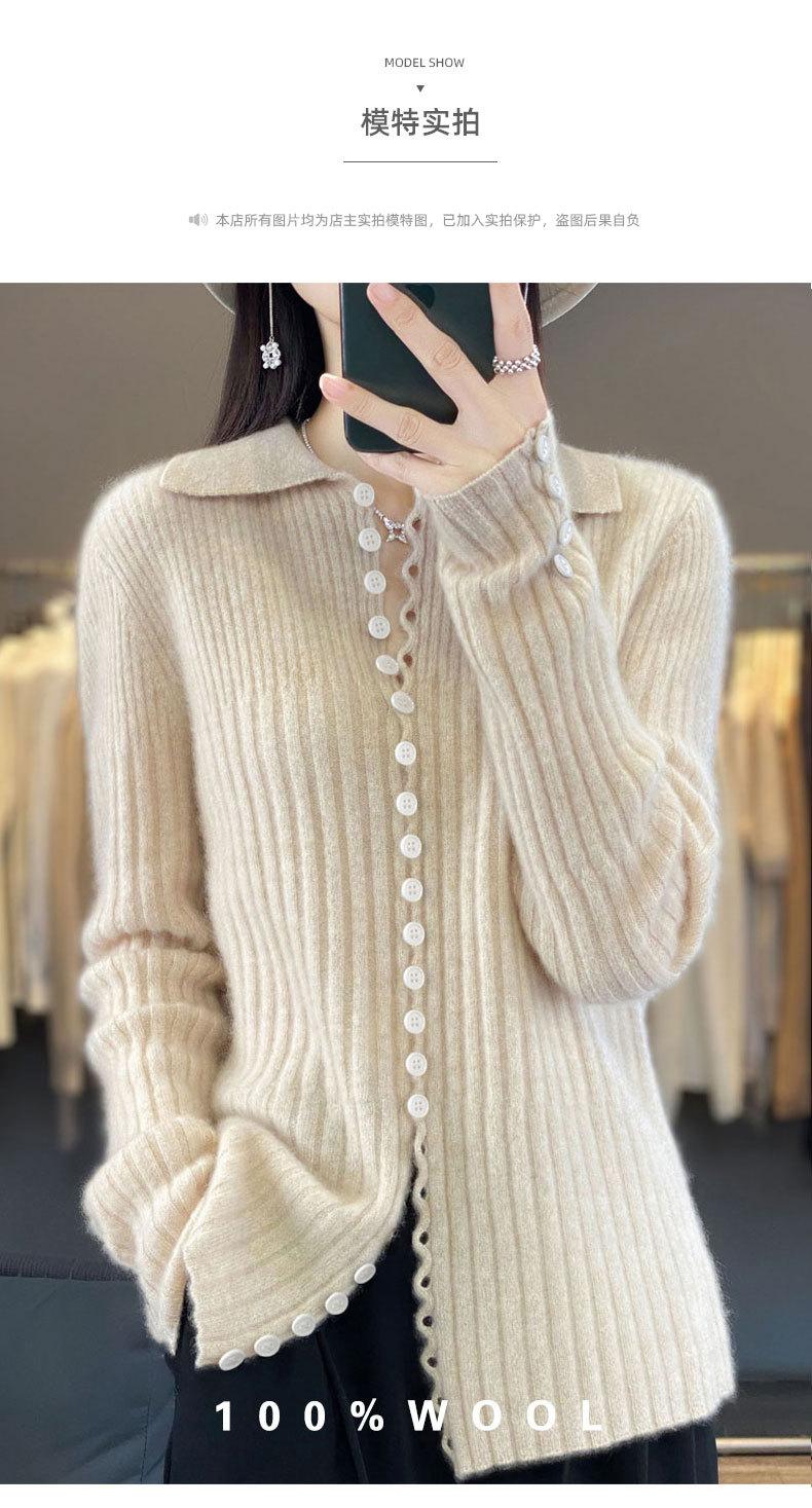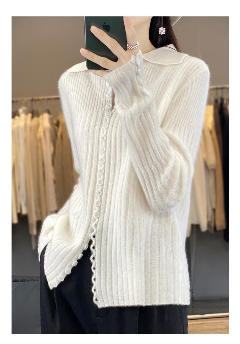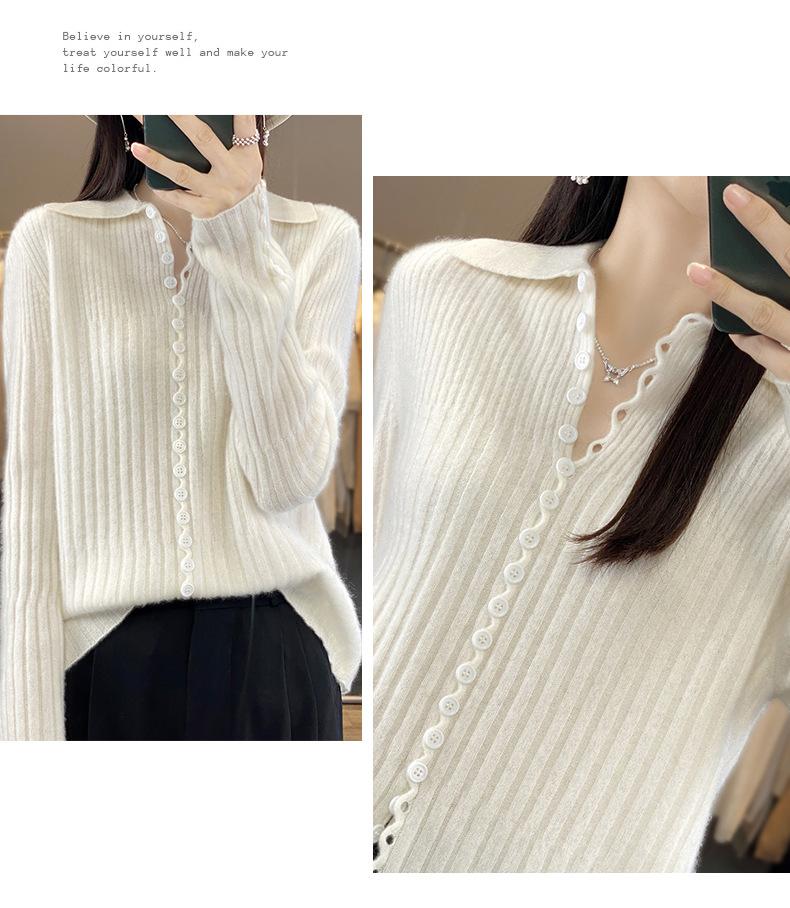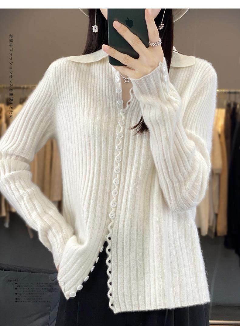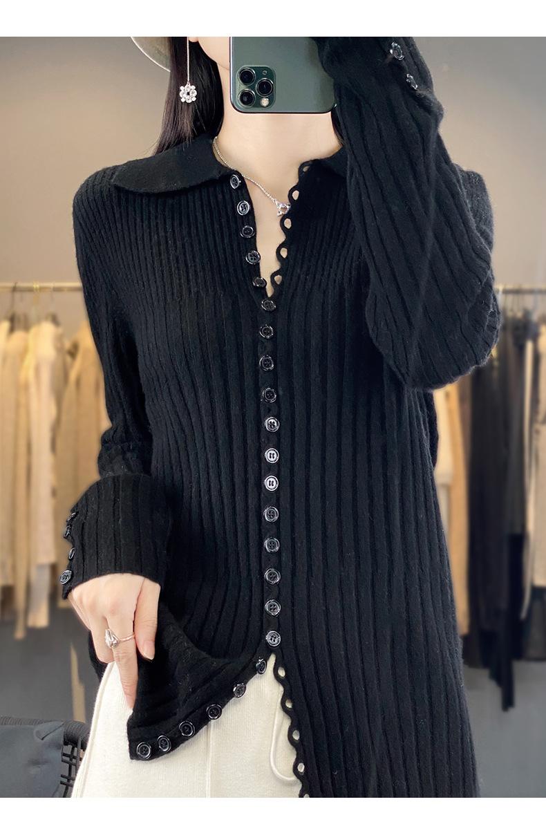Cárdigan de Punto de Lana Pura con Solapa Nuevo 2025 para Mujer Corte Slim Acanalado Color Sólido Temperamento Manga Larga Suave con Botones Prendas de Exterior