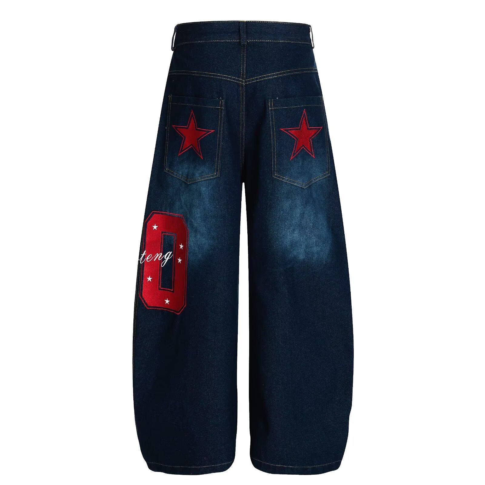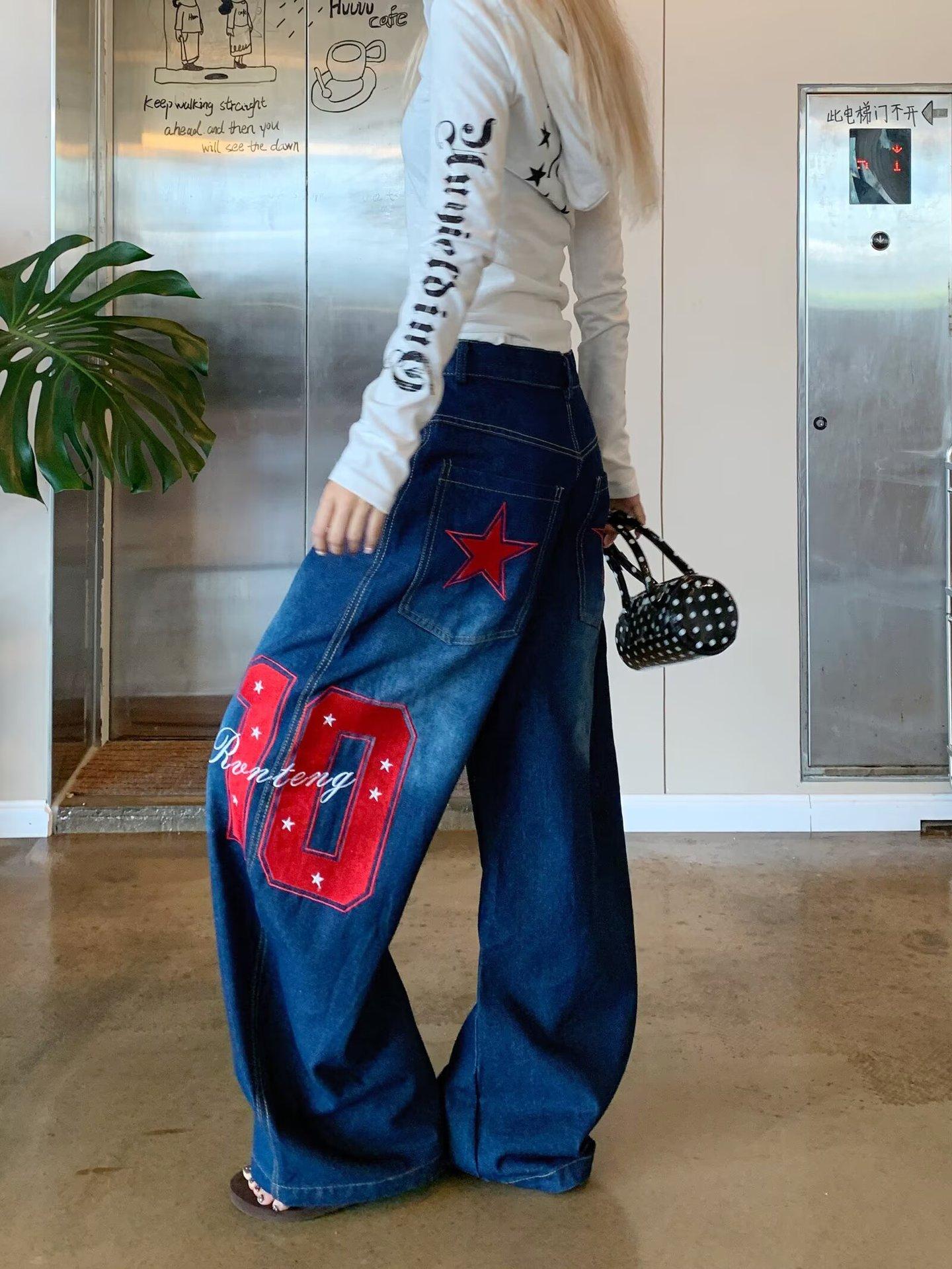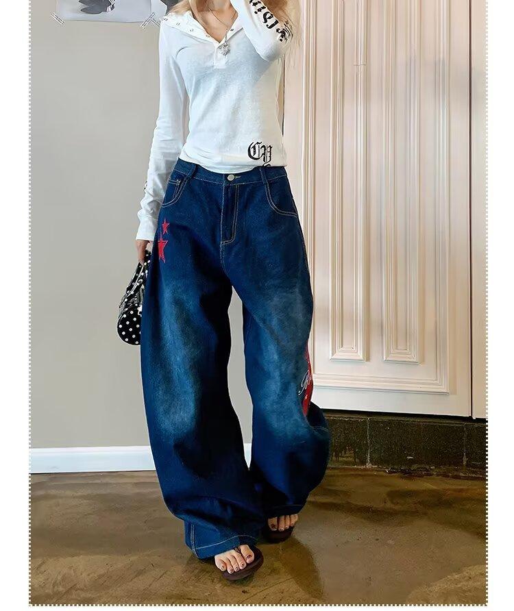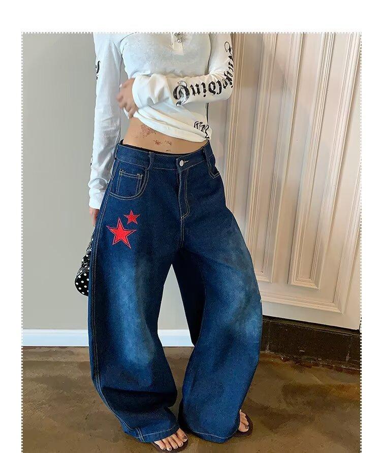 Jeans holgados de pierna recta, estilo callejero, de pierna ancha, retro americano, bordado de estrella, desgastados, tipo cimitarra, para hombre y mujer, pareja