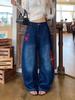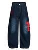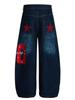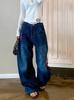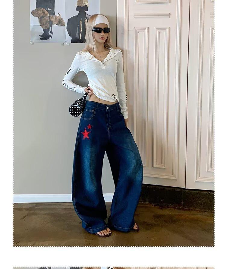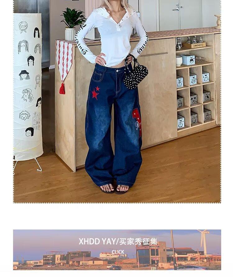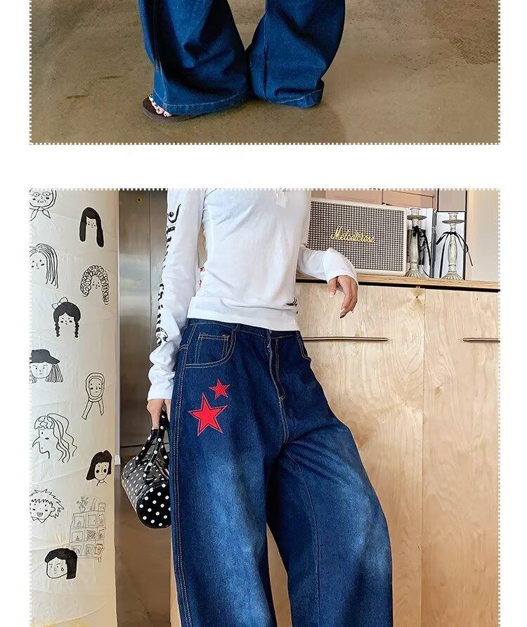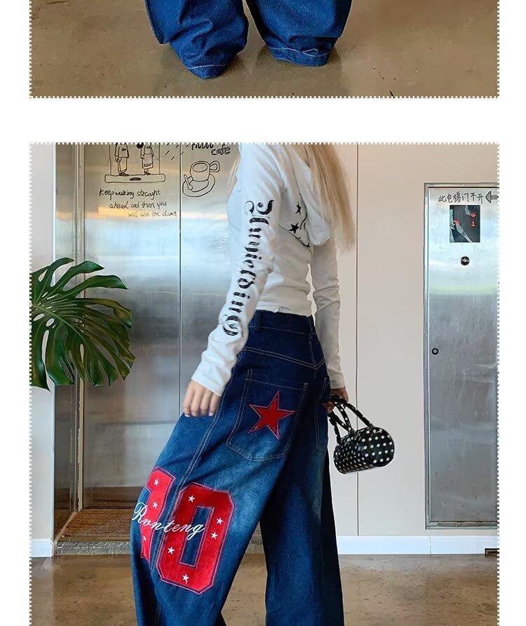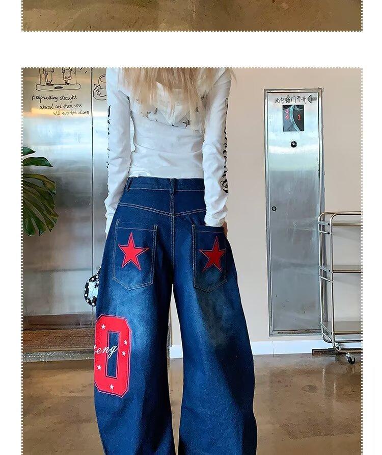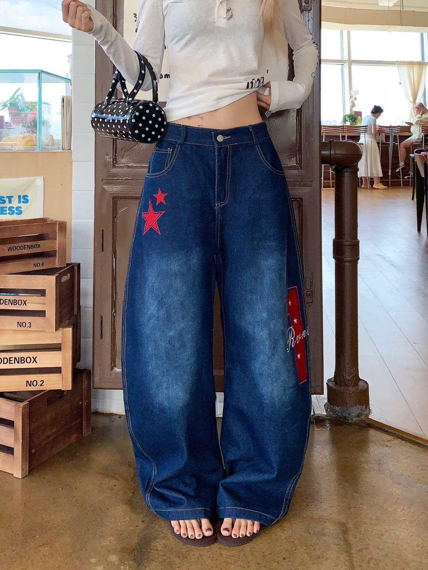 Jeans holgados de pierna recta, estilo callejero, de pierna ancha, retro americano, bordado de estrella, desgastados, tipo cimitarra, para hombre y mujer, pareja