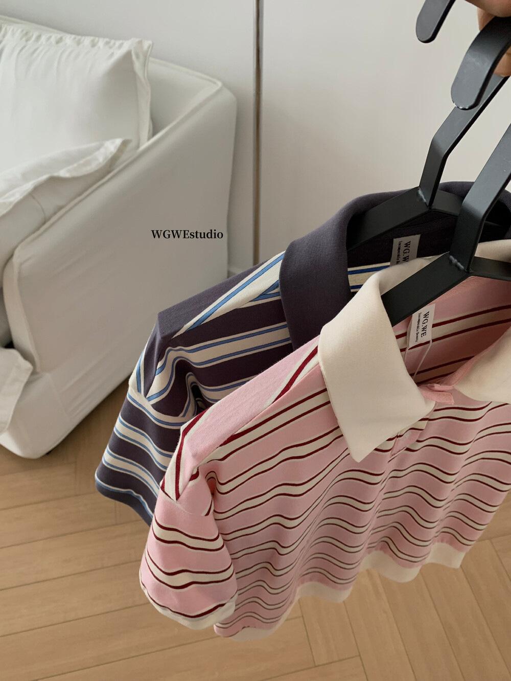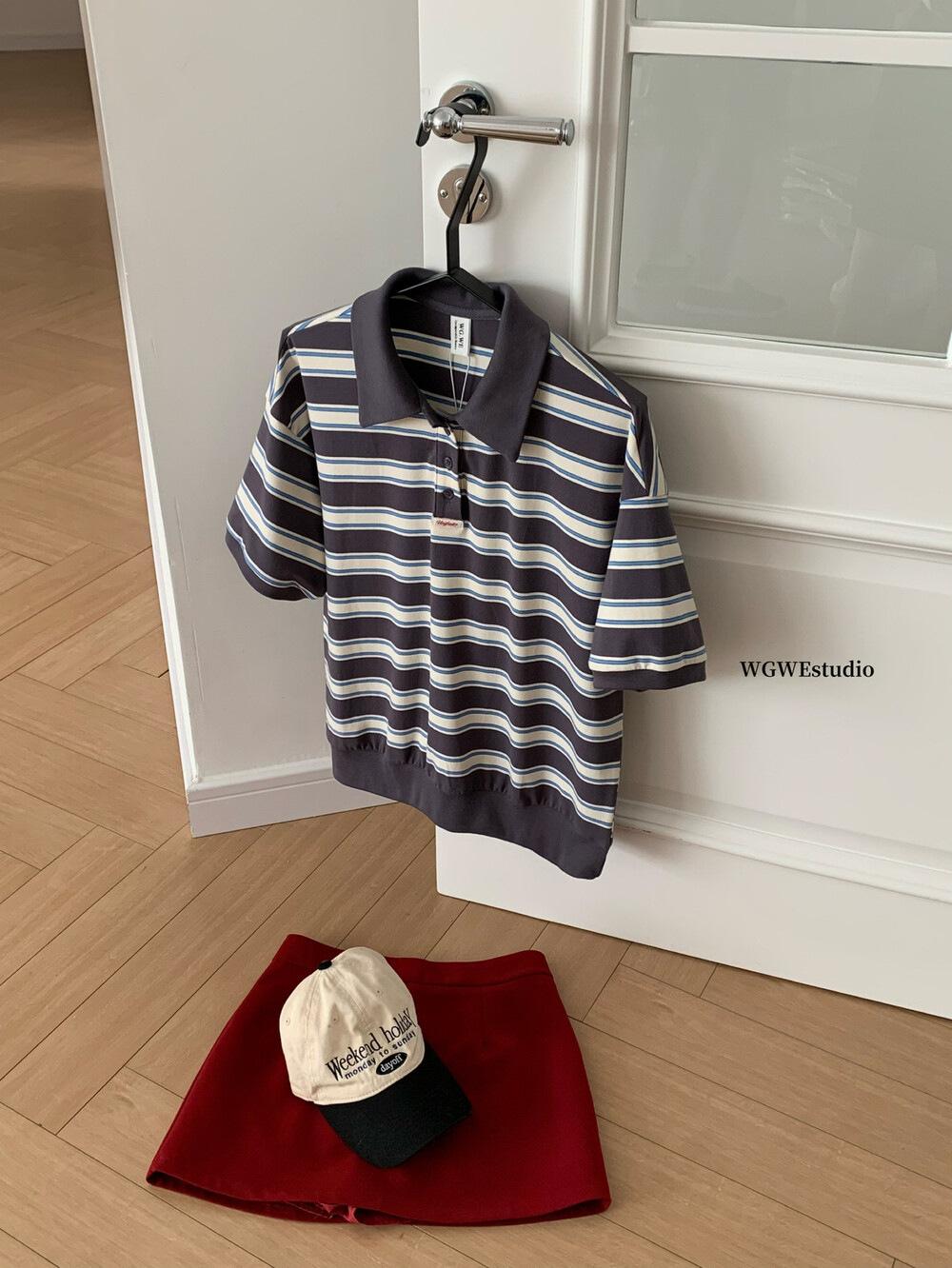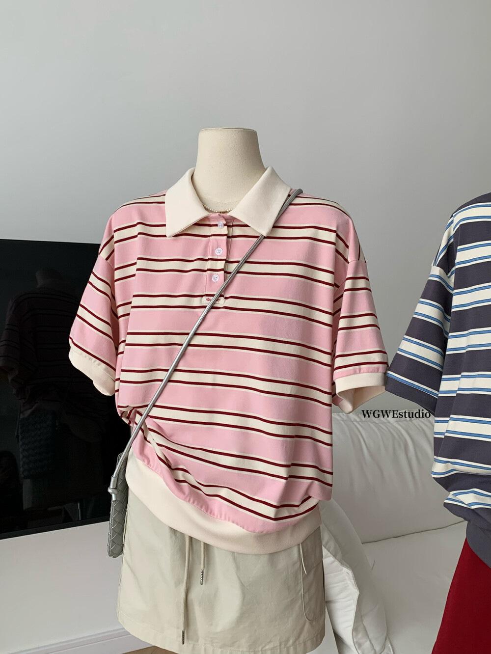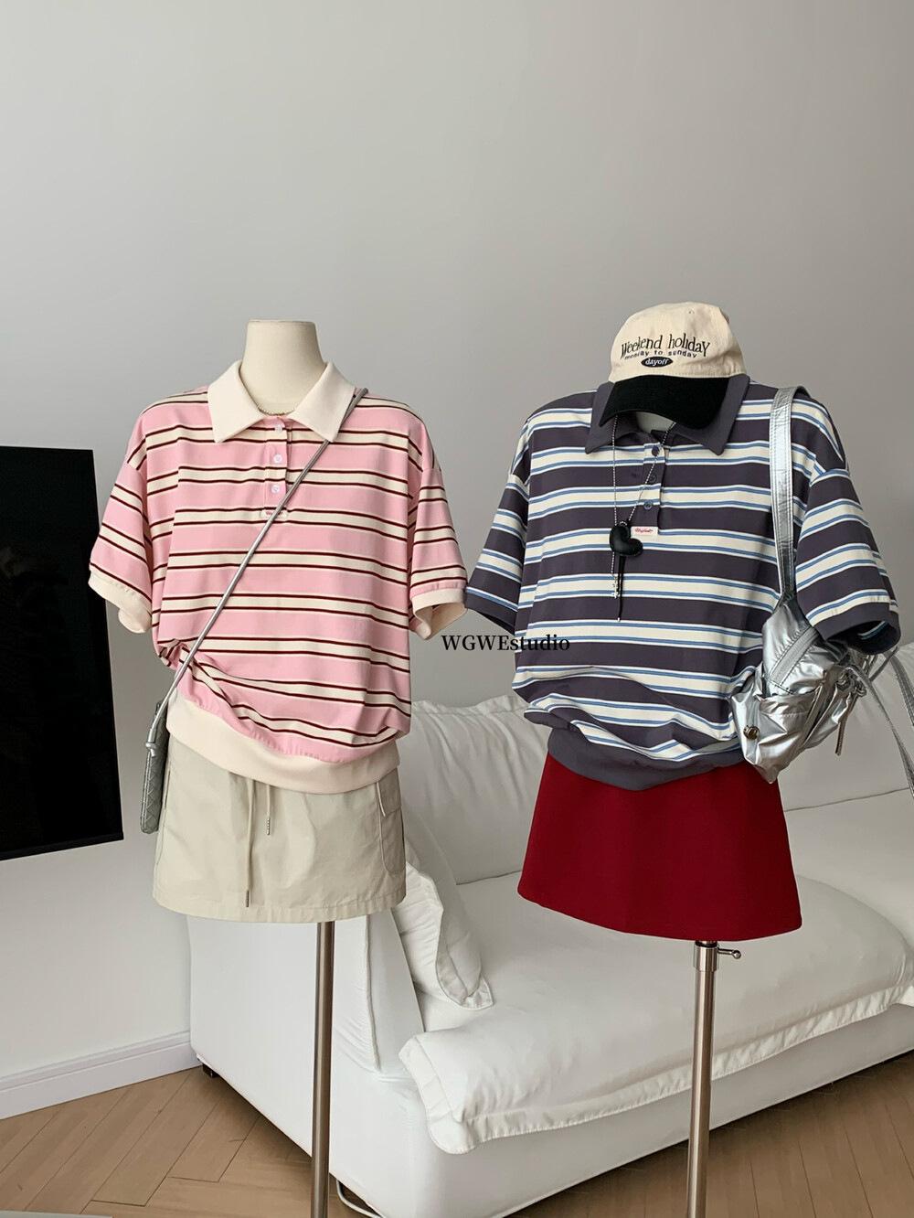 Wgwe Verano Retro Estilo Preppy Rayas Contrastantes Reductor de Edad Casual Versátil Look Adelgazante Camiseta de Manga Corta con Cuello Polo W6514