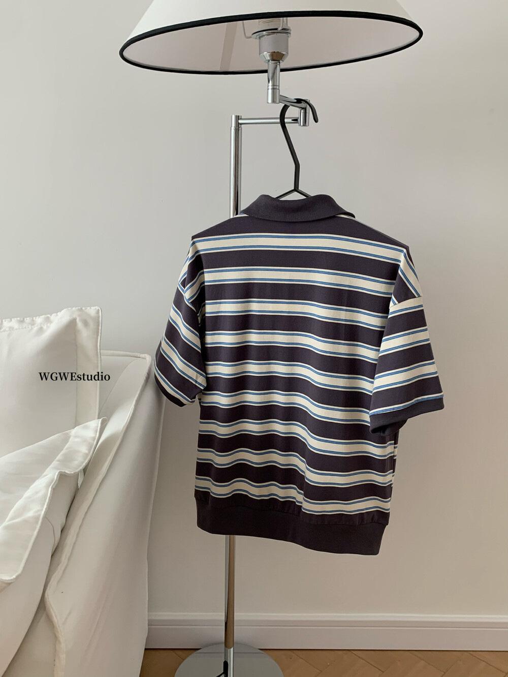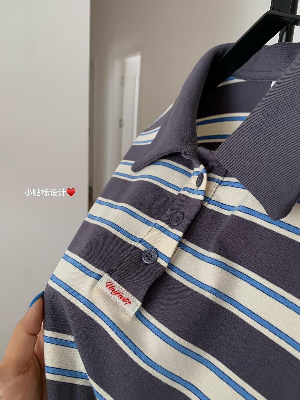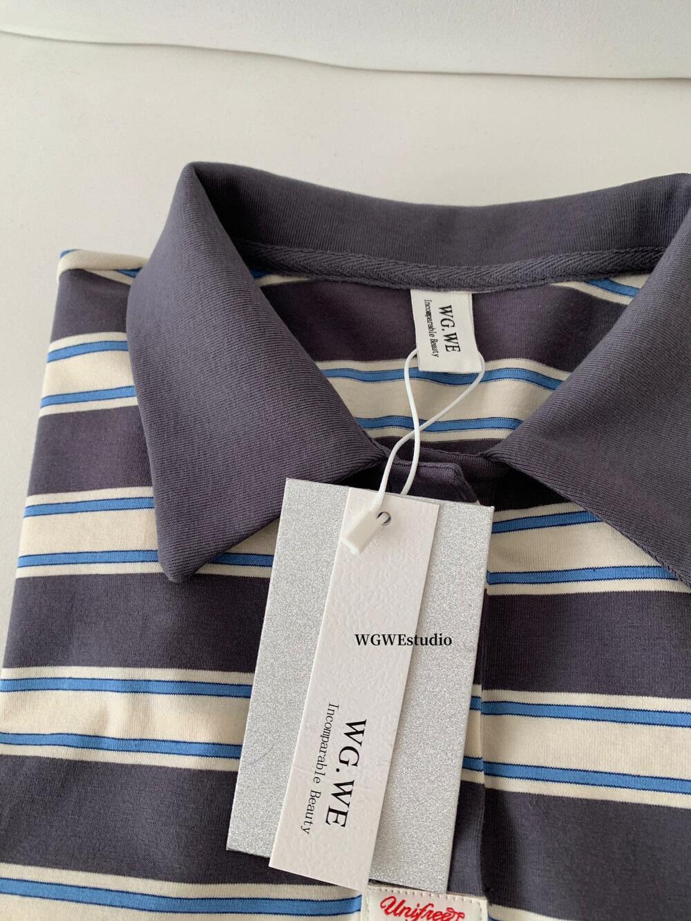 Wgwe Verano Retro Estilo Preppy Rayas Contrastantes Reductor de Edad Casual Versátil Look Adelgazante Camiseta de Manga Corta con Cuello Polo W6514