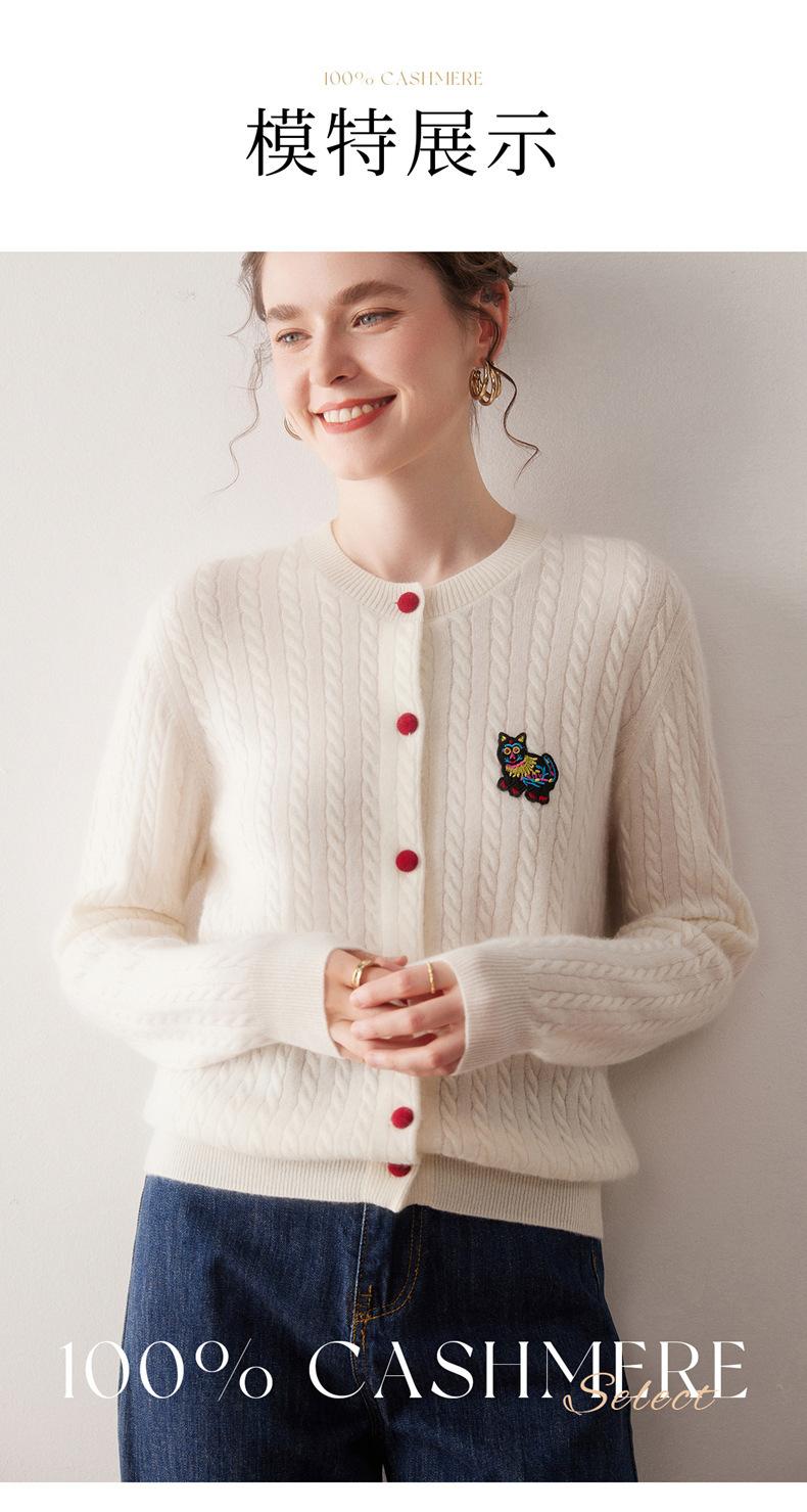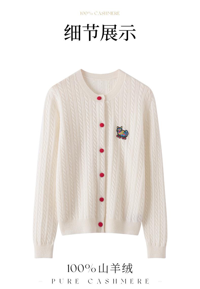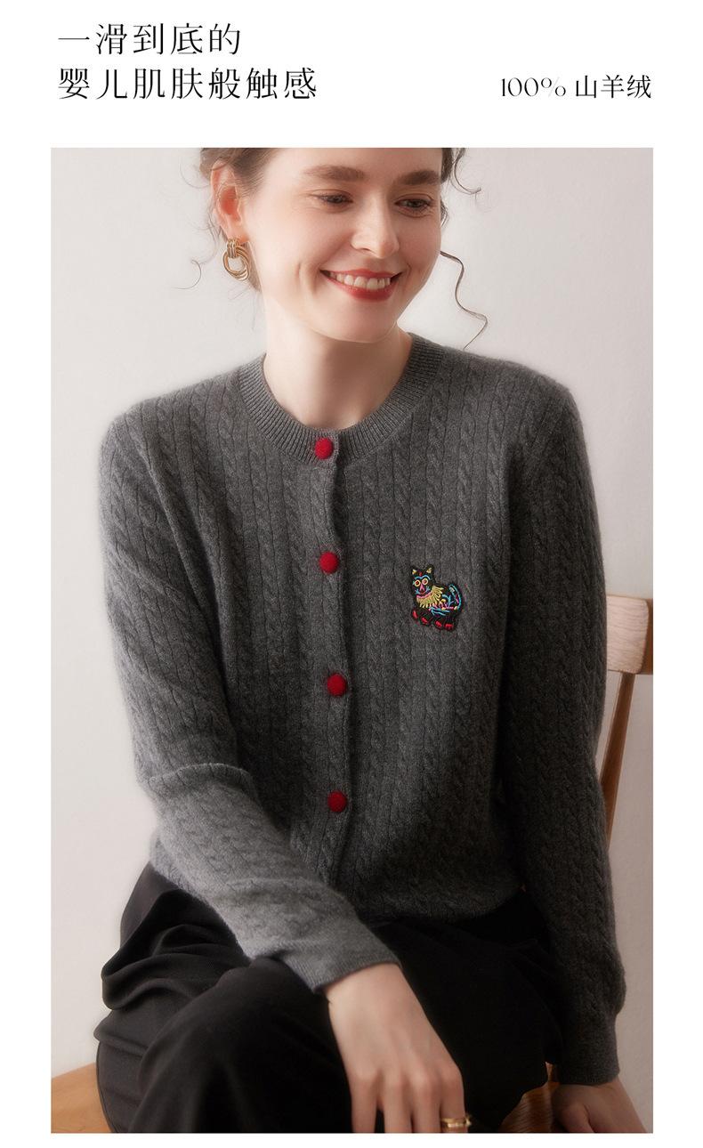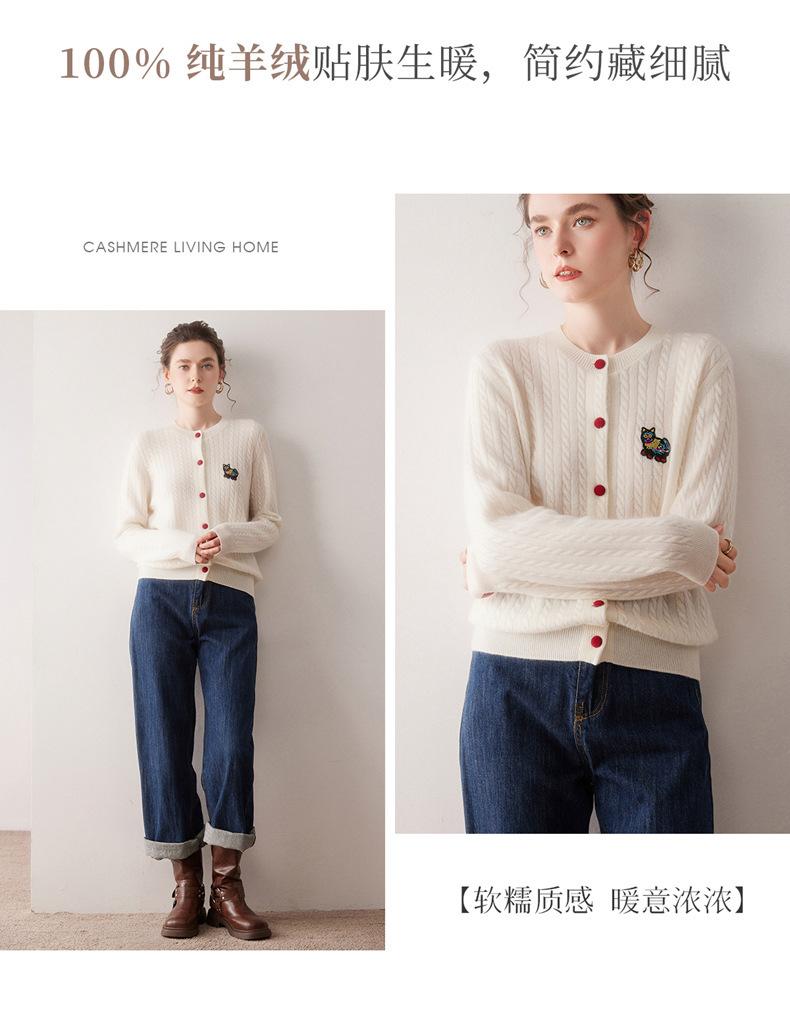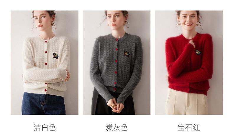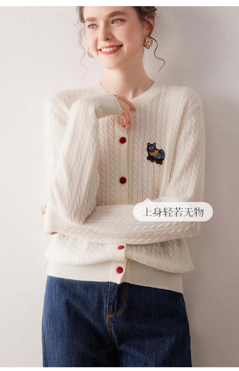 Suéter de Cachemira Pura para Mujer Otoño e Invierno Nuevo Cuello Redondo Manga Larga Cárdigan Suéter Tejido Abrigo Diseño Bordado Pesado Suéter Tejido de Cable