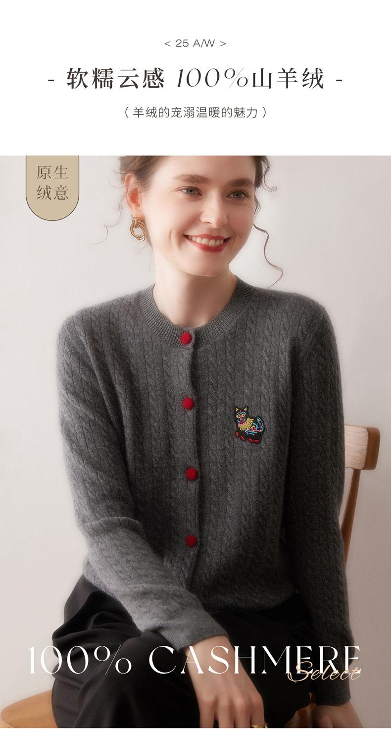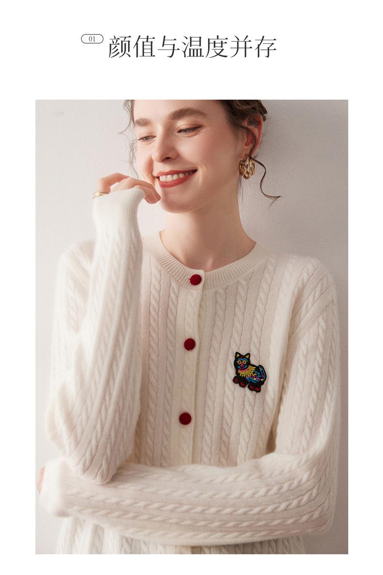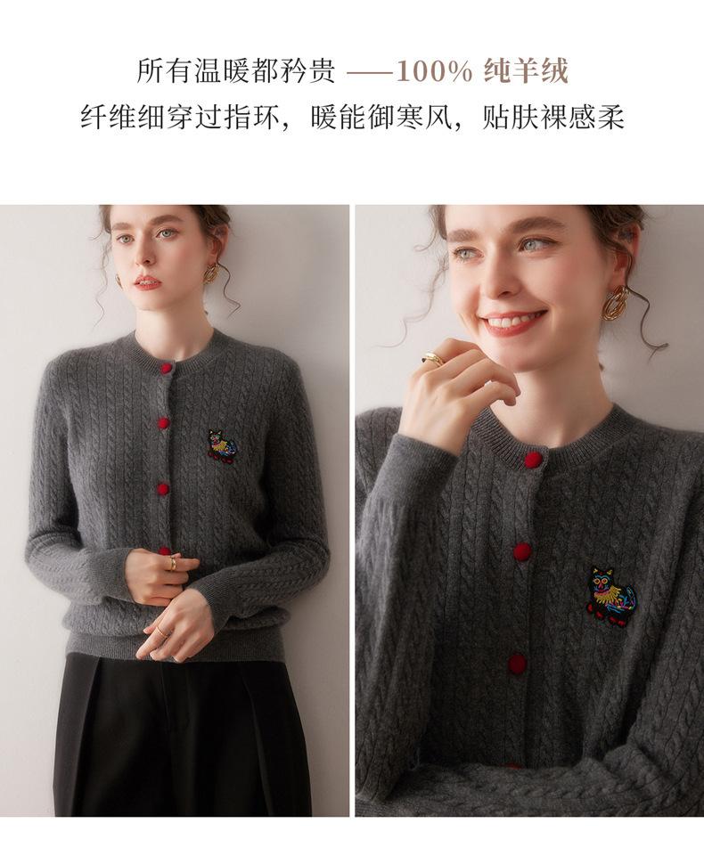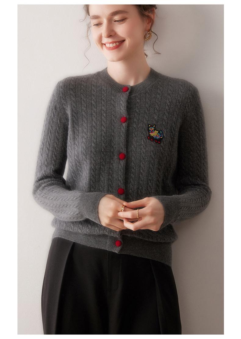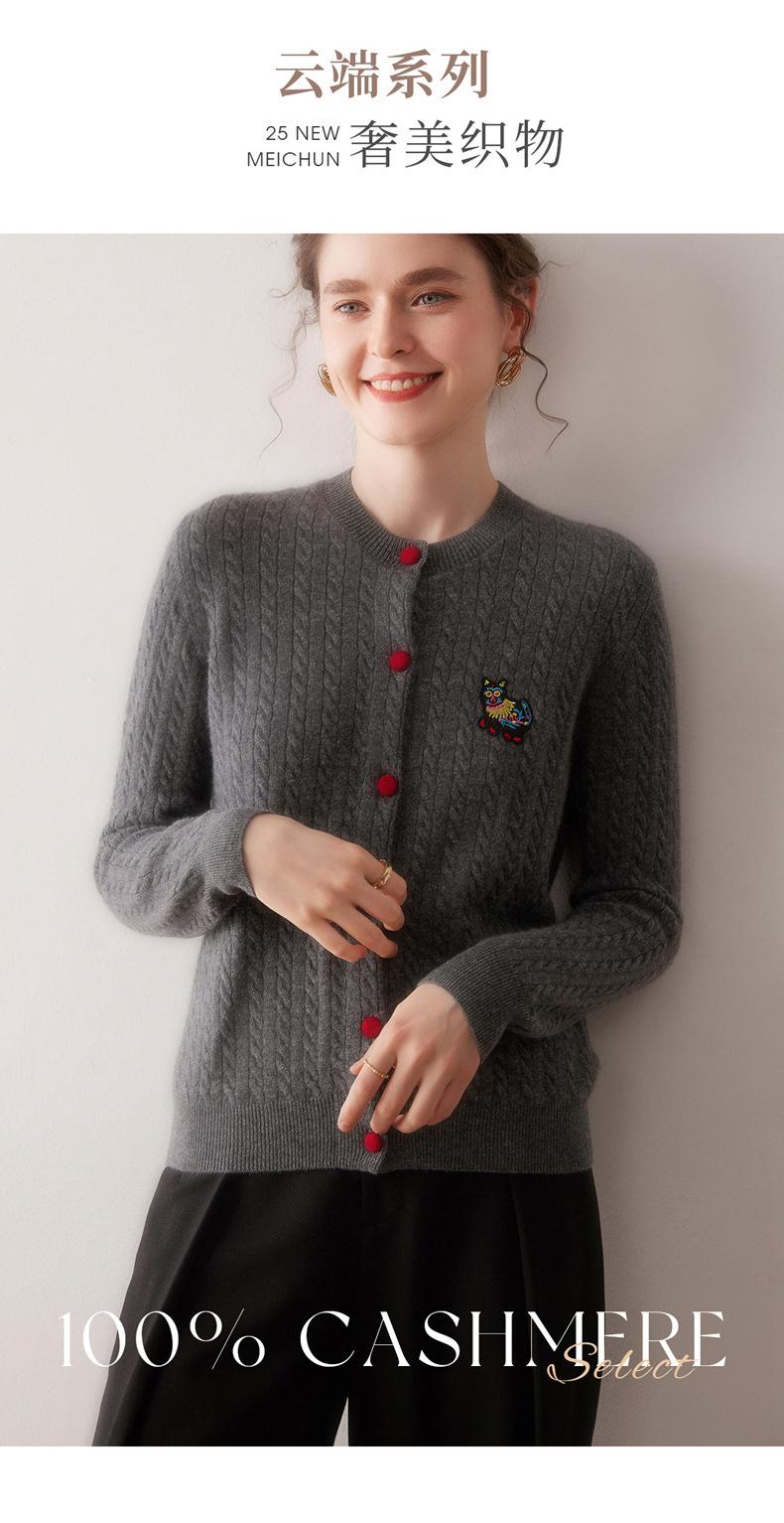 Suéter de Cachemira Pura para Mujer Otoño e Invierno Nuevo Cuello Redondo Manga Larga Cárdigan Suéter Tejido Abrigo Diseño Bordado Pesado Suéter Tejido de Cable