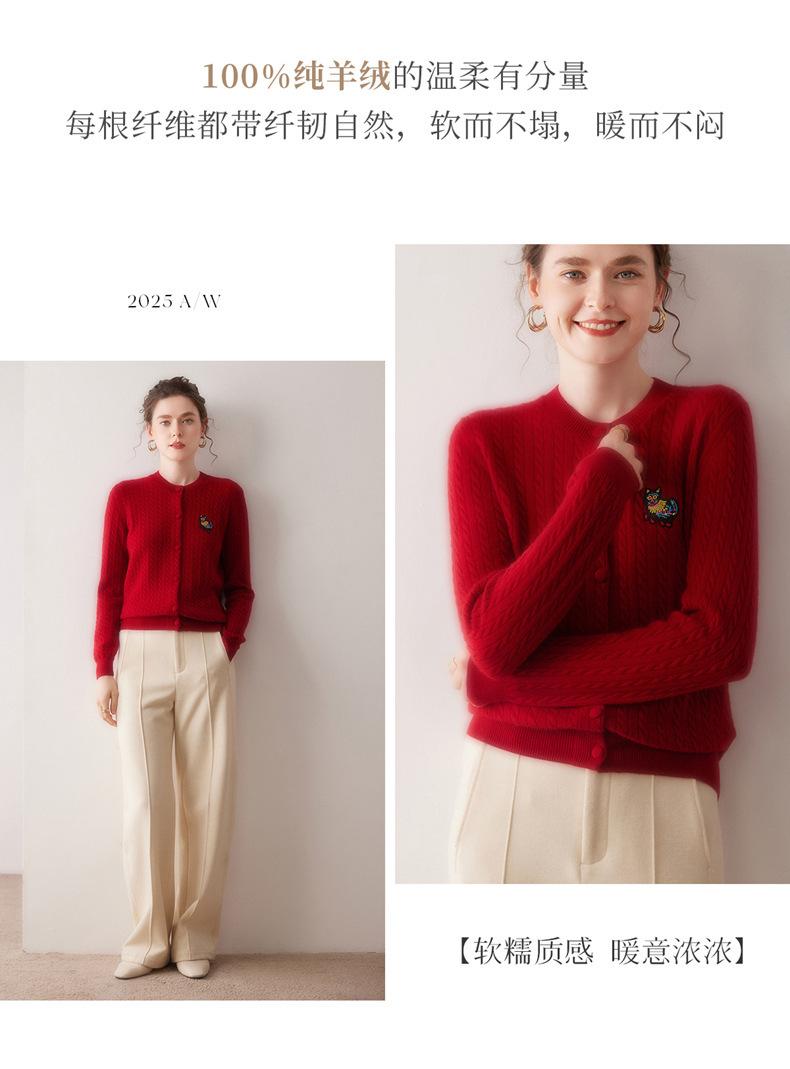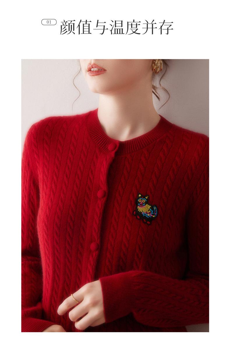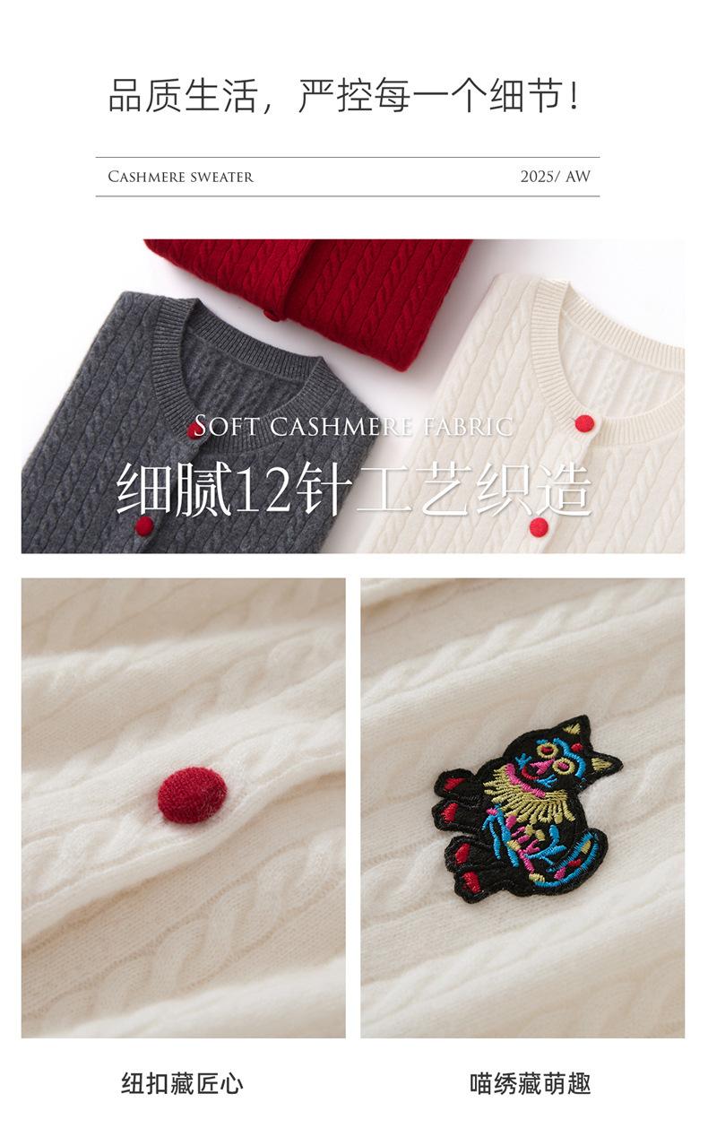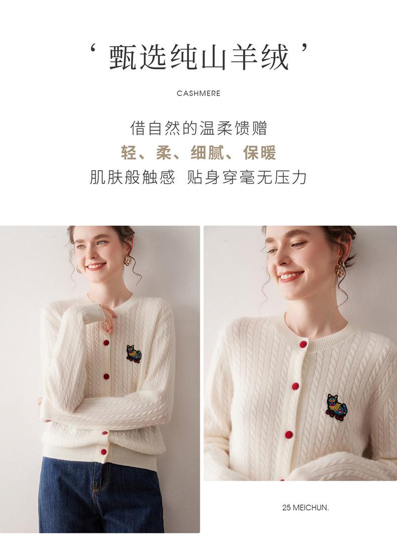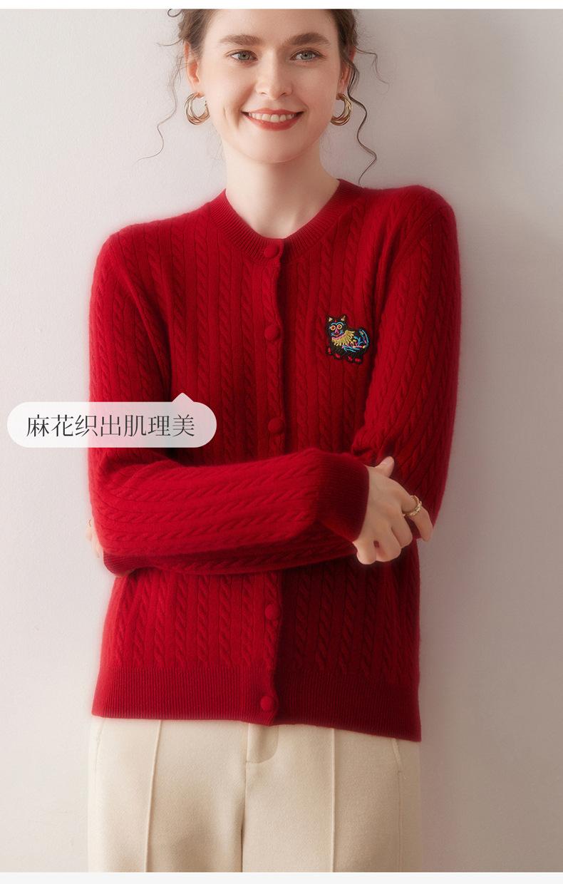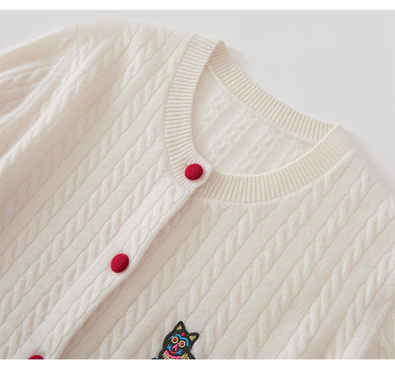 Suéter de Cachemira Pura para Mujer Otoño e Invierno Nuevo Cuello Redondo Manga Larga Cárdigan Suéter Tejido Abrigo Diseño Bordado Pesado Suéter Tejido de Cable